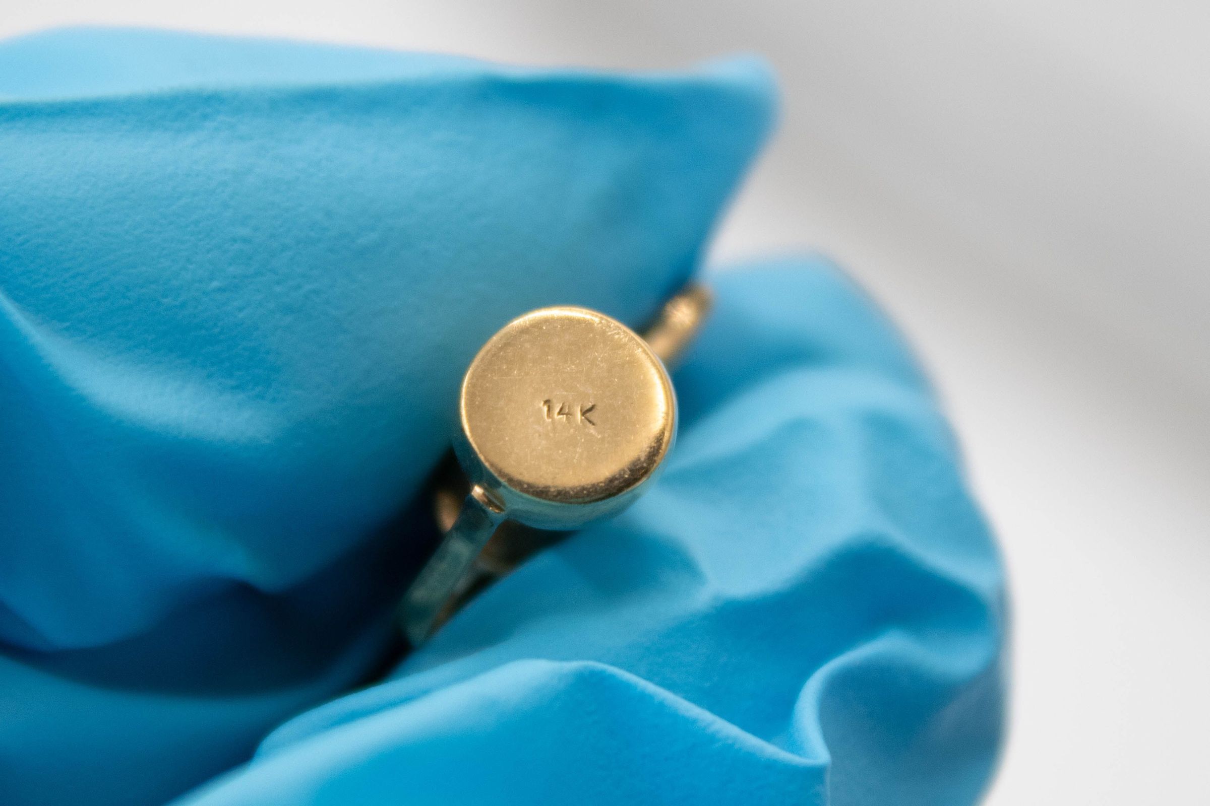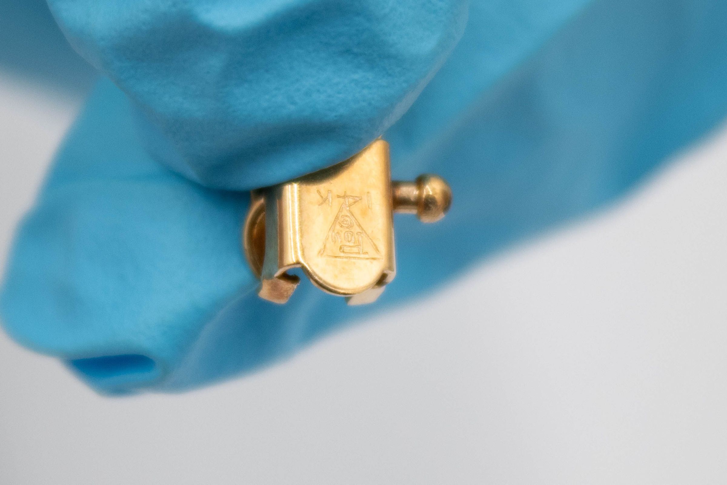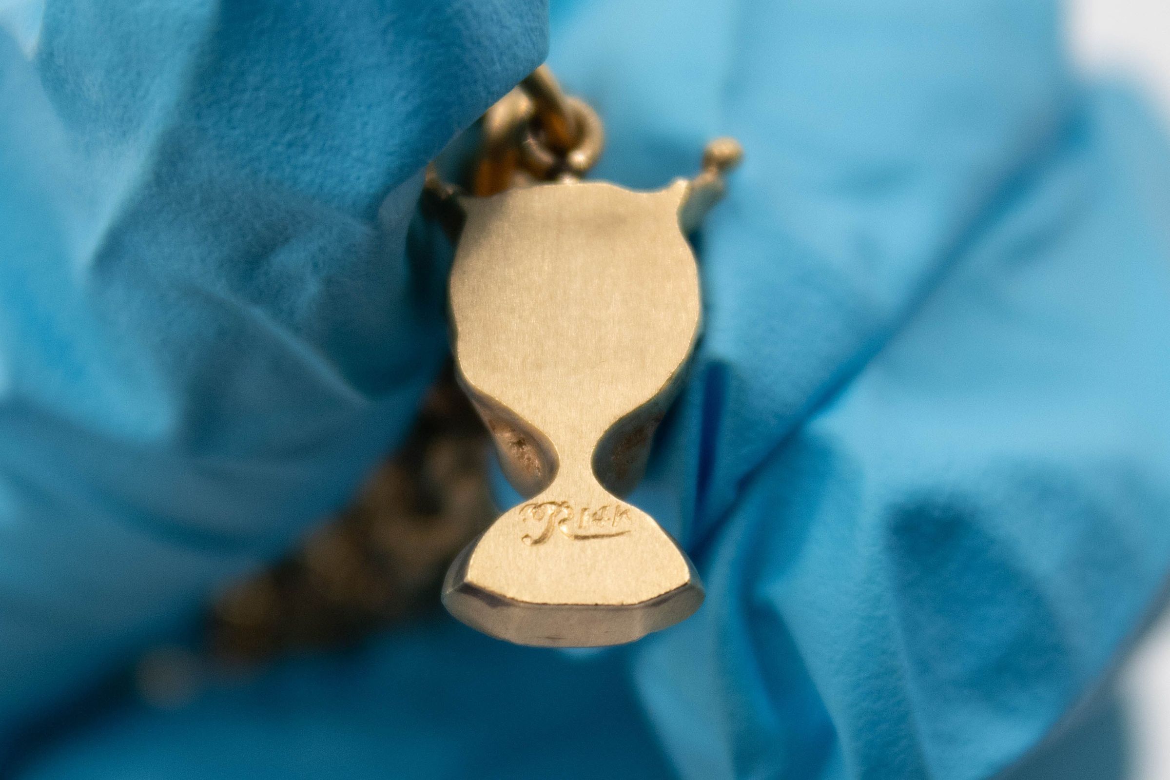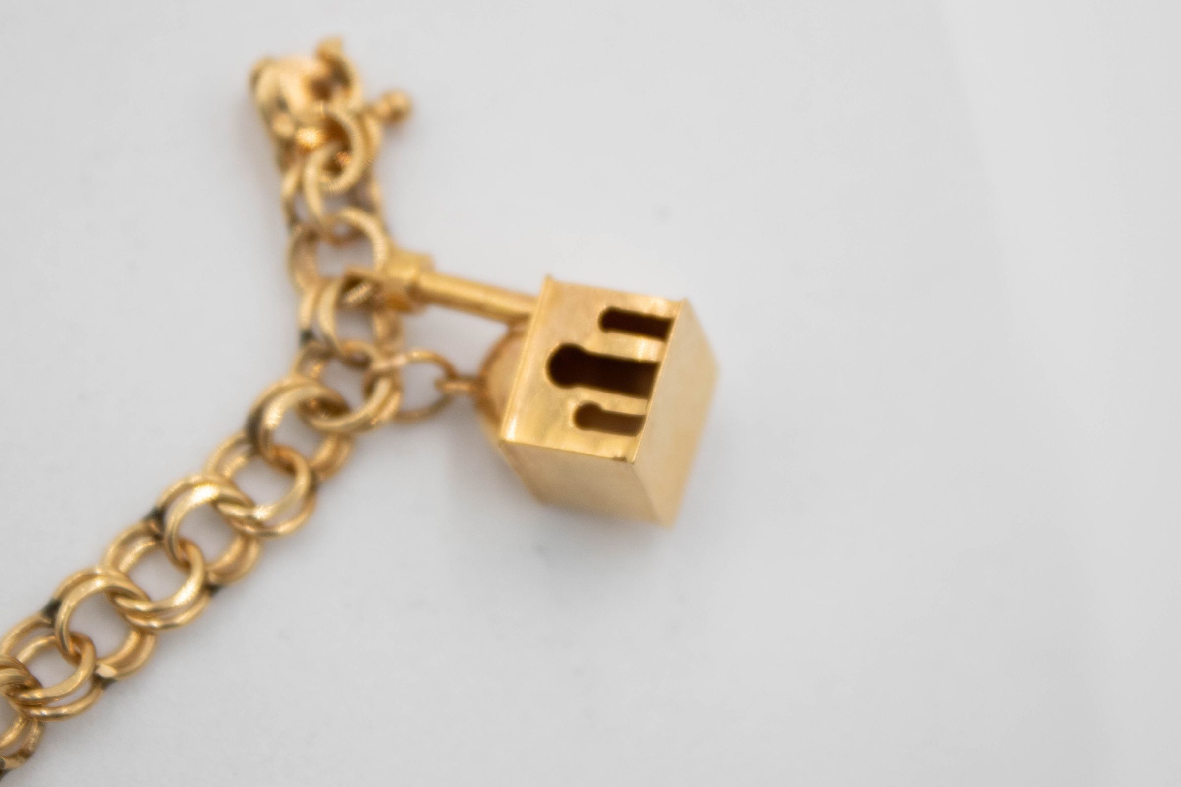 Image of the gold five-charm bracelet on gold chain. There is a book charm with Arabic script, two small Arabic coffee pots, a small mosque building, and a bust of a boy with a crown and blue gem eyes. The two coffee pot charms are earrings and still have the mechanisms attached to hang them. The bracelet bracelet is Texas barbed wire-style and clasp is a four-leaf clove.