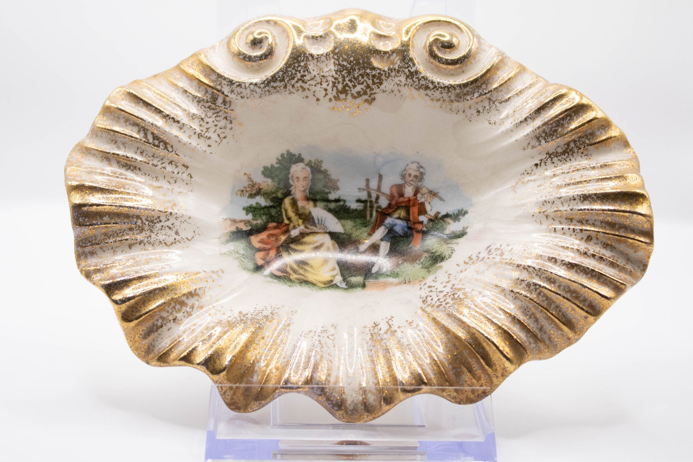 18th Century White Dish with Gold Ruffled Edge and Scene of Man and WomanEntry/Object ID