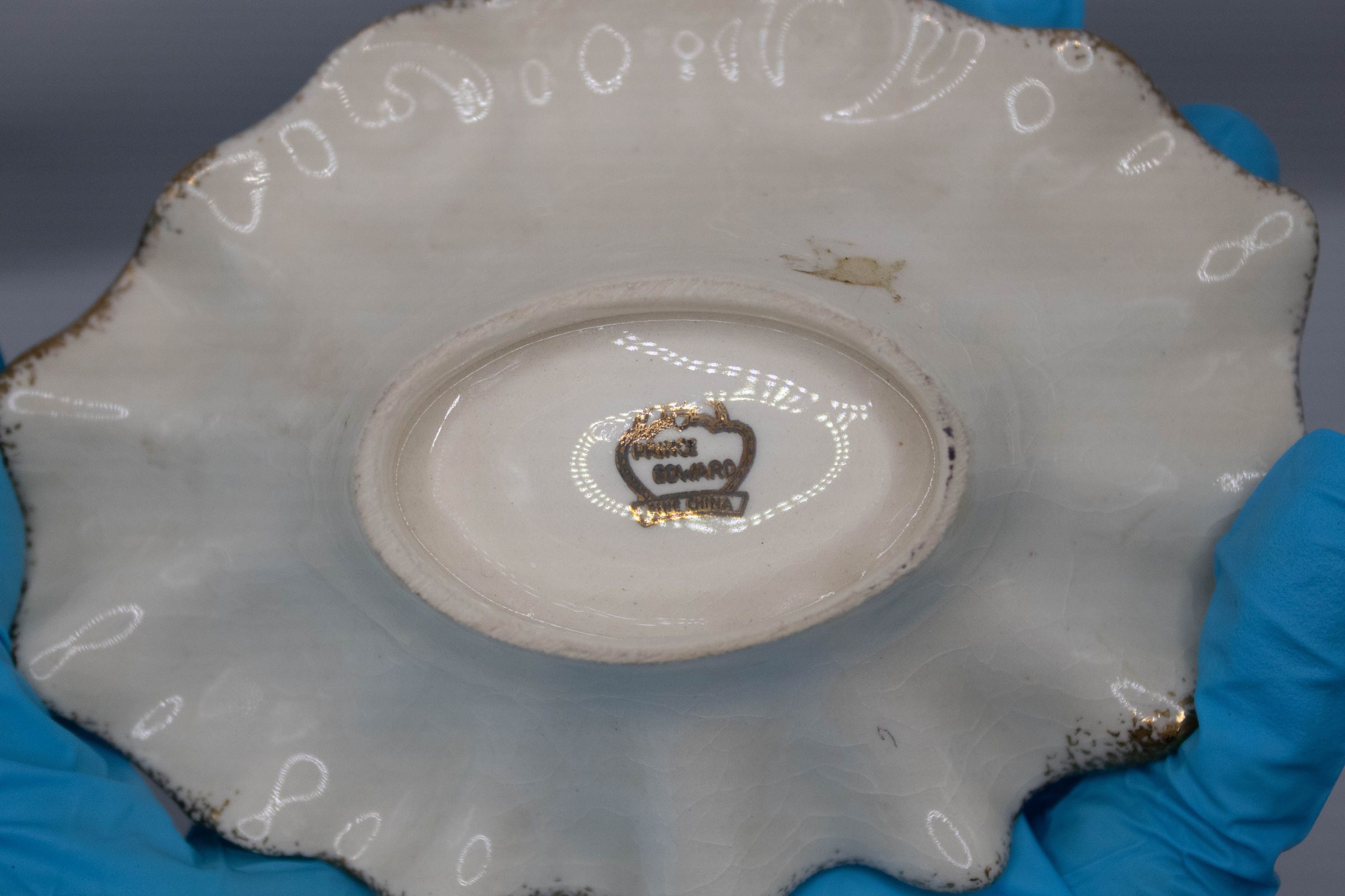 18th century white dish with gold "ruffled" edge.Made/Created