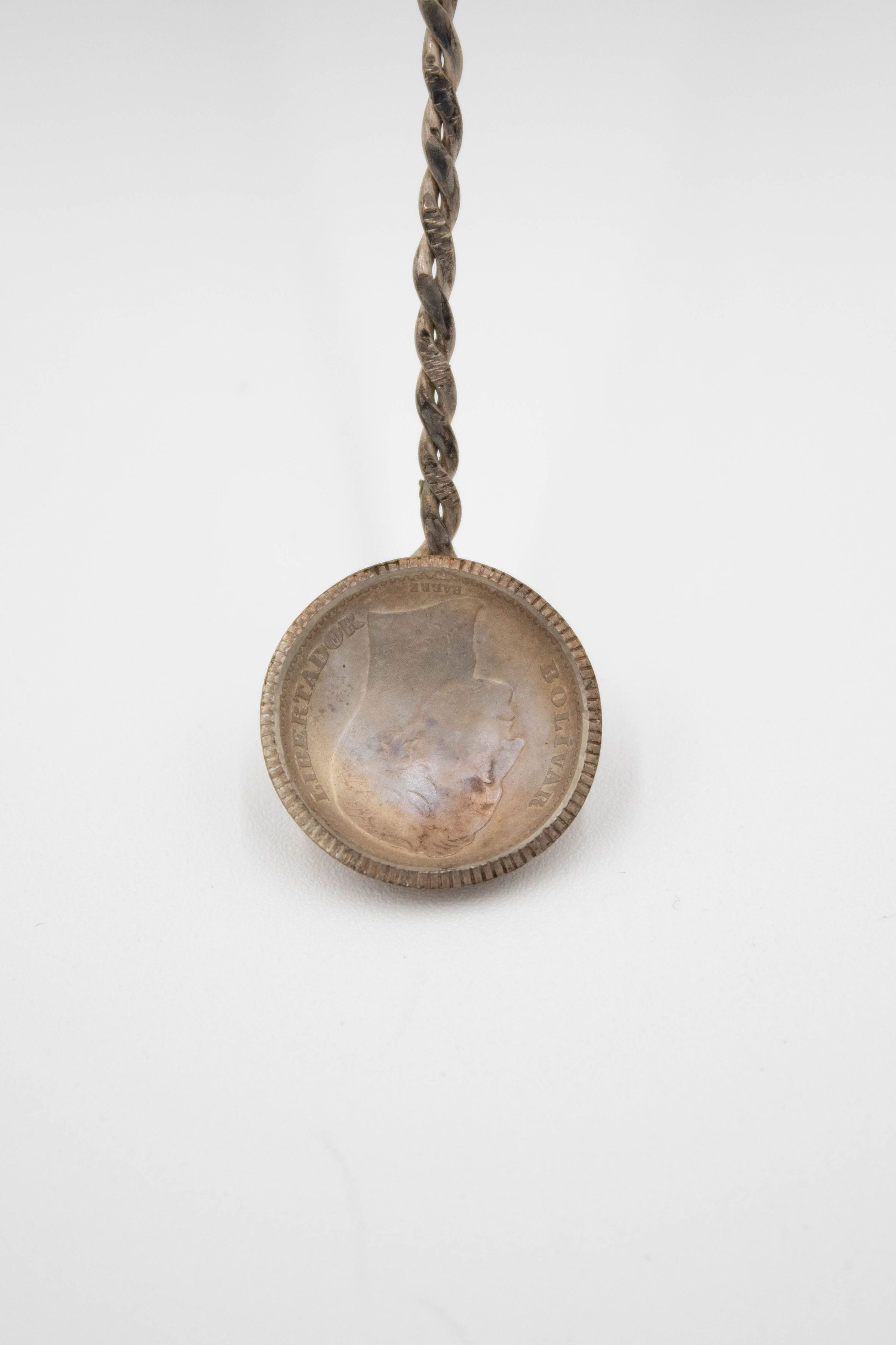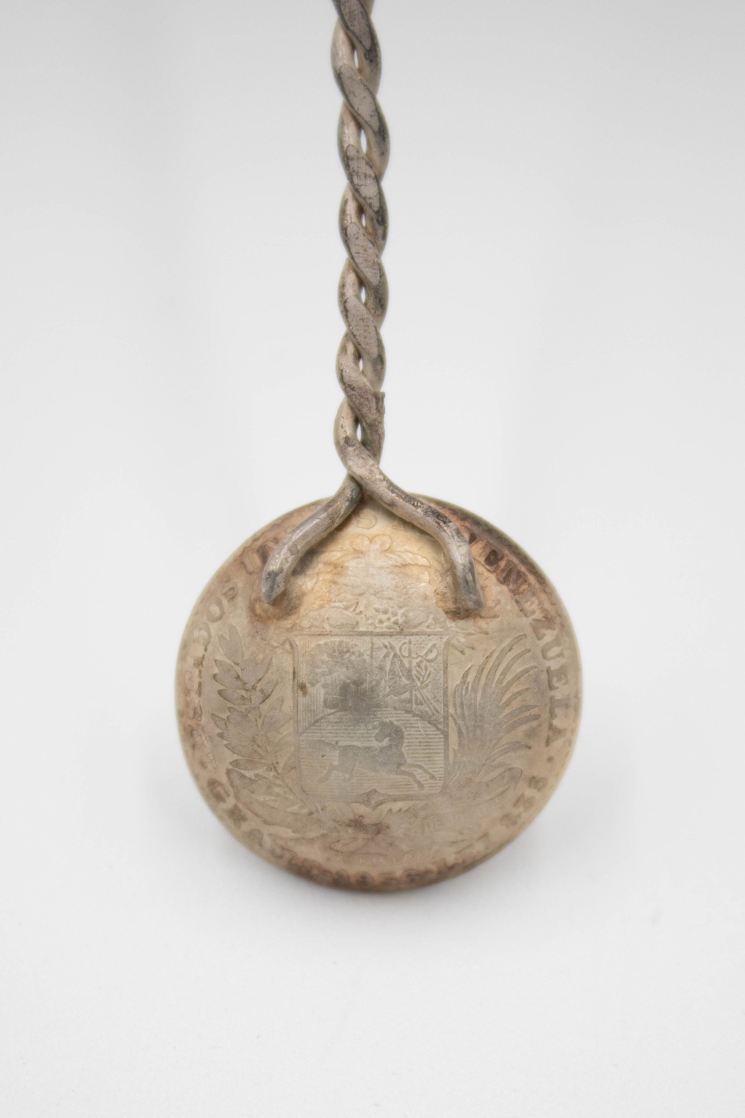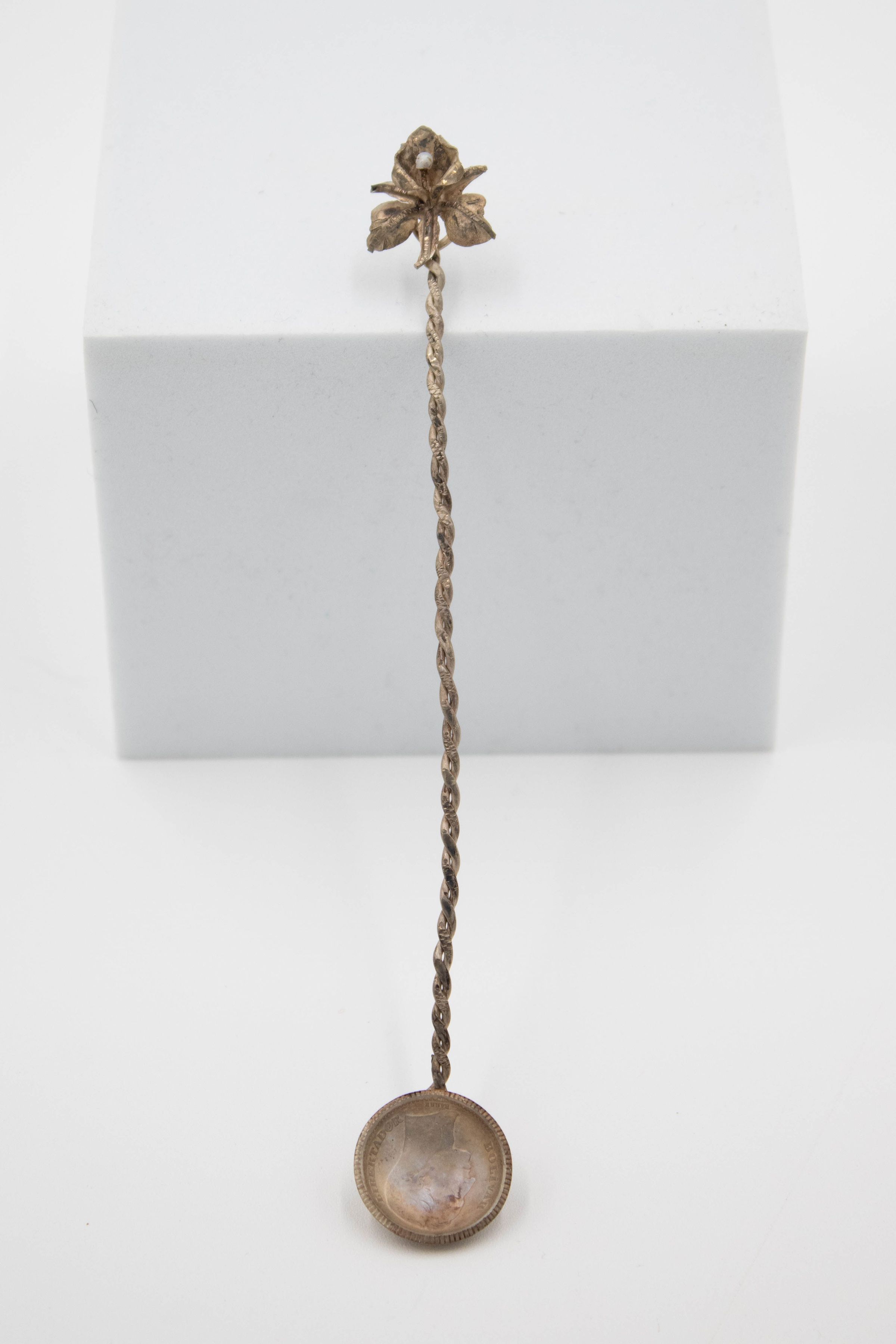 1932 Silver Bolivar Coin Spoon with Twisted Rope Handle and Orchid Handle Topper
