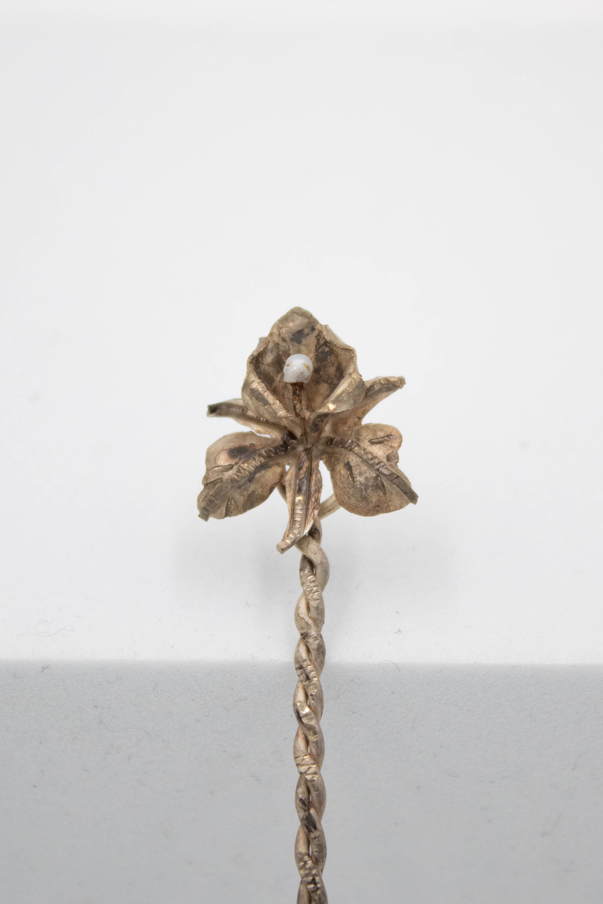 The spoon is small and thin with a twisted rope-style handle. The actual spoon is coin-sized, featuring an upside-down side profile of Simon Bolivar. The orchid topper with a pearl placed in the top petal is roughly the same size.