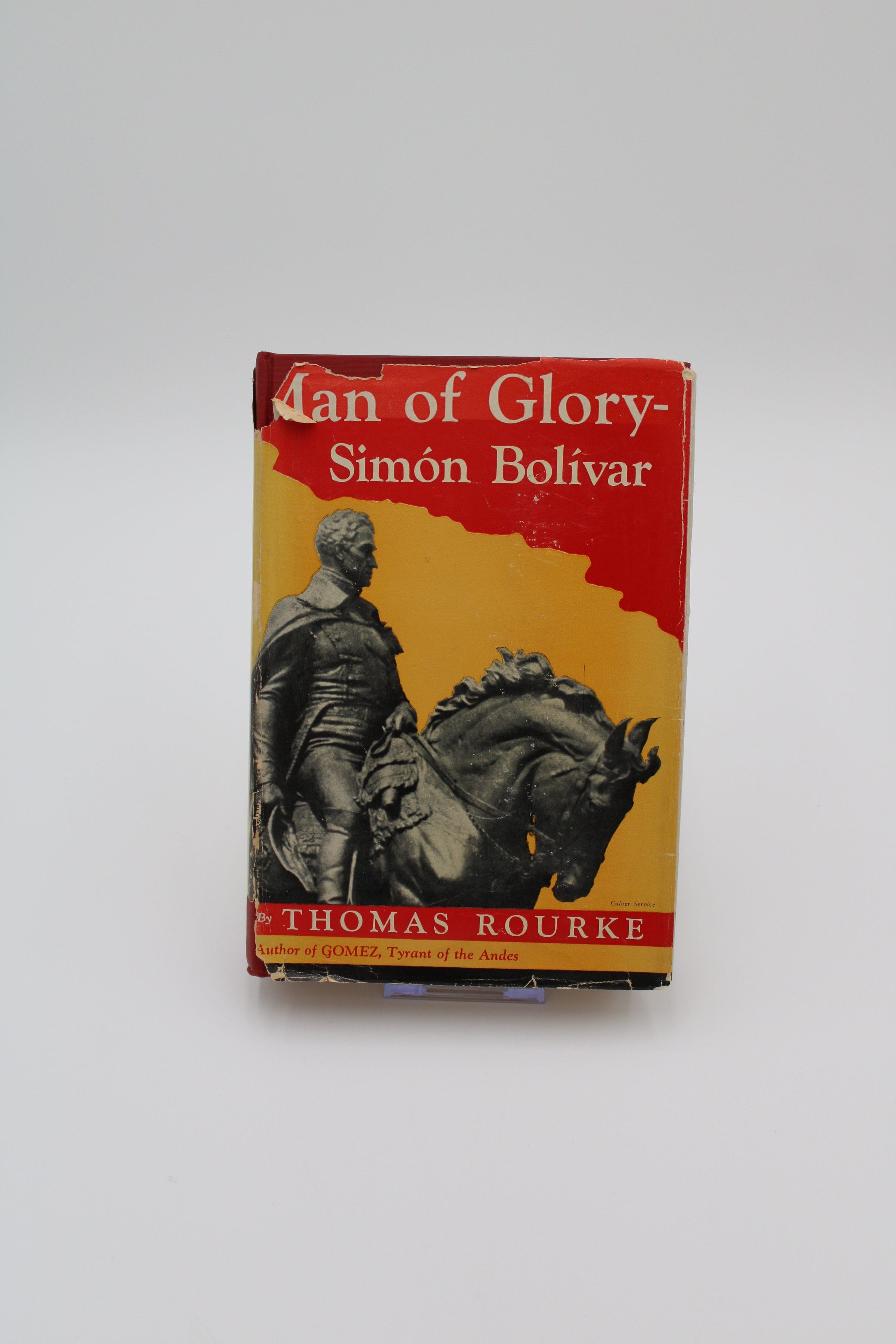 The front cover of “Man of Glory - Simon Bolivar” has a black and white photo of a statue of Simon Bolivar on horseback. The background colors' composition is irregular, with a yellow bottom half and a red top half.