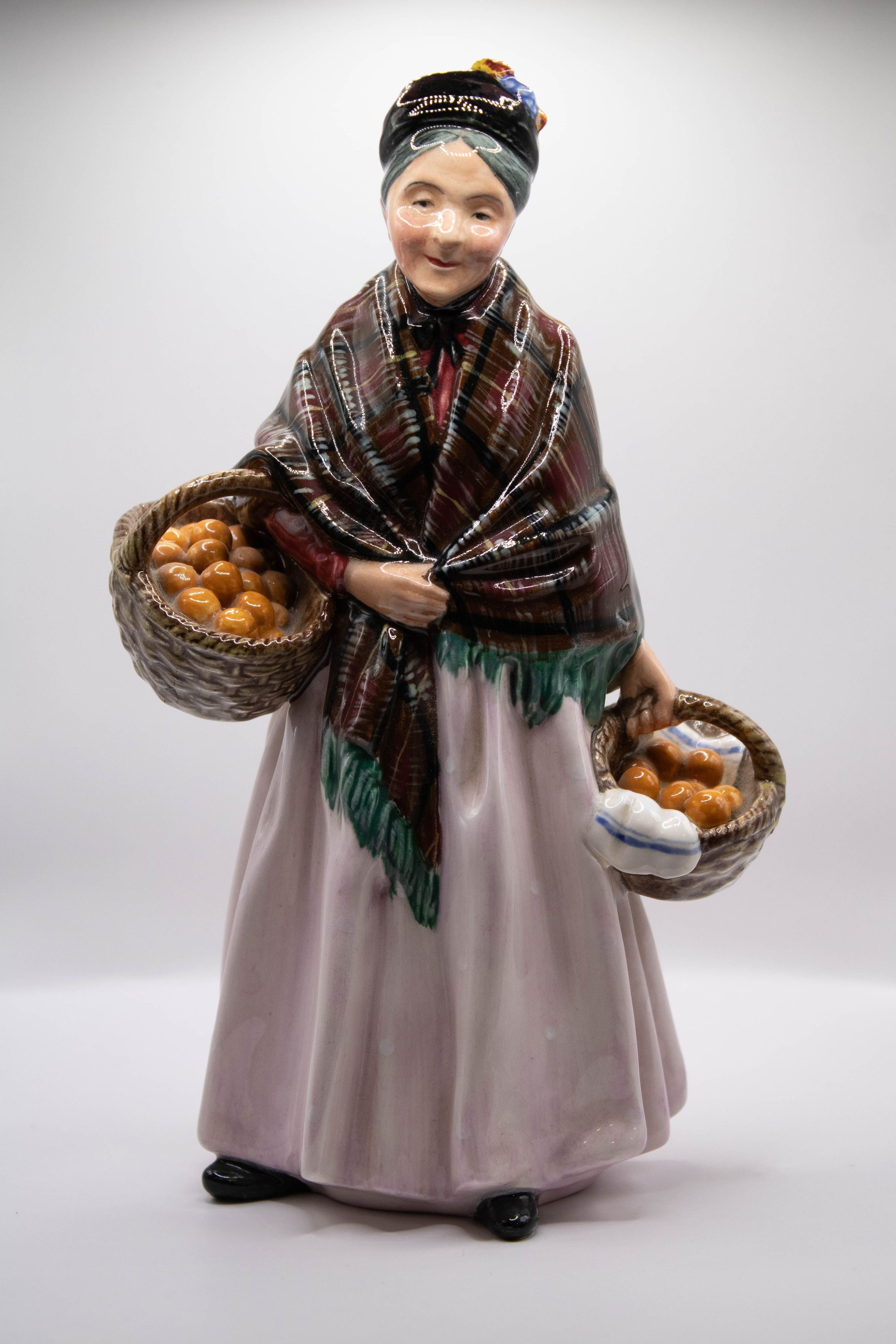 Royal Doulton figurine of a woman in shawl, holding two baskets of oranges. Titled "The Orange Lady."Ethnography