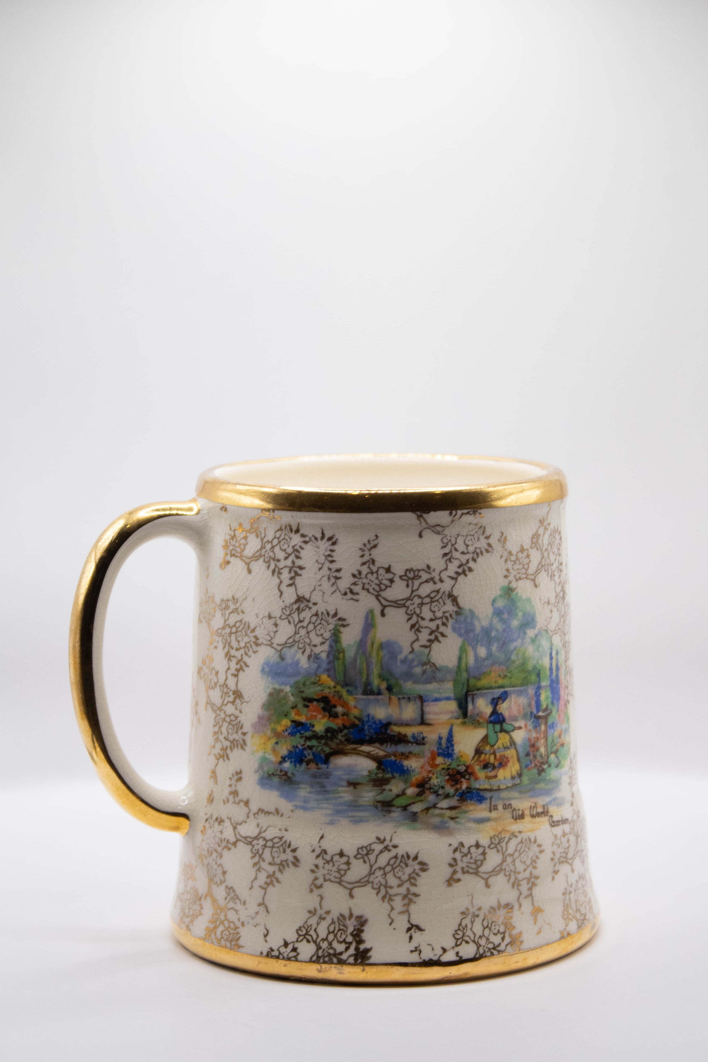 Ceramic mug with gold detail and inscription that reads "in an old world garden."Ethnography