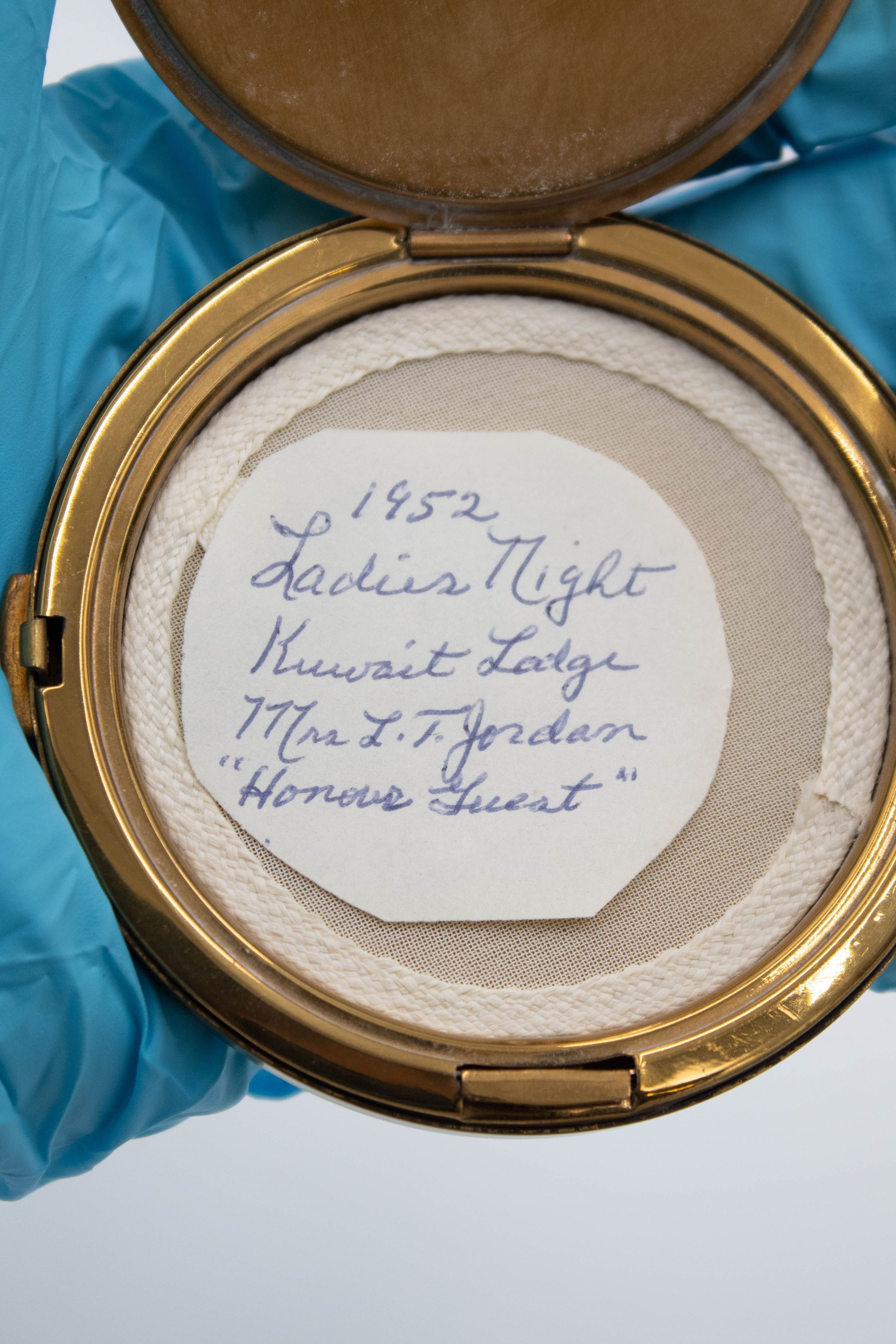 The small gold powder compact was given to Mrs. Jessie Jordan during a Ladies Night at Kuwait Masonic Lodge 6810 in 1952 when she was the “Guest of Honor.” Mrs. Jordan was honored at many Ladies Nights during her time in Kuwait and was often the “Guest of Honor” at such events. Ladies Nights in the Masonic Lodge are designed to honor the women in a Freemason’s life, whether that be a wife, daughter, sister, mother, or other supporting woman.Ethnography