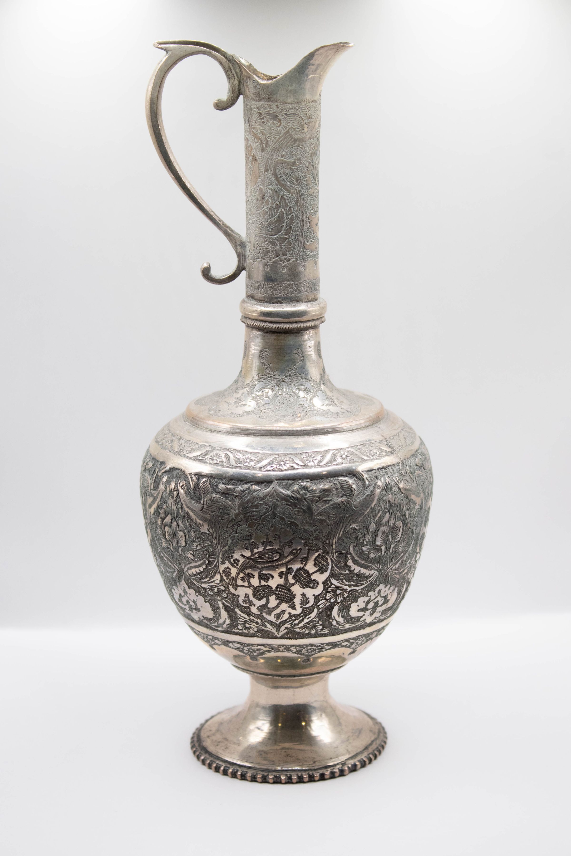 Sterling silver handled ewer engraved with floral motifs. Ewers are used to serve wine and this one was made in the 1920s in Persia, now modern-day Iran.Context