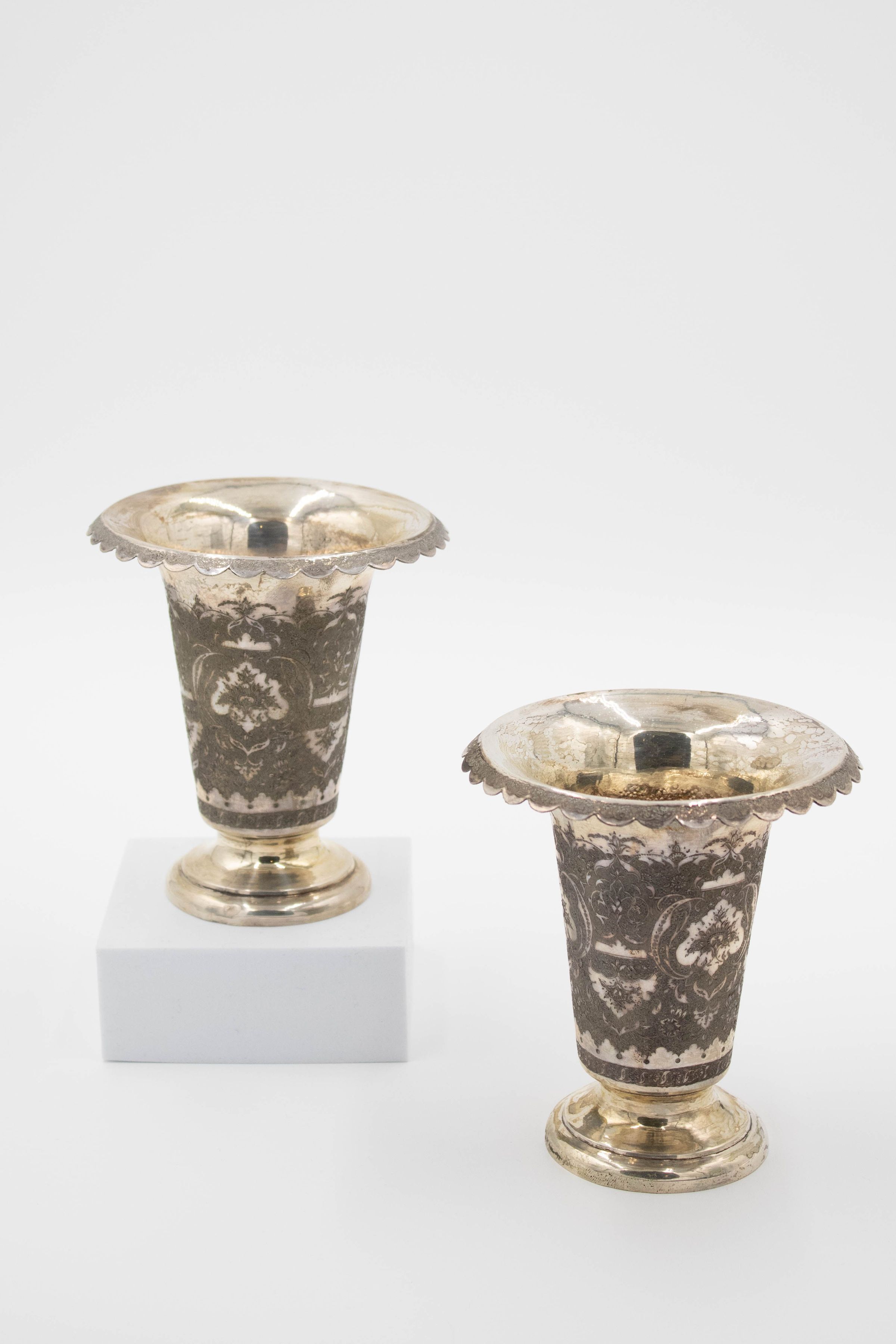 Pair of five-inch silver vases engraved with floral motifs. The vases have a flared rim and were made in Persia, now modern-day Iran.