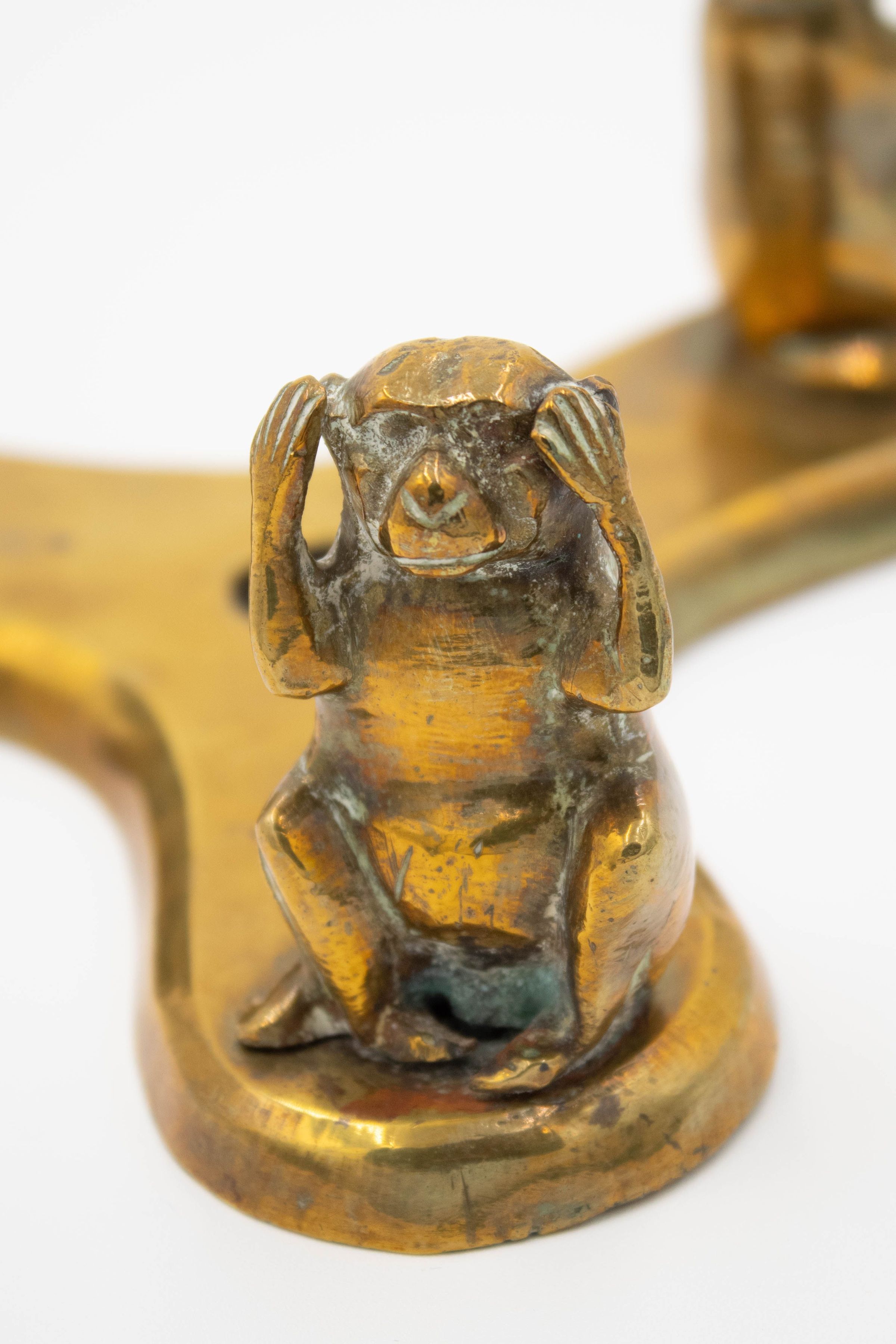 Image of the brass flower frog as it stands on its brass pedestal. The pedestal is Y-shaped with a hole in its middle. At each end of the pedestal is a sitting monkey each representing a monkey from the "three wise monkeys" Japanese maxim. The monkeys hold up the brass flower frog.