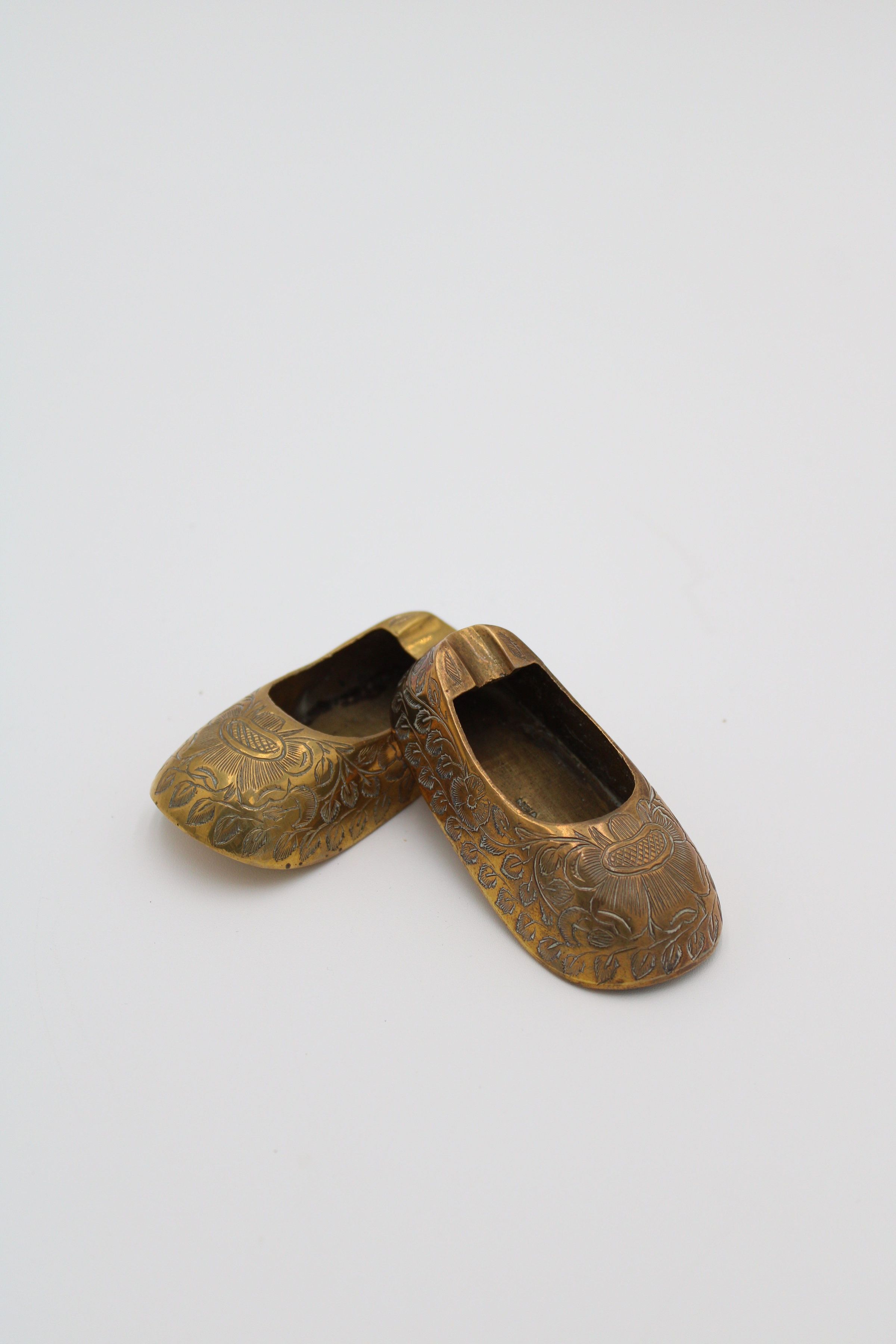 The image displays two brass shoe ashtrays, intricately engraved with a floral design, placed against a plain white background.