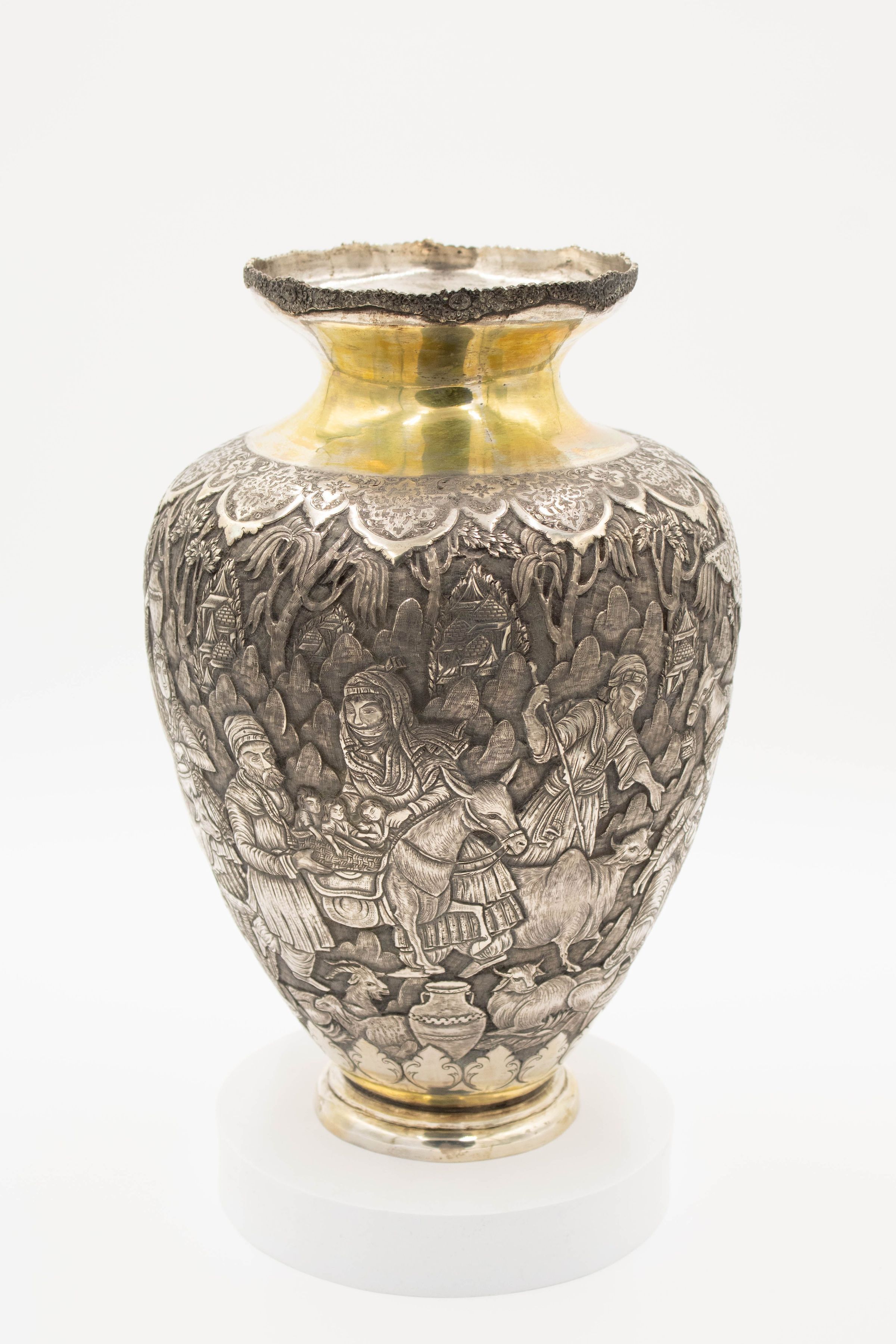 Large Persian Silver Urn with Debossed Farming Rural Scene