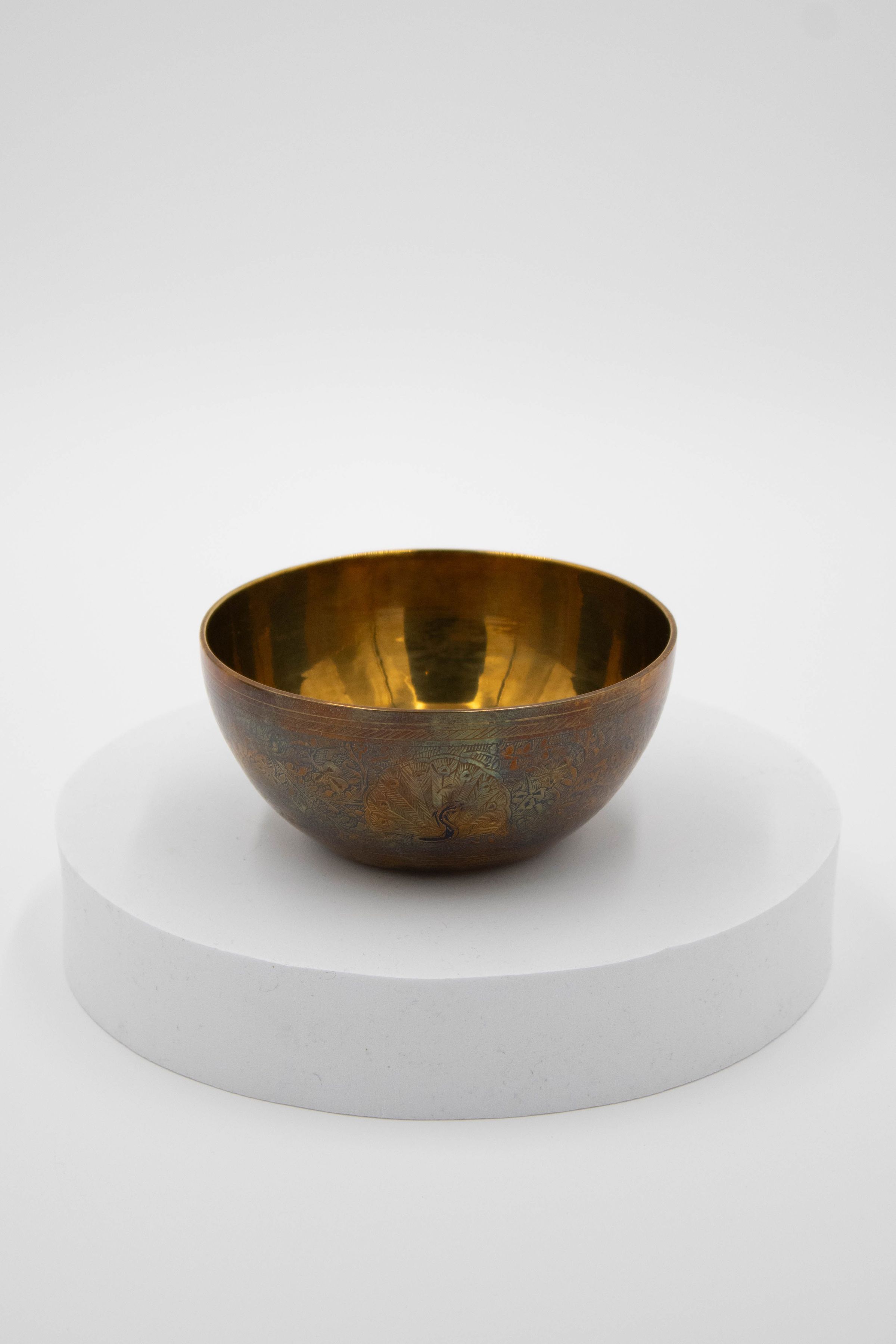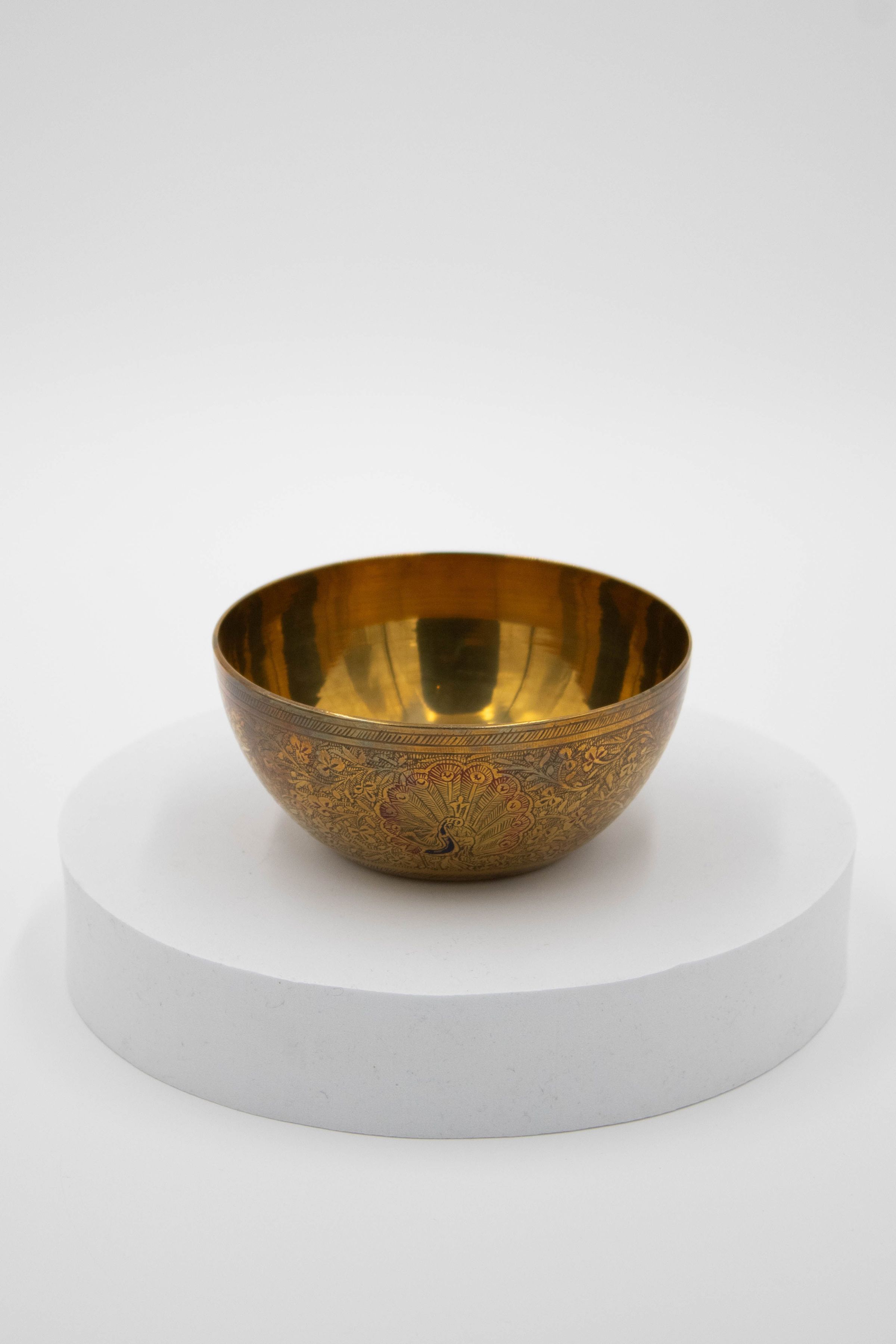 Brass bowls with blue peacock, red peacock, gold peacock, blue flower, and red flower designs.Parts