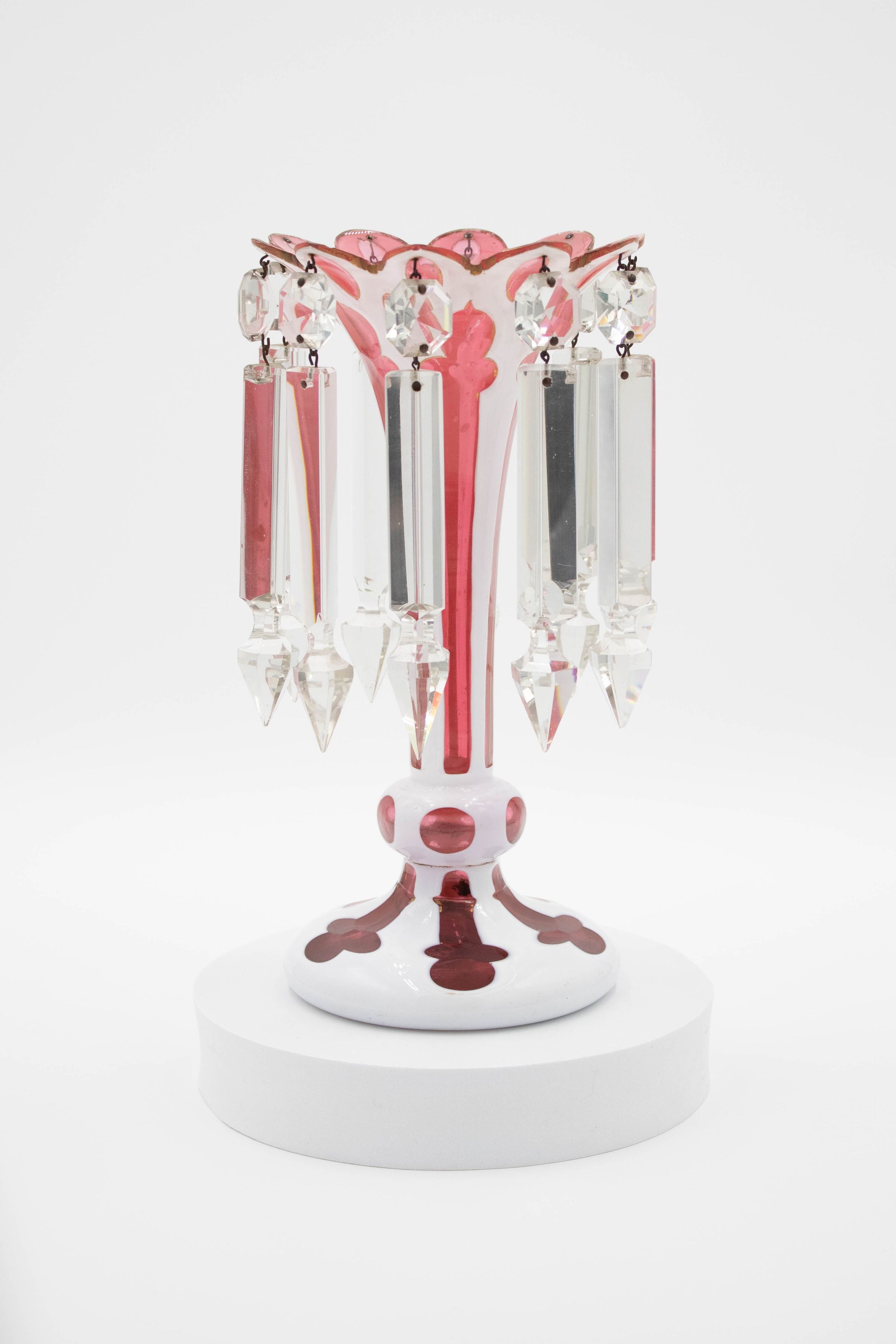 The mantle lustre is made of cranberry-colored glass with a white enamel overlay. The piece contains nine clear prisms that hang off the edge of the vase. The piece is indicative of Victorian-style mantle lustres and is likely from that time period. It was likely made in Edinburgh, Scotland.Context
