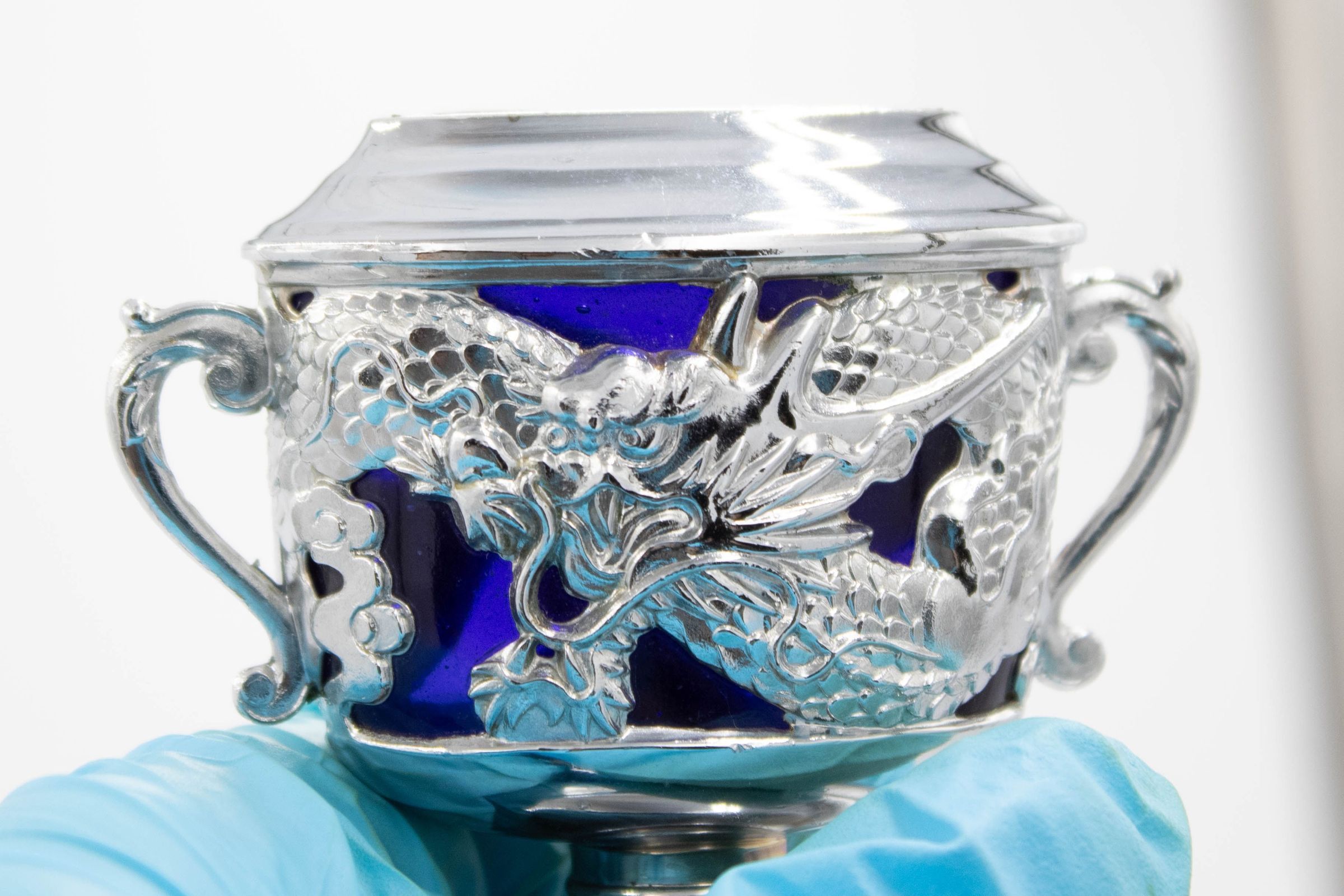 Silver Ashtray with Dragons and Lighter with Blue Cobalt Glass ReservoirEntry/Object ID