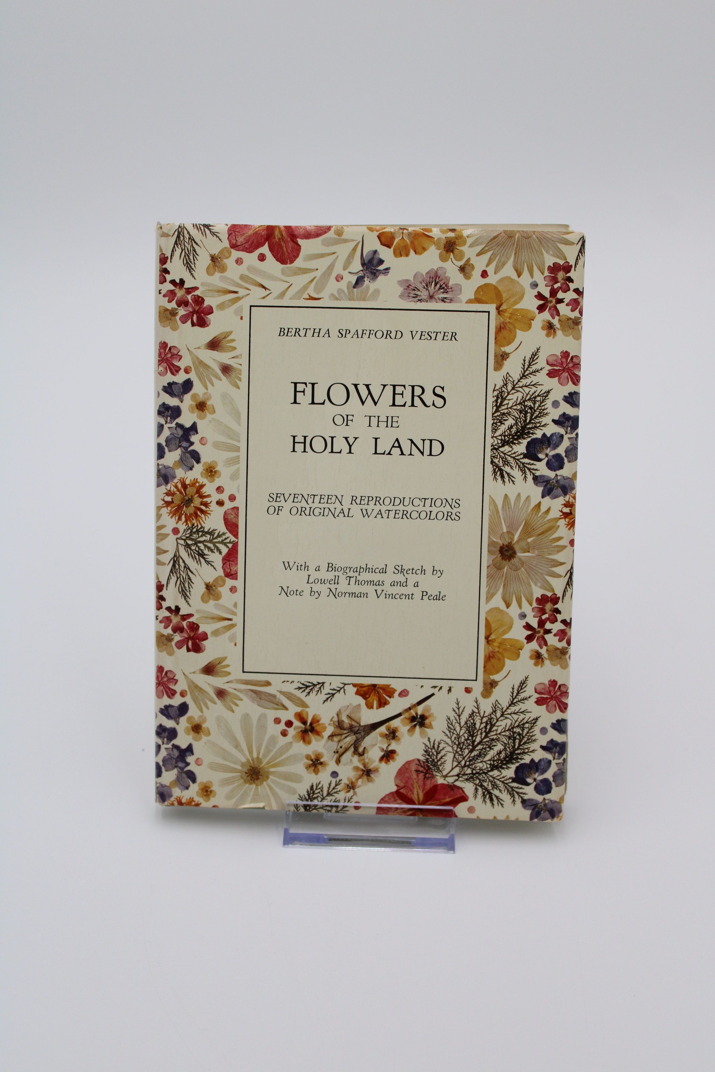 The front cover of “Flowers of the Holy Land” has a background of depictions of various flowers on a white background. In the middle is a white box with the title and subtitle, as well as the author's name.