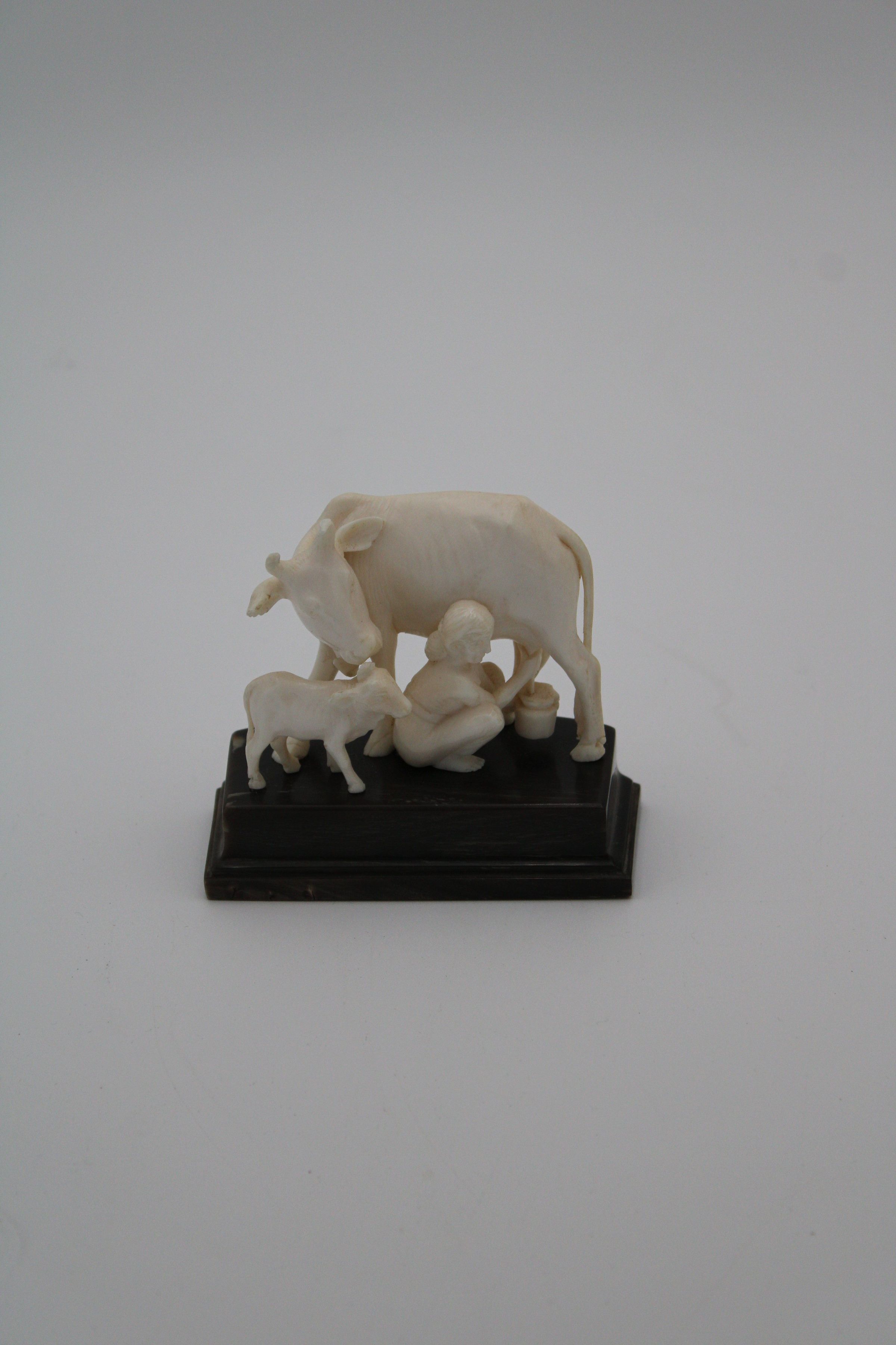 The ivory figure depicts a child milking a cow with a calf nearby.