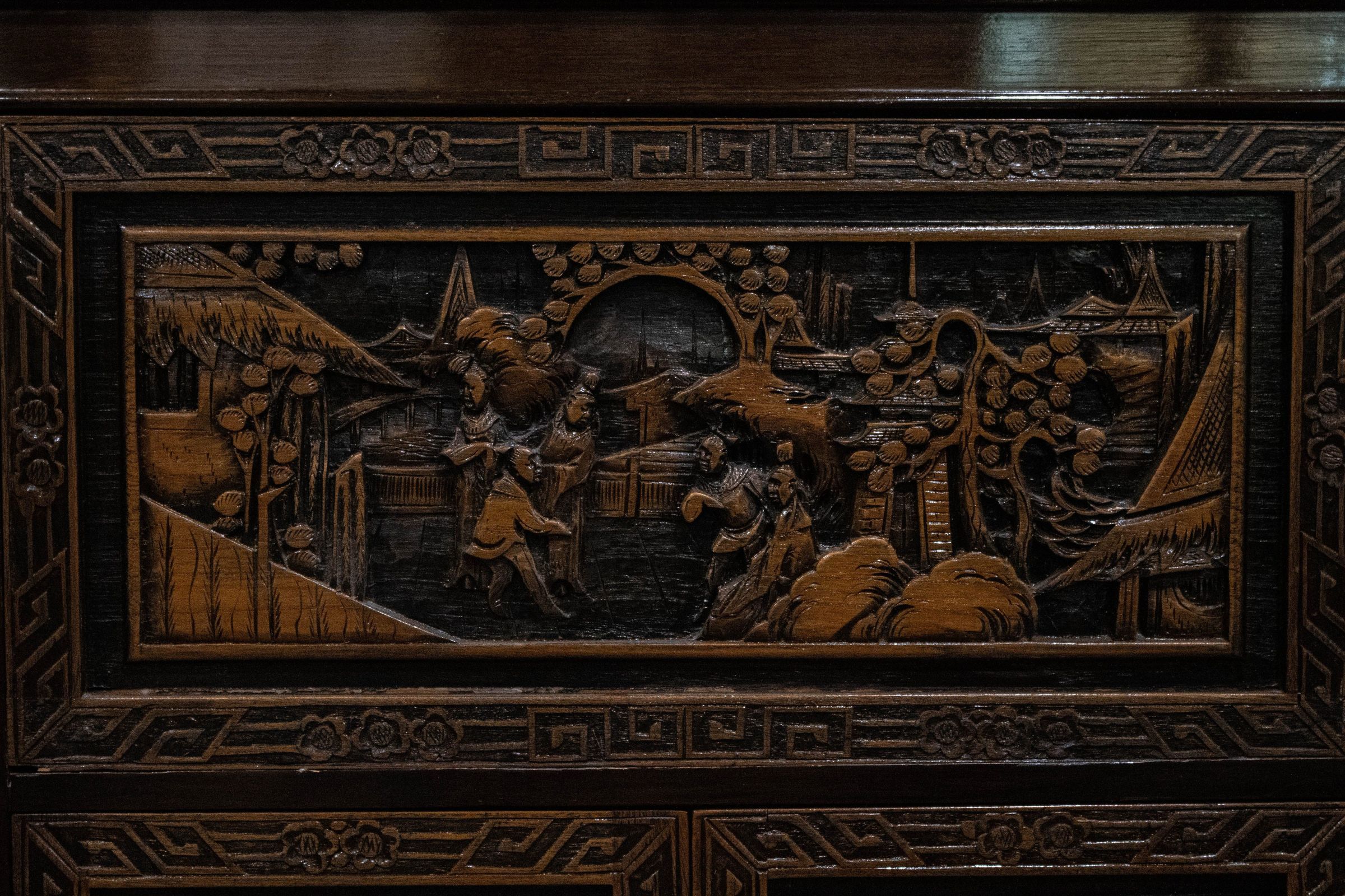 The intricately carved wooden bar features detailed scenes, showcasing exquisite craftsmanship of Hong Kong artistry.