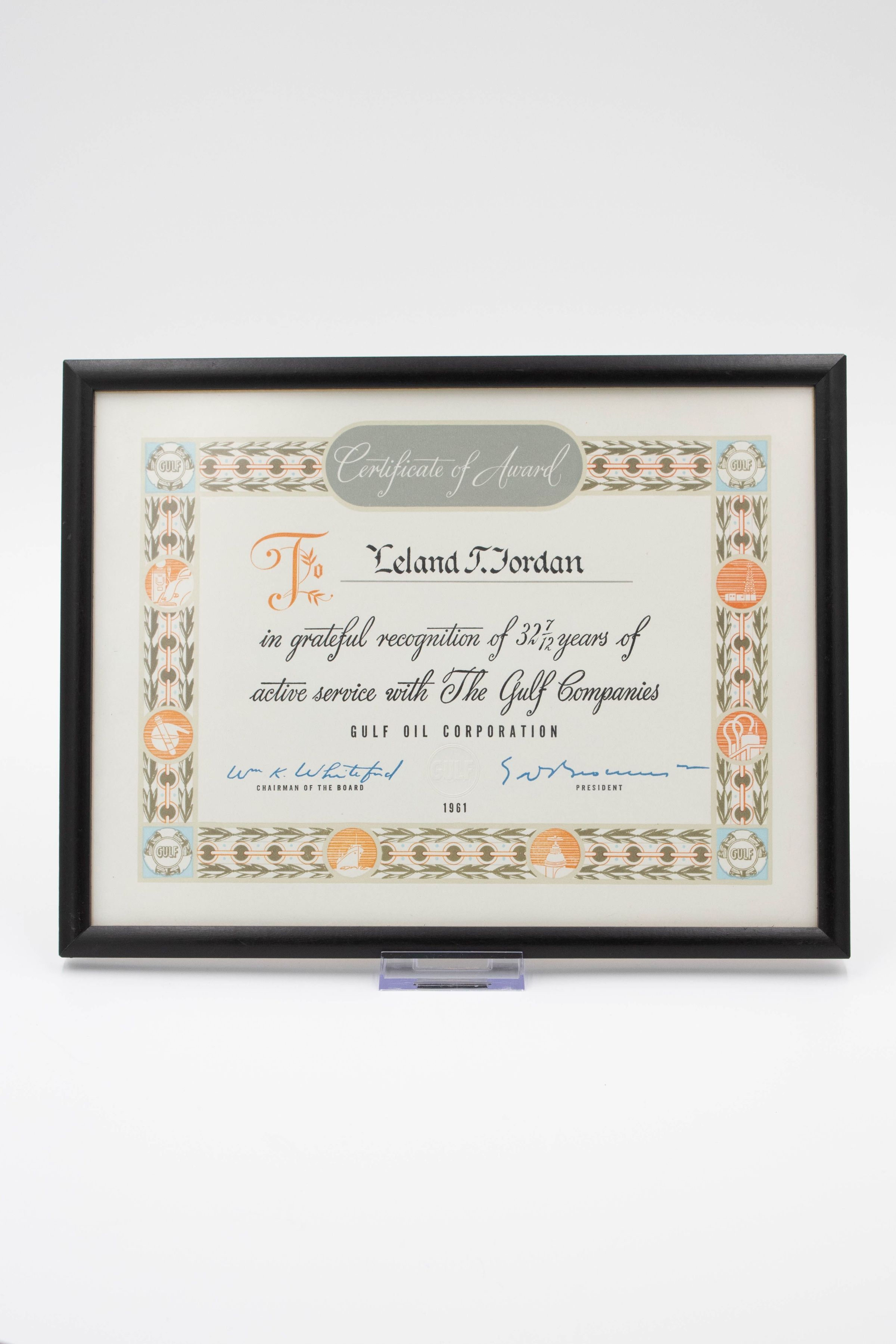 A 10"x13" framed certificate from Gulf Oil Company, "Certificate of Award; To Leland T. Jordan in grateful recognition of 32 7/12 years of active service with the Gulf Companies." It is signed and has a trim with green leaves and orange "Gulf" logos.