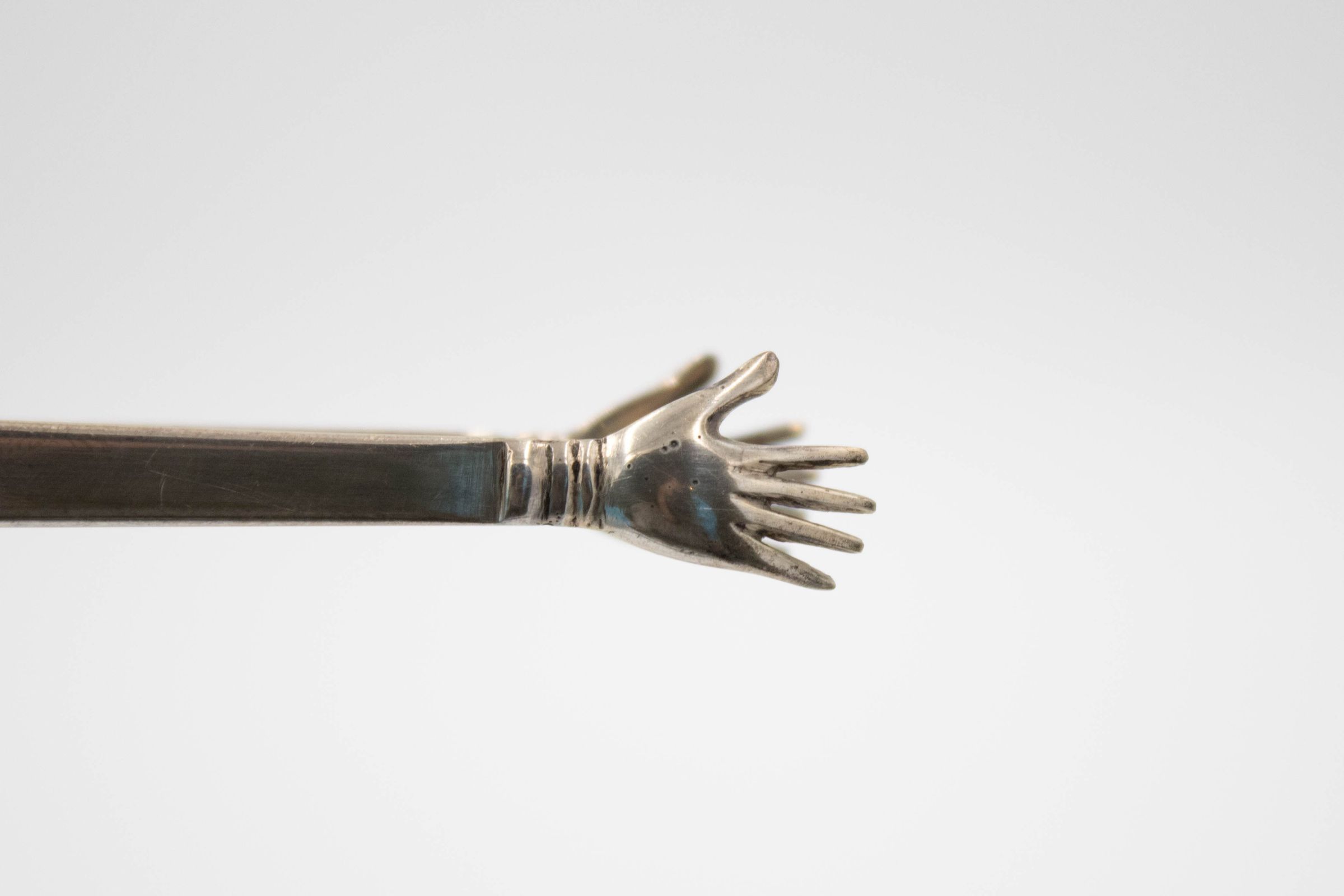 A thin pair of tongs with small hands at the ends. It has a camel and oasis scene around the center, "Kuwait 1950," and "L.T. Jordan" engraved.