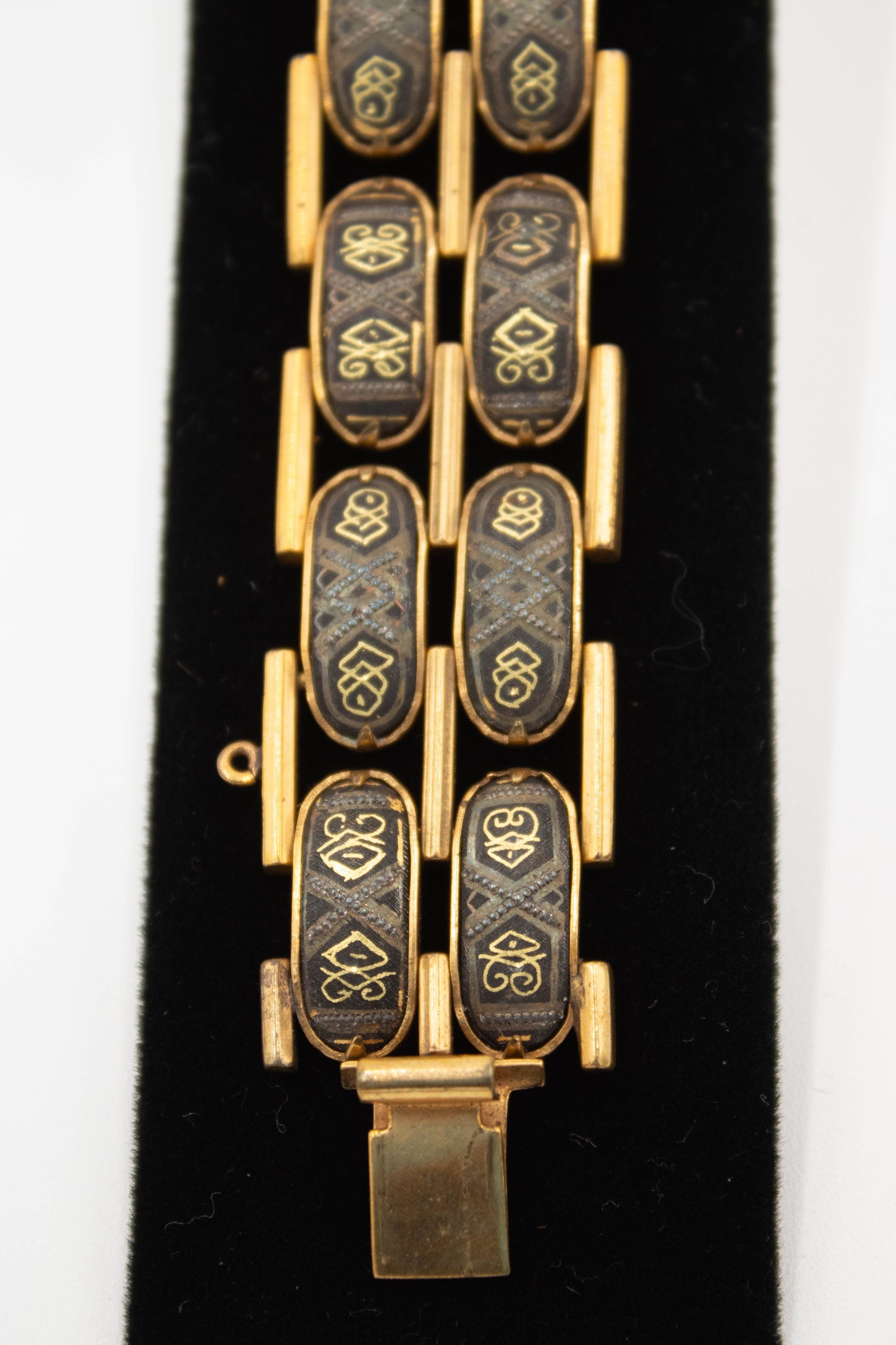 Gold bracelet with two rows of Egyptian-style designs.Context