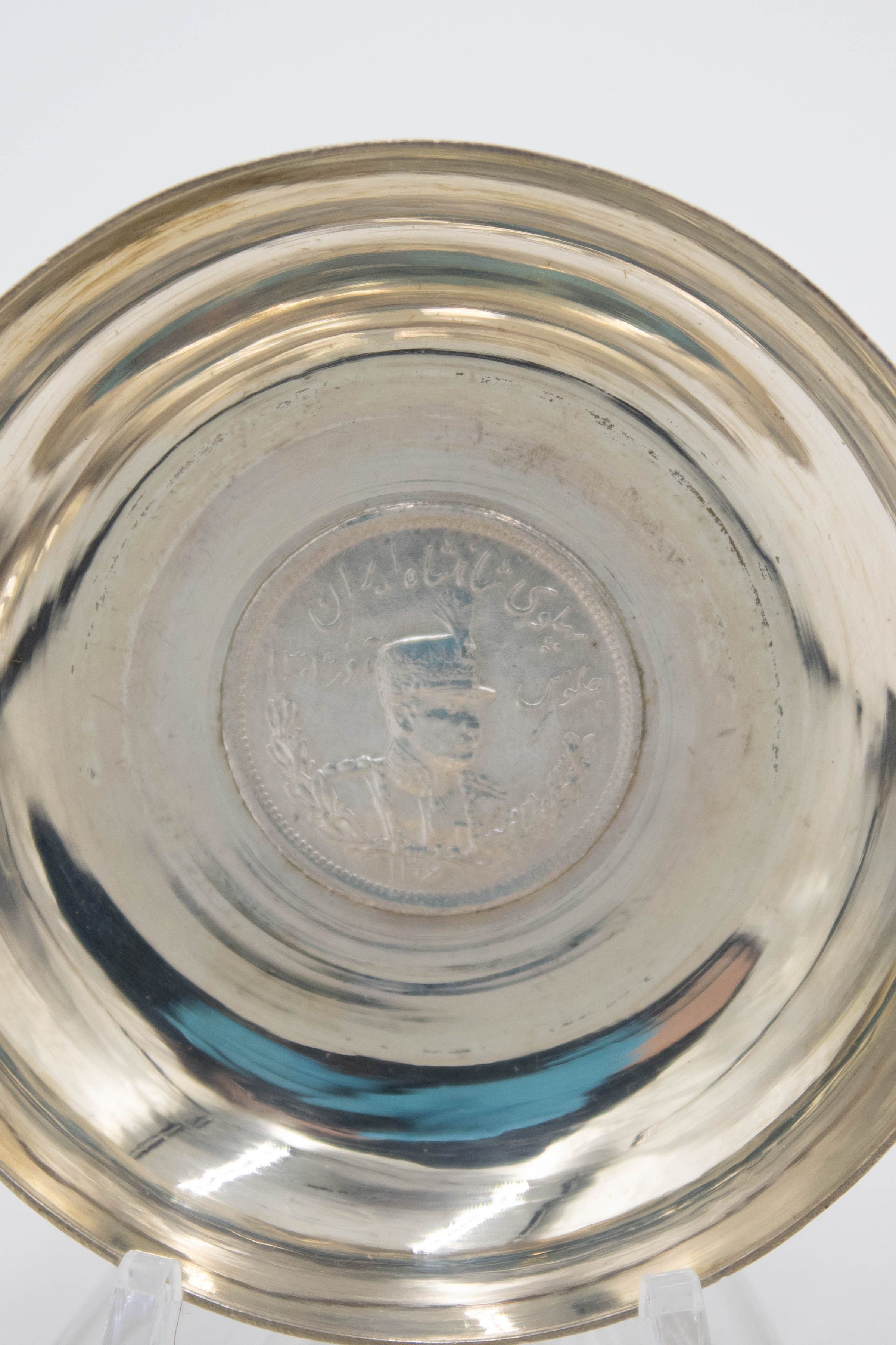 Set of 14 small silver coin bowls. The bowls are decorated with Iranian silver coins showing various Shahs of Persia. They were made in Iran.Context