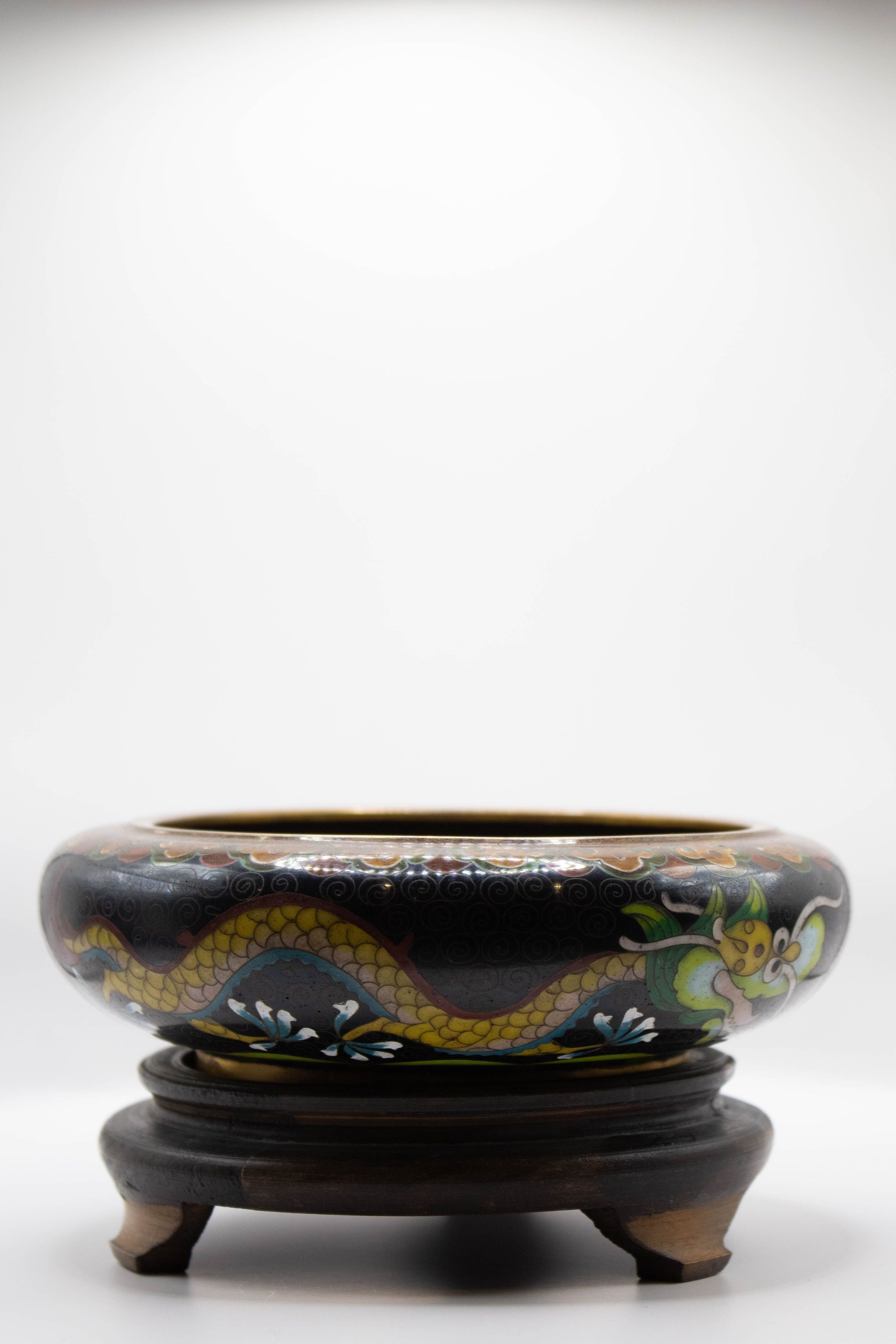 Black Enamel Bowl with Gold Dragon on Wood Stand