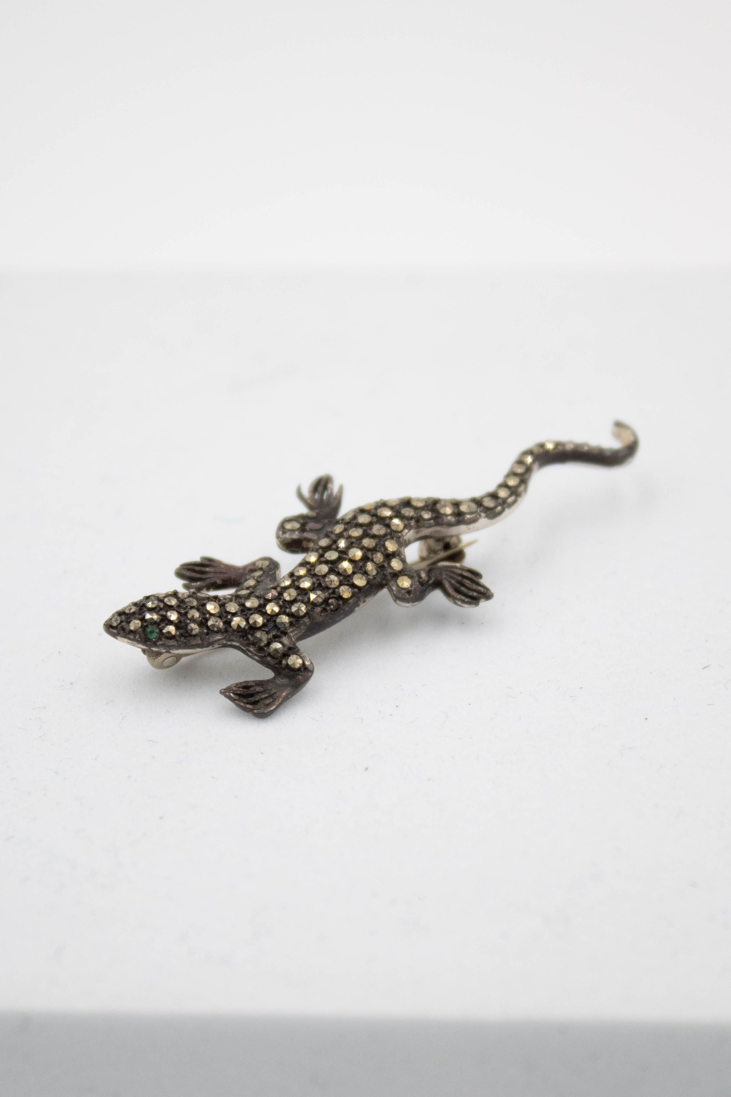 The small lizard-shaped brooch is made of silver embedded with diamonds and two emerald eyes.Context