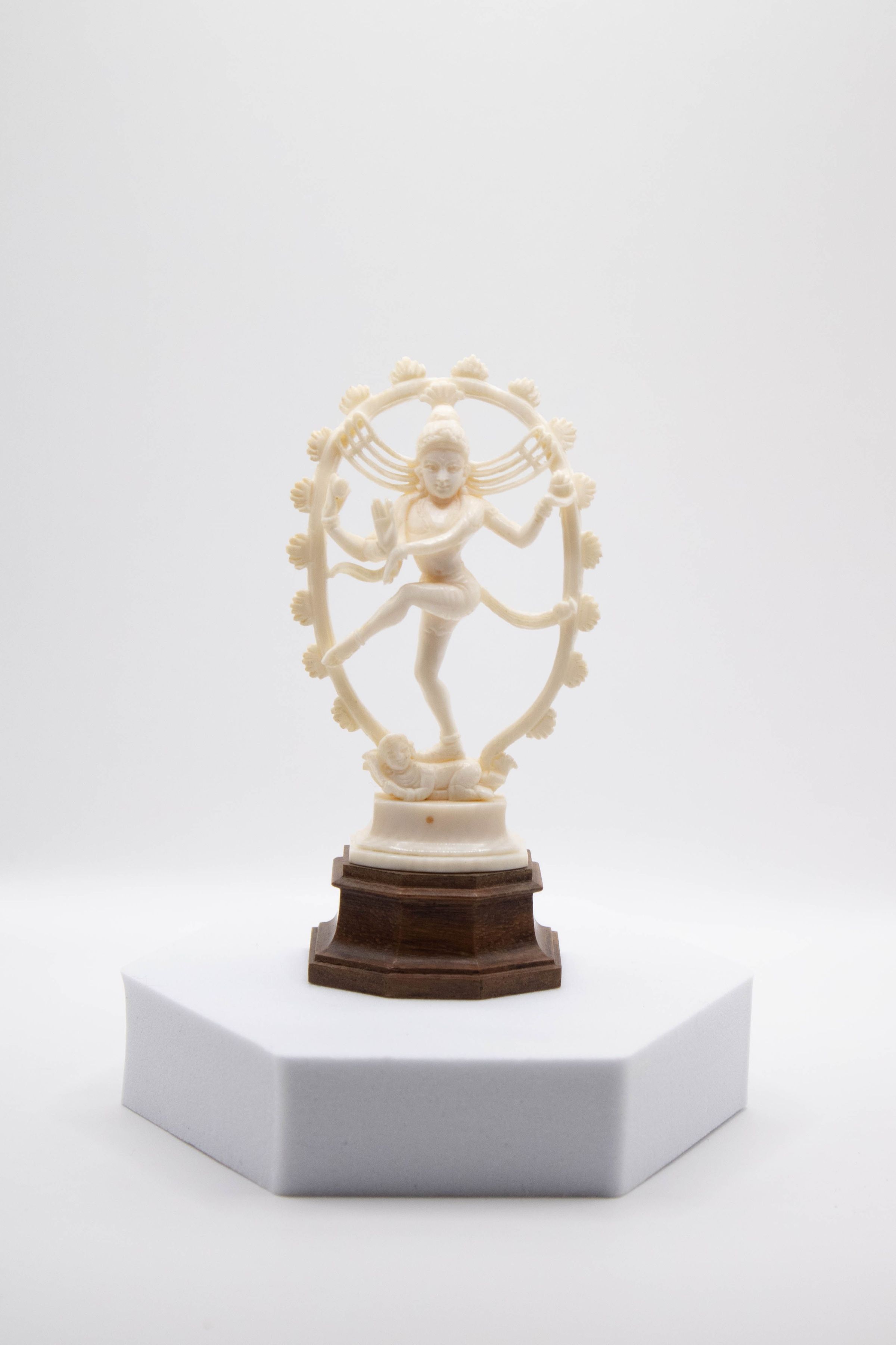 Carved ivory statuette of Dancing Shiva Nataraja on a wooden base. Shiva Nataraja, also known as Adalvallan and "Lord of the Dance," is an East Indian Hindu deity. He is often depicted as a divine cosmic dancer and his dance is called the Ananda Tandava, which is a dance of bliss and triumph. The statuette was made in India.Context