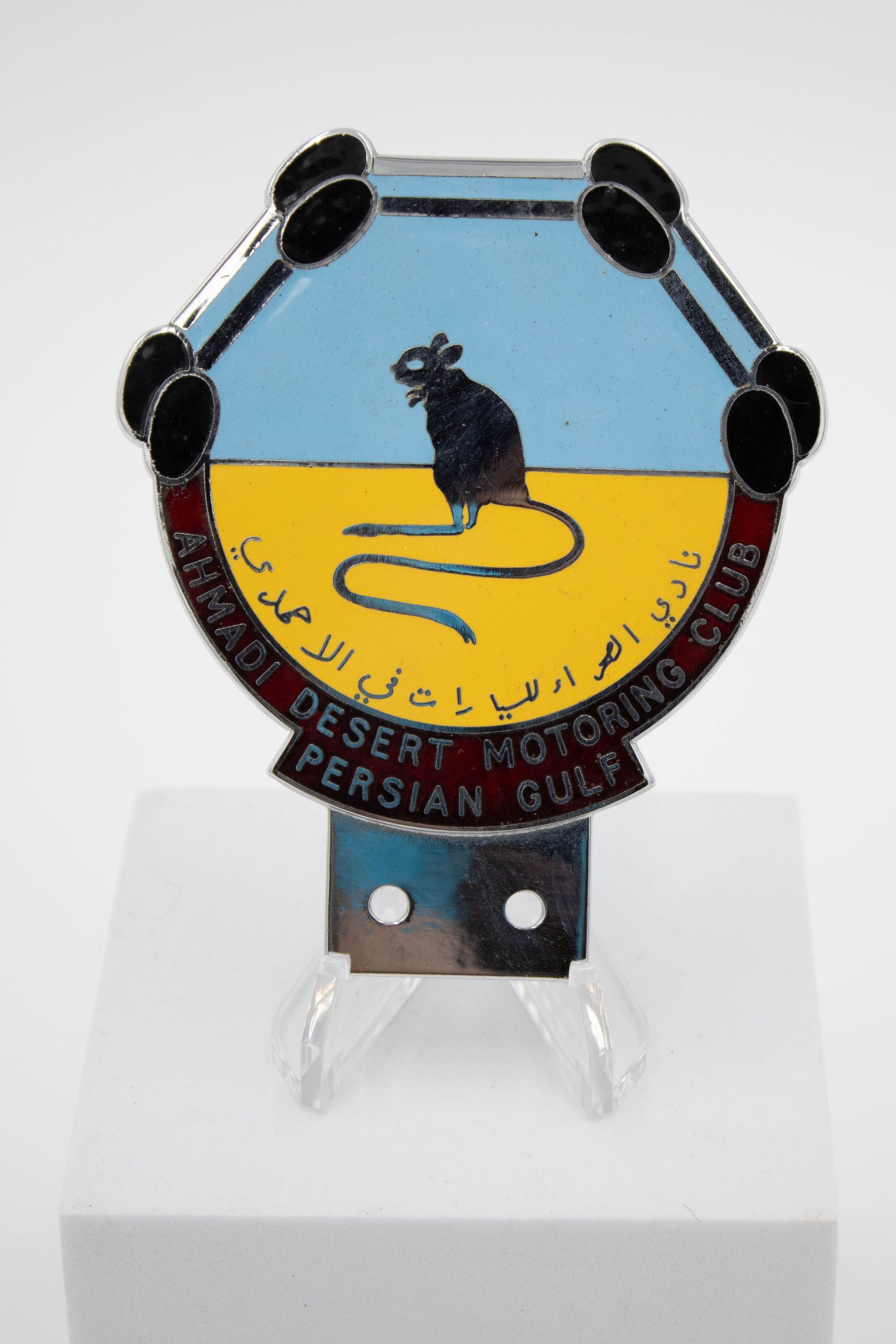 A palm-sized blue and yellow car badge. It is yellow and half-circular on the bottom, with four trapezoidal edges on the blue top. Around the bottom edge, it says "Ahmadi Desert Motoring Club Persian Gulf." A row of Arabic text states the car club's title. In the center of the badge a rodent is featured with long lower legs, a long tail and small ears, likely a jerboa. It weighs 194 grams and is 4.5 inches tall, 4 inches long and is roughly 1/8th of an inch thick.