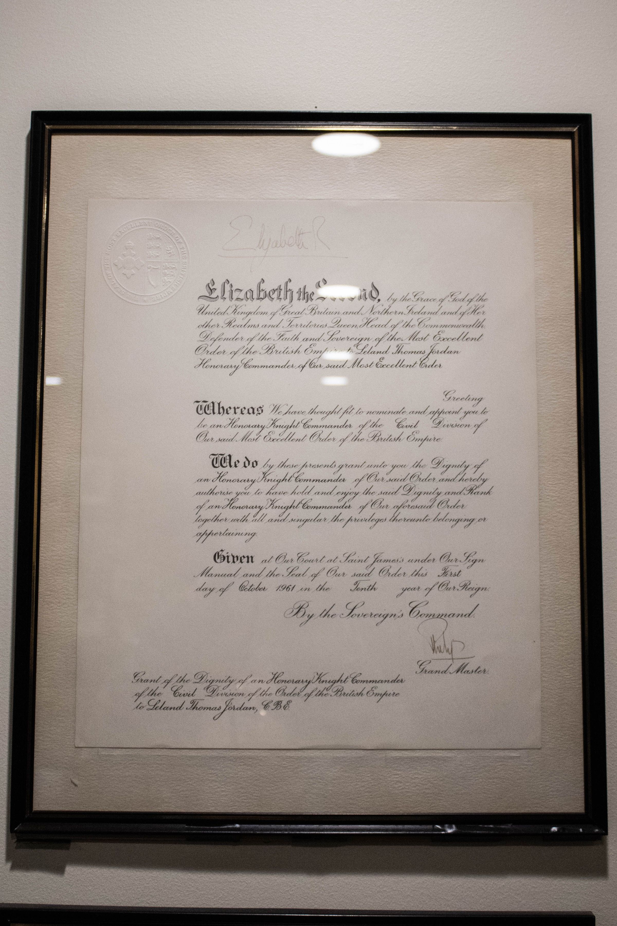 Framed certificate from Queen Elizabeth II bestowing Honorary Knight Commander of the Order of the British Empire on L.T. Jordan in 1977.Ethnography