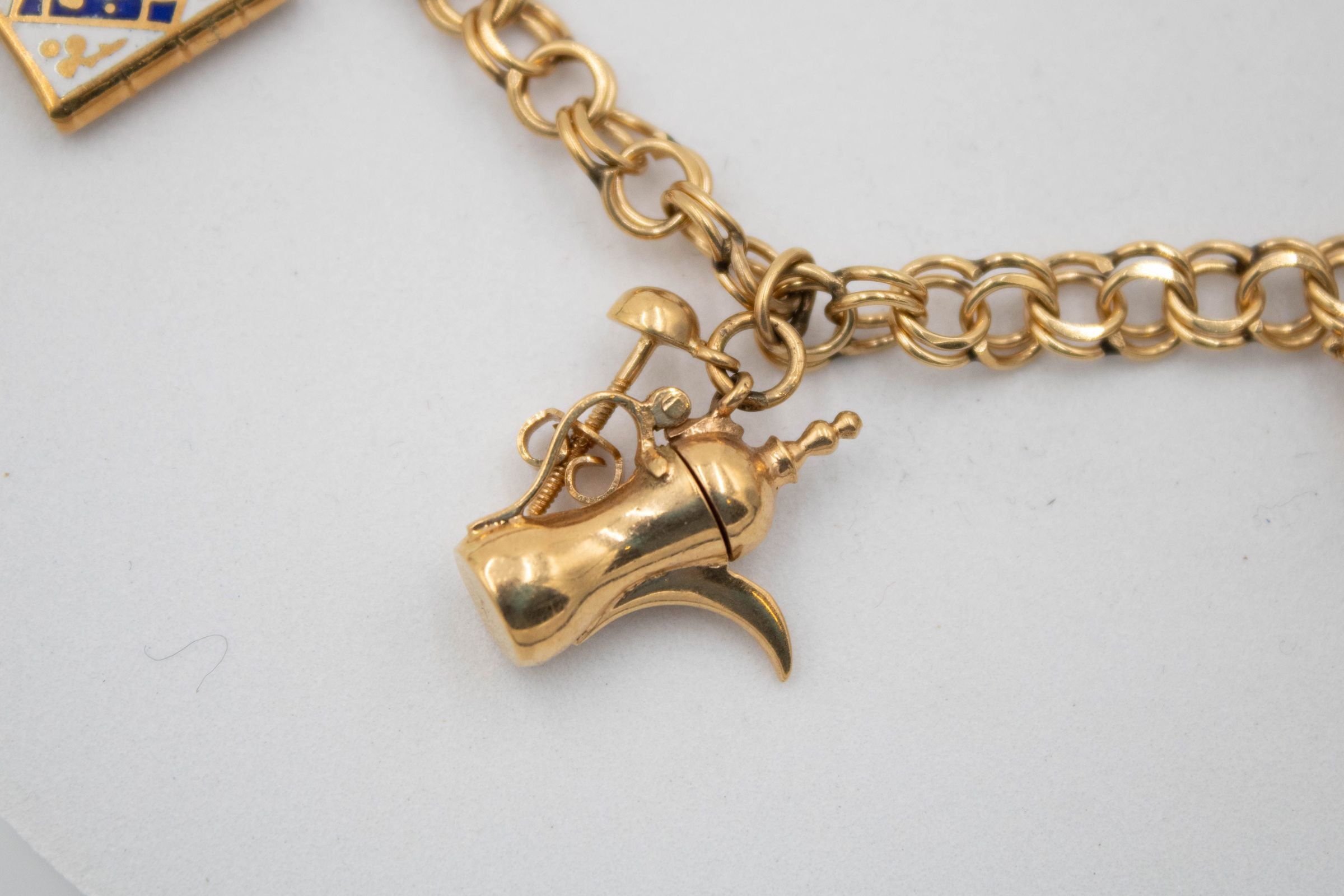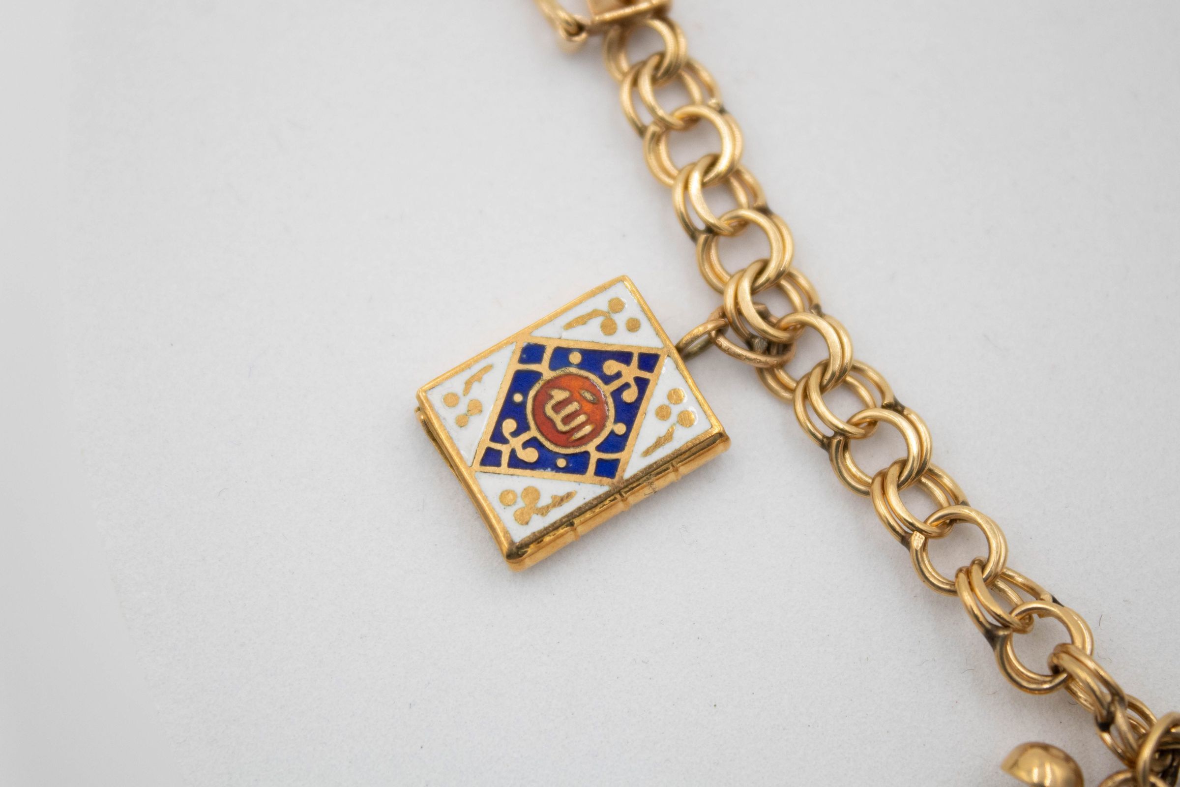Image of the gold five-charm bracelet on gold chain. There is a book charm with Arabic script, two small Arabic coffee pots, a small mosque building, and a bust of a boy with a crown and blue gem eyes. The two coffee pot charms are earrings and still have the mechanisms attached to hang them. The bracelet bracelet is Texas barbed wire-style and clasp is a four-leaf clove.