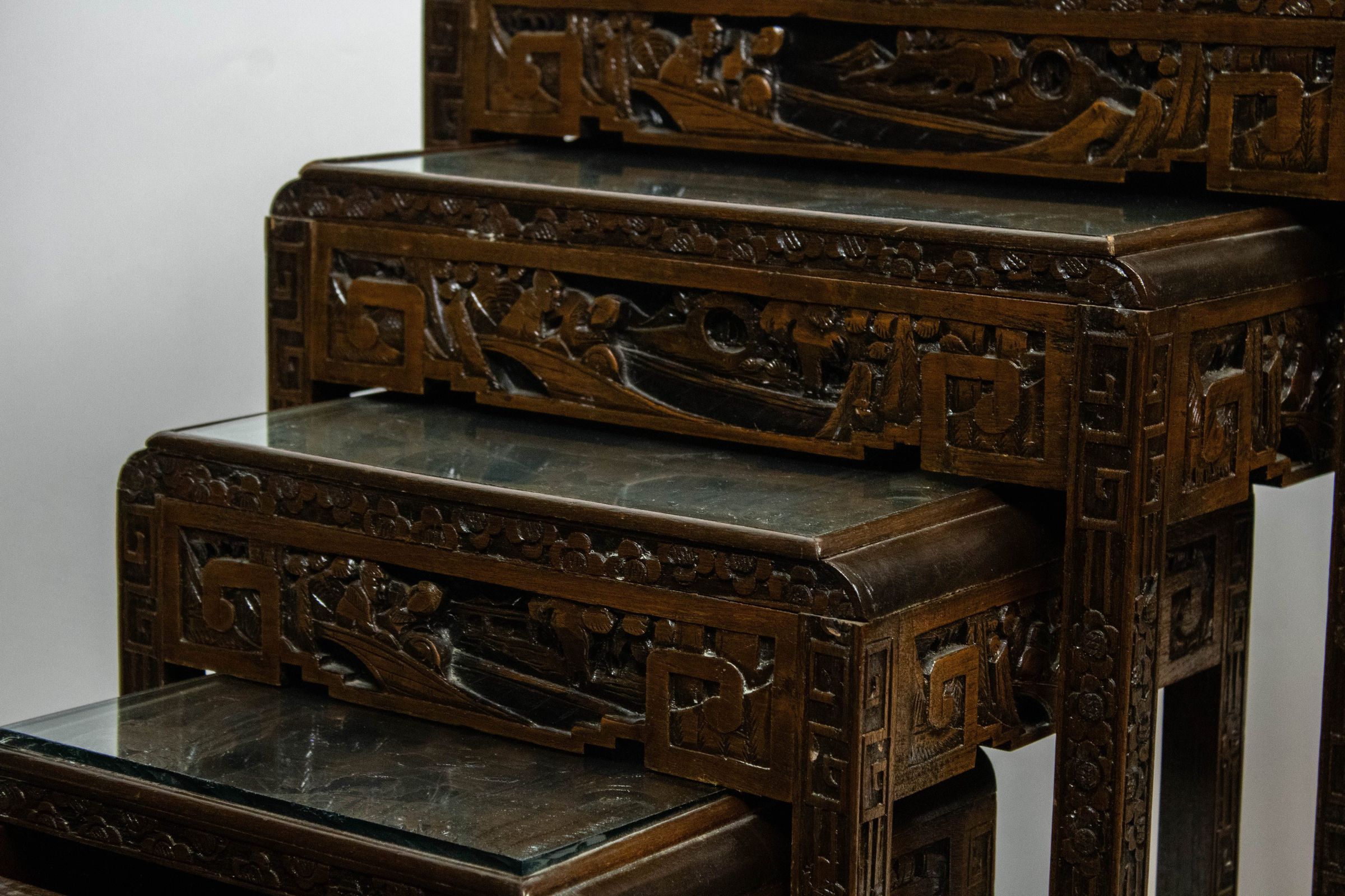 Two sets of rectangular tables with four tables each; carved nesting tables from Hong Kong; glass tops.Ethnography