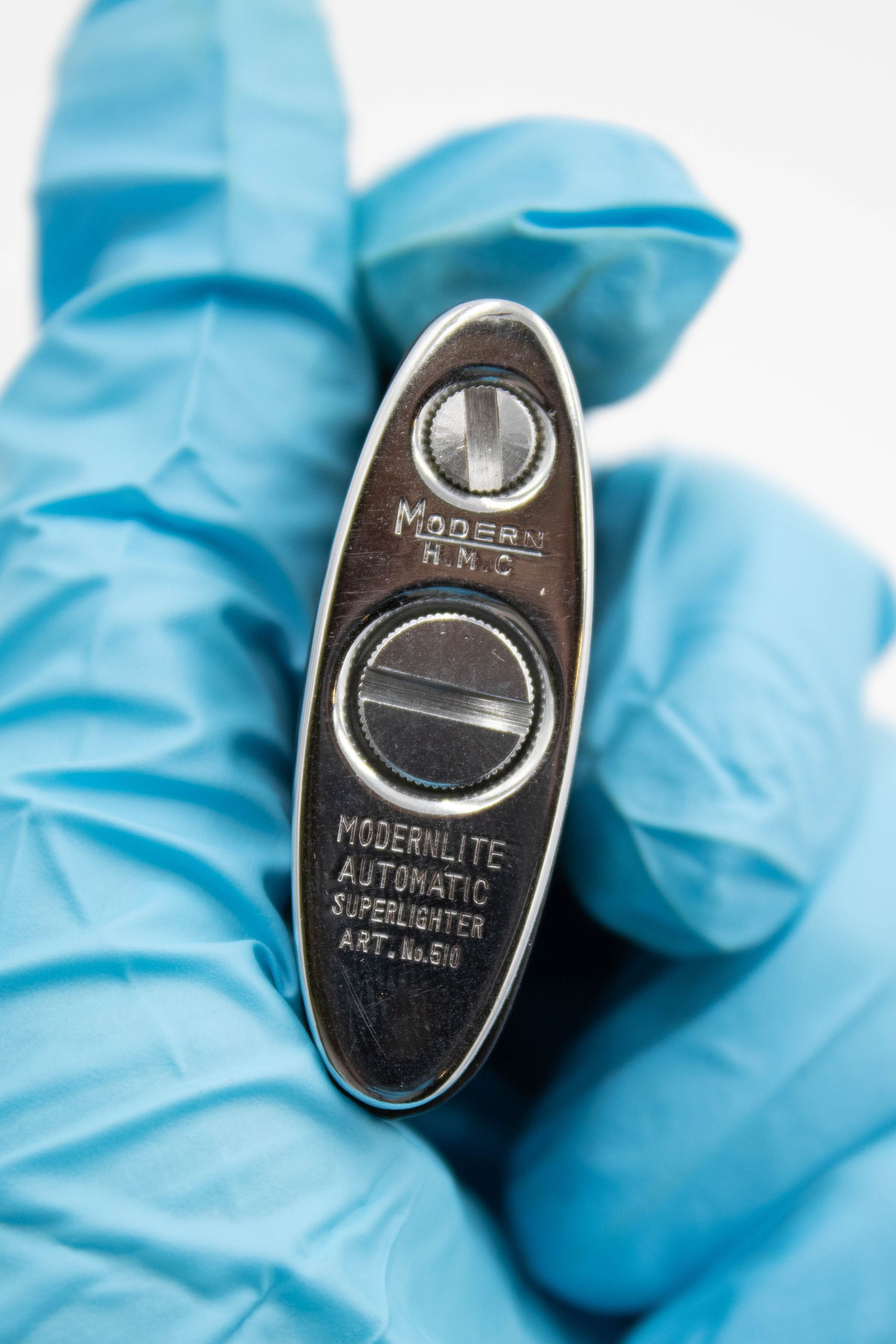 The image shows a cigarette case and lighter set with an oil refinery design, inside a blue-lined case.