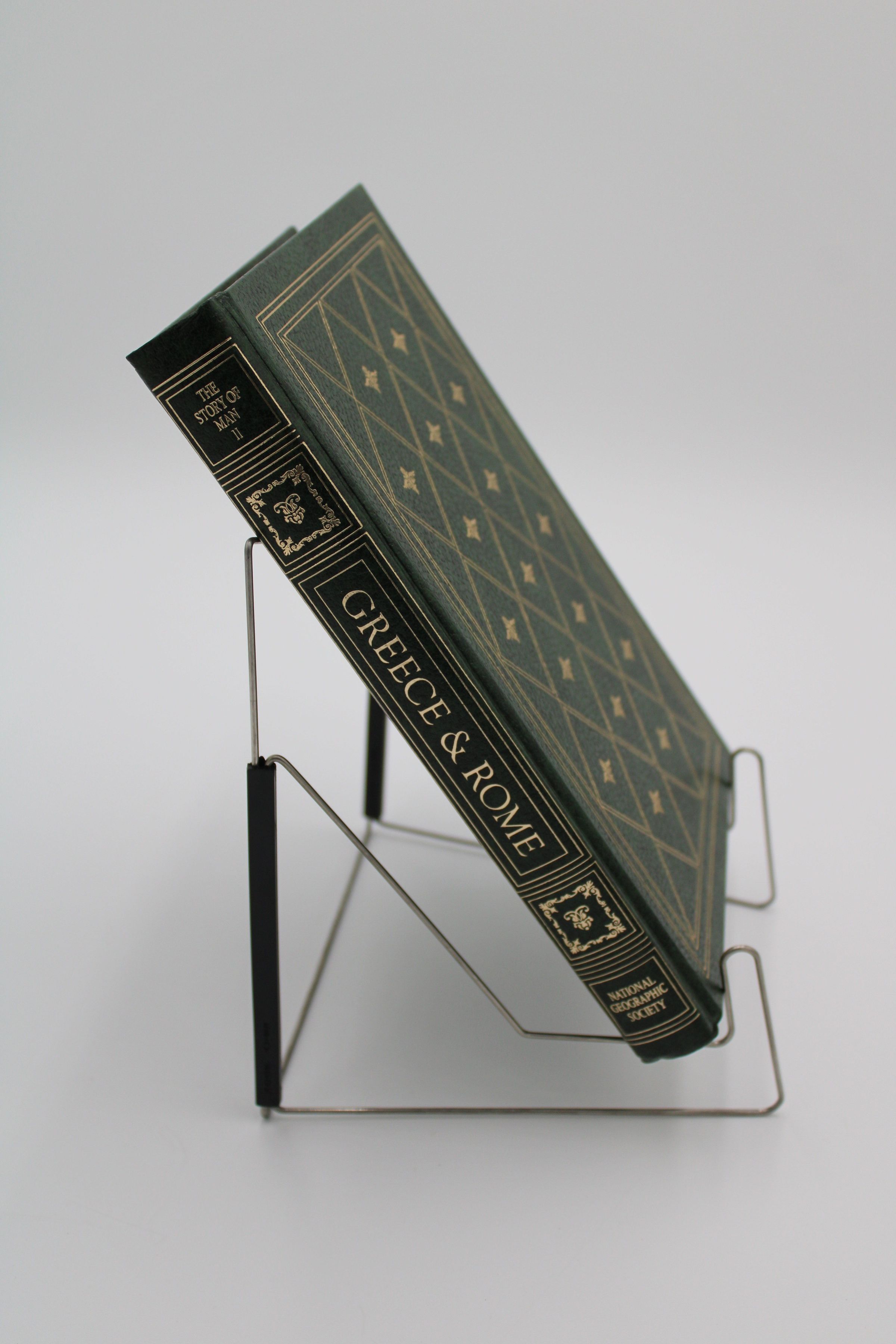 The front cover of “Greece and Rome” is made of green leather and features a repeating diamond pattern. Inside the diamonds are small winged ornamental designs. All of the details are colored gold.