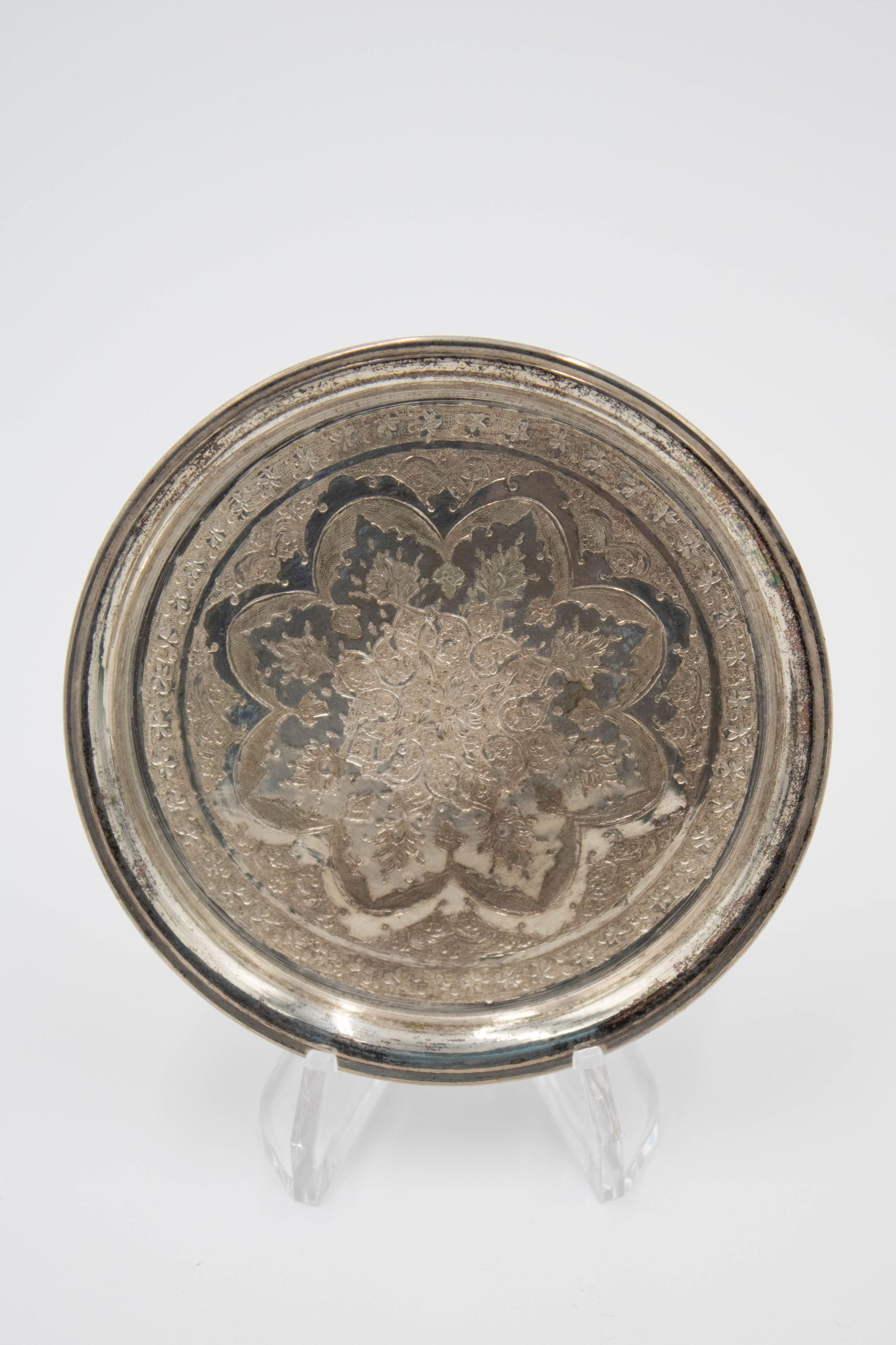 Set of 6 round Persian silver dishes engraved with floral mandala design. The dishes were made in Iran likely during the later 19th and early 20th century.Context