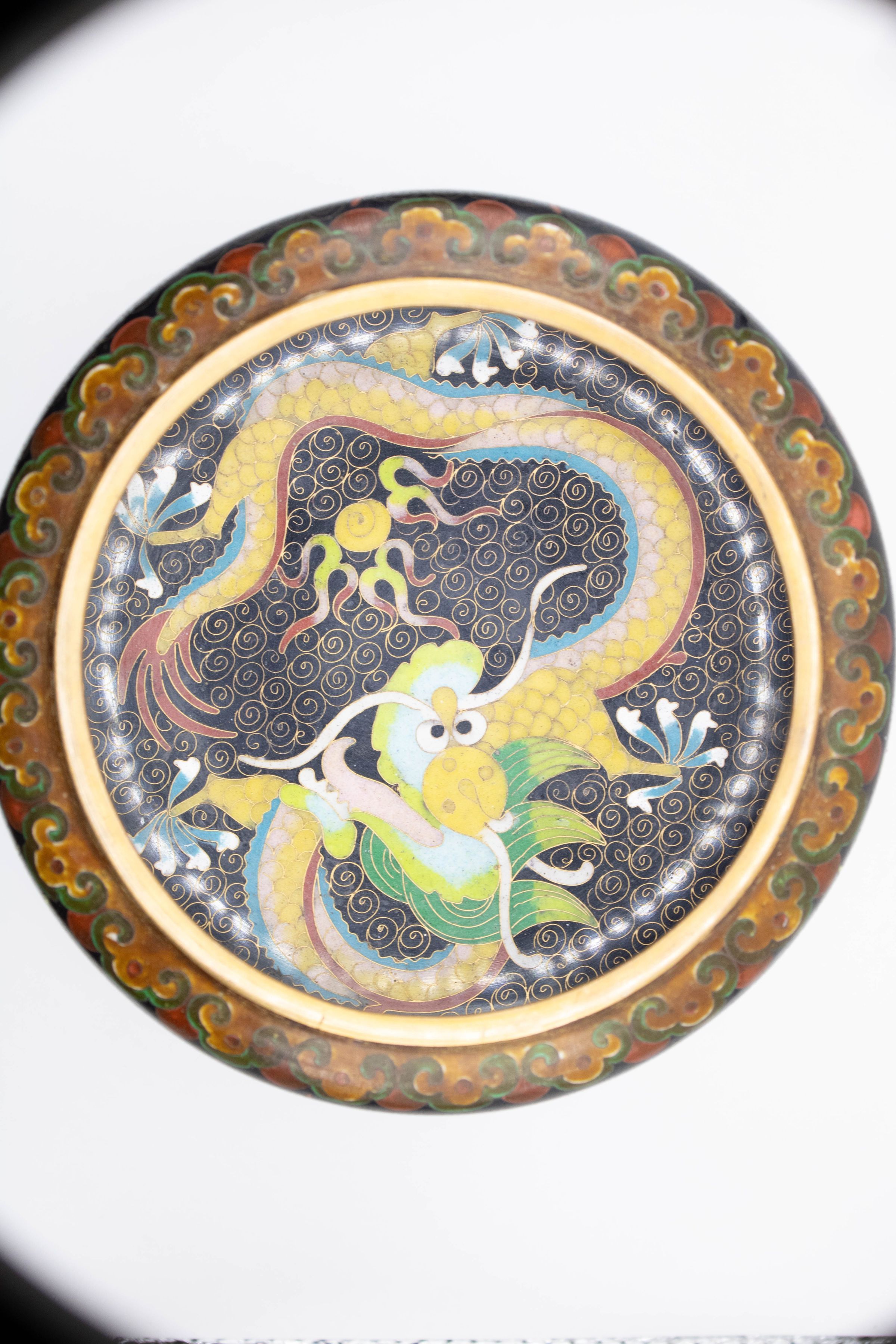 A birds-eye view of the bowl. The top edge and the center inside is visible. The top edge is decorated with swirls. Inside, a golden dragon with big eyes and an open mouth lies.