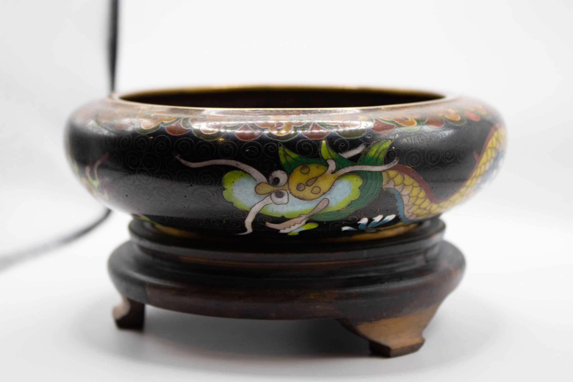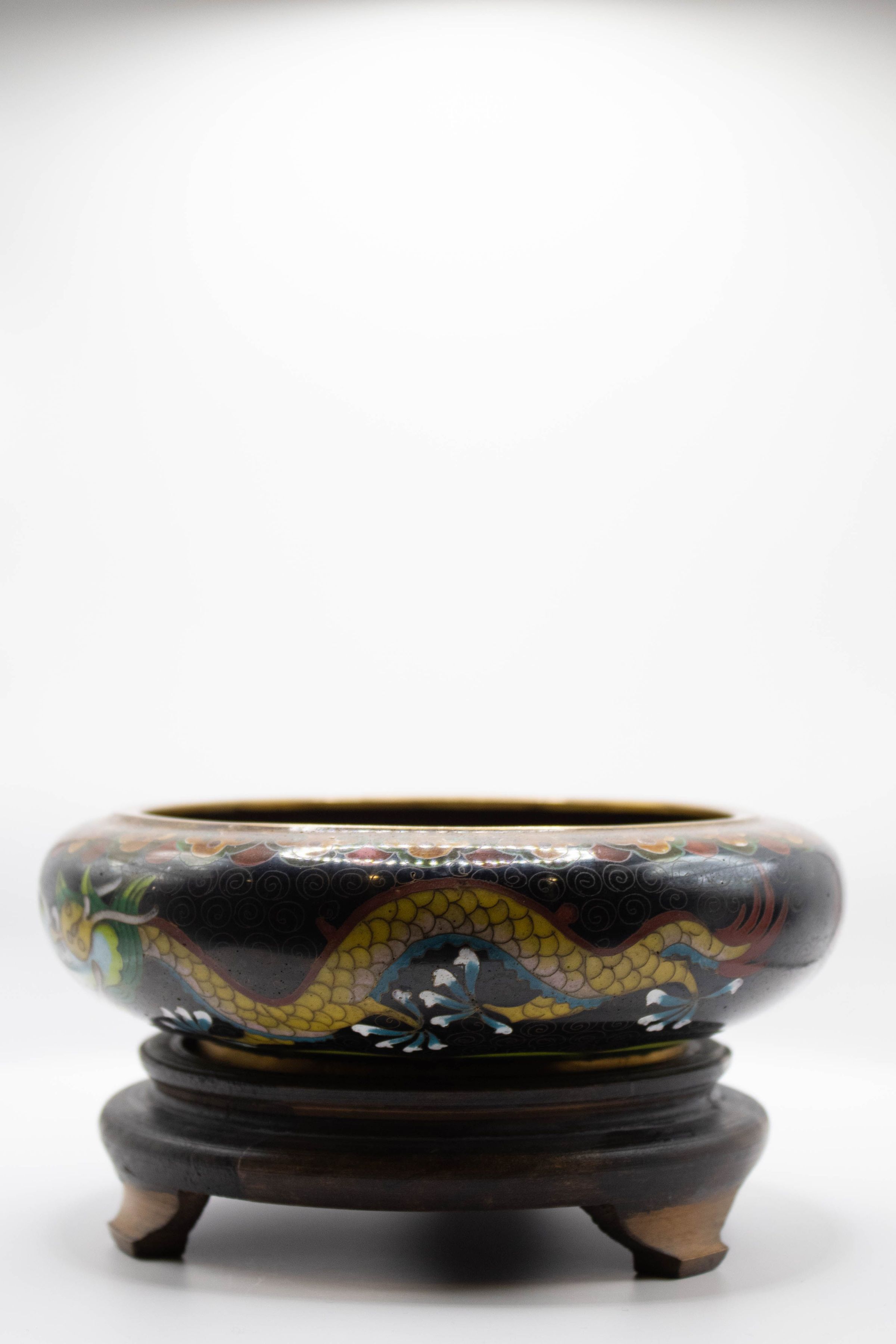 Black Enamel Bowl with Gold Dragon on Wood Stand