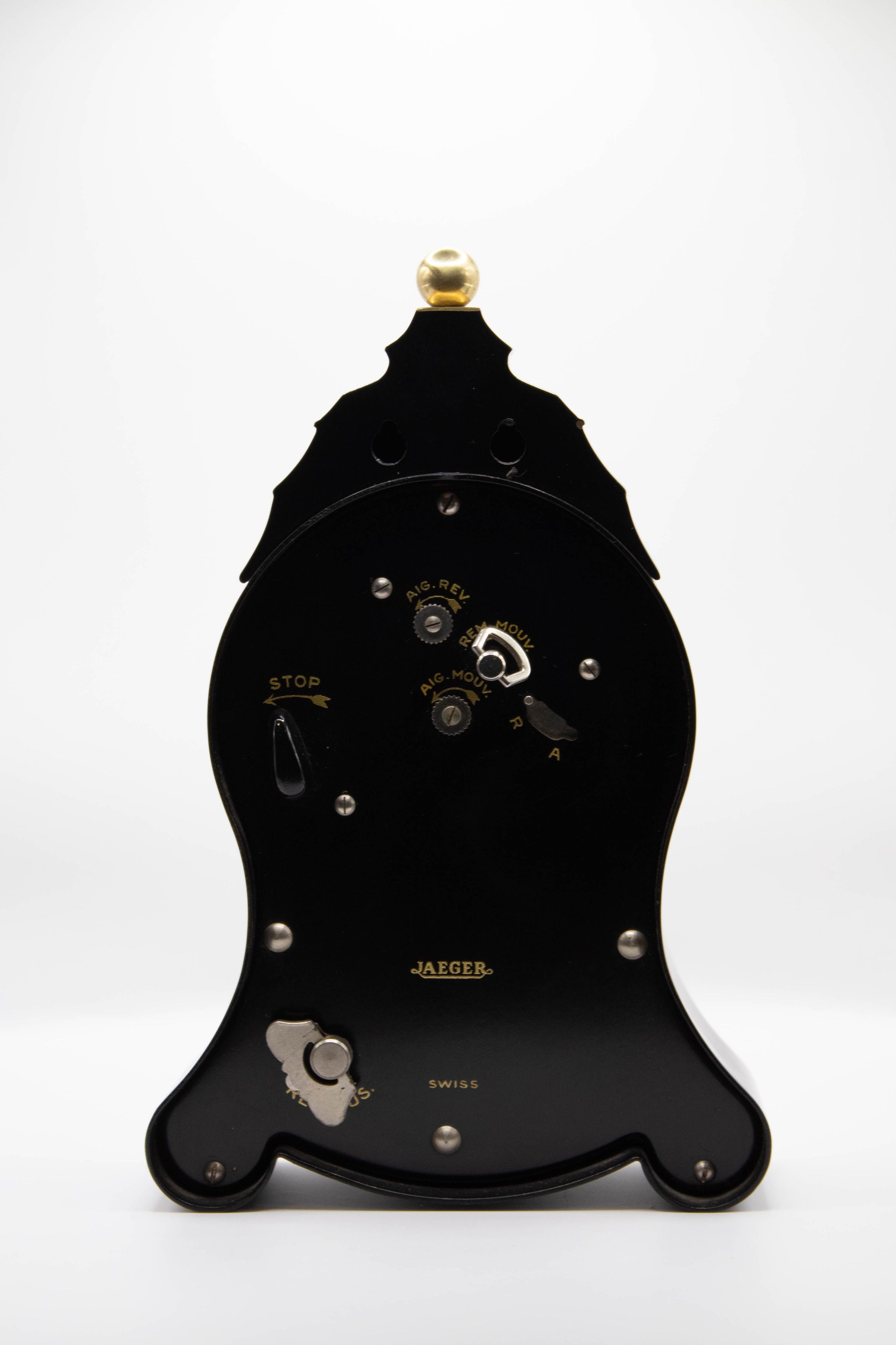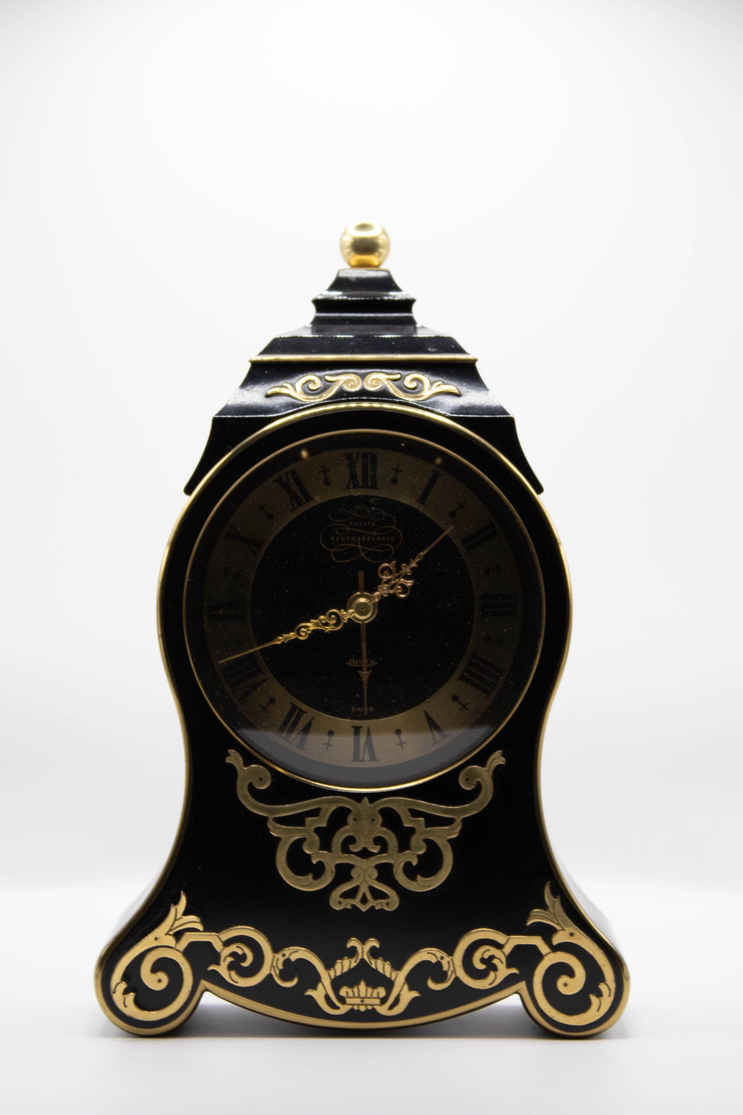 A 5-inch-tall black clock with gold detailing. It has a circular face with a base and feet, and a square-shaped top. The numbers are black Roman numerals, surrounded by gold. The hour and minute hands have swirls closer to the center before they become straight.