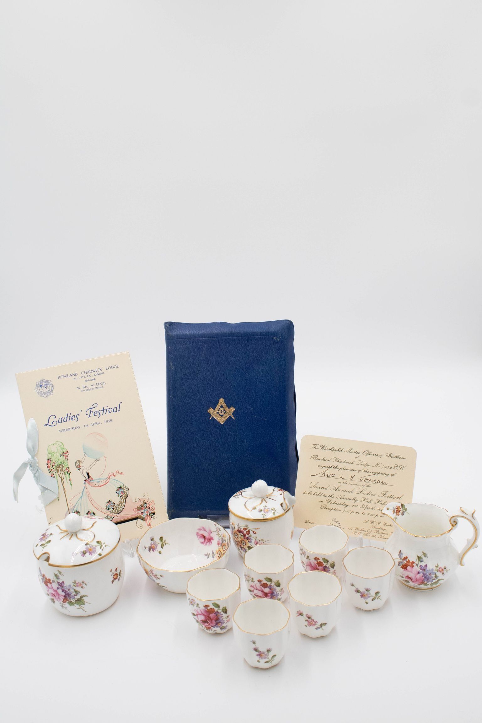 The blue Masonic Presentation Bible and Royal Crown Derby porcelain were gifted to Mrs. Jordan at the Second Annual Ladies’ Festival of the Rowland Chadwick Masonic Lodge No. 7472 E.C. on April 1, 1959, when she was Guest of Honor. The event was held in the Assembly Hall of the Houbara Club, a social/sports club owned by the Kuwait Oil Company. The blue Freemason Presentation Bible is traditionally given to members of the Temple after their completion of the Master Mason degree; however, this one was presented to Mrs. Jordan, showing her importance in the community.
