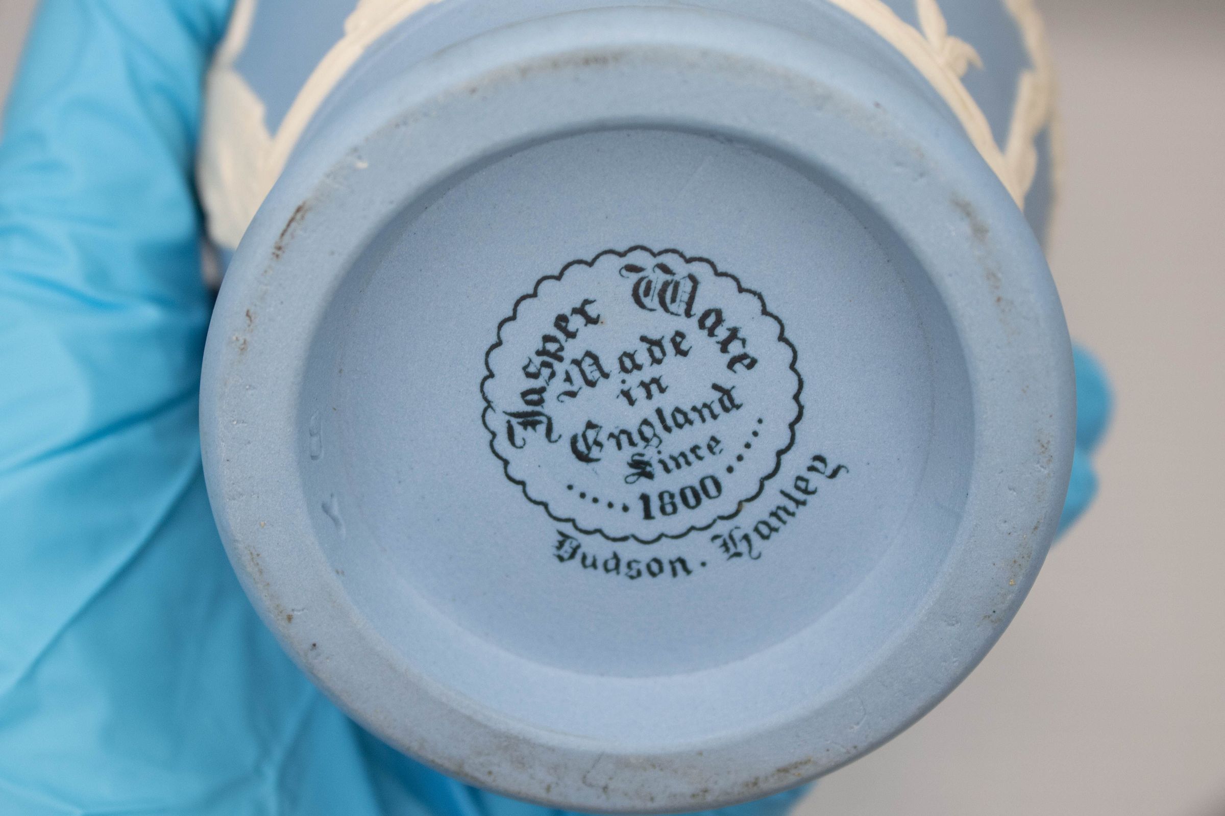 Wedgwood blue (Jasperware) pitcher with white details. Pitcher has a small flower under the handle.Ethnography