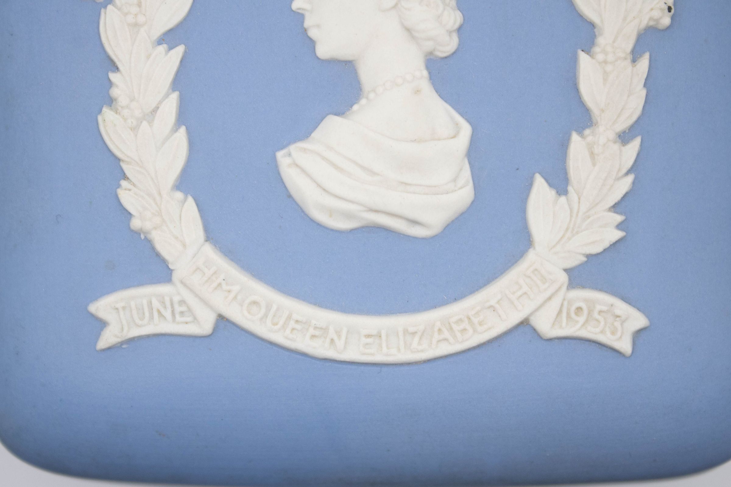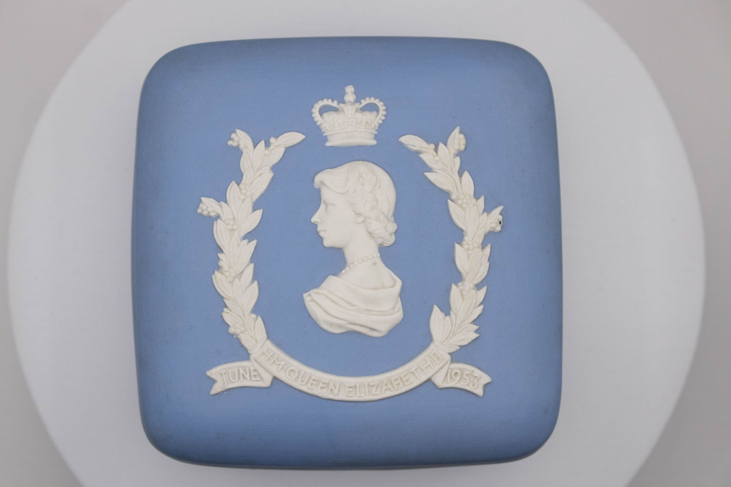 Wedgwood blue (Jasperware) commemorative box with cover of Queen Elizabeth II.Context