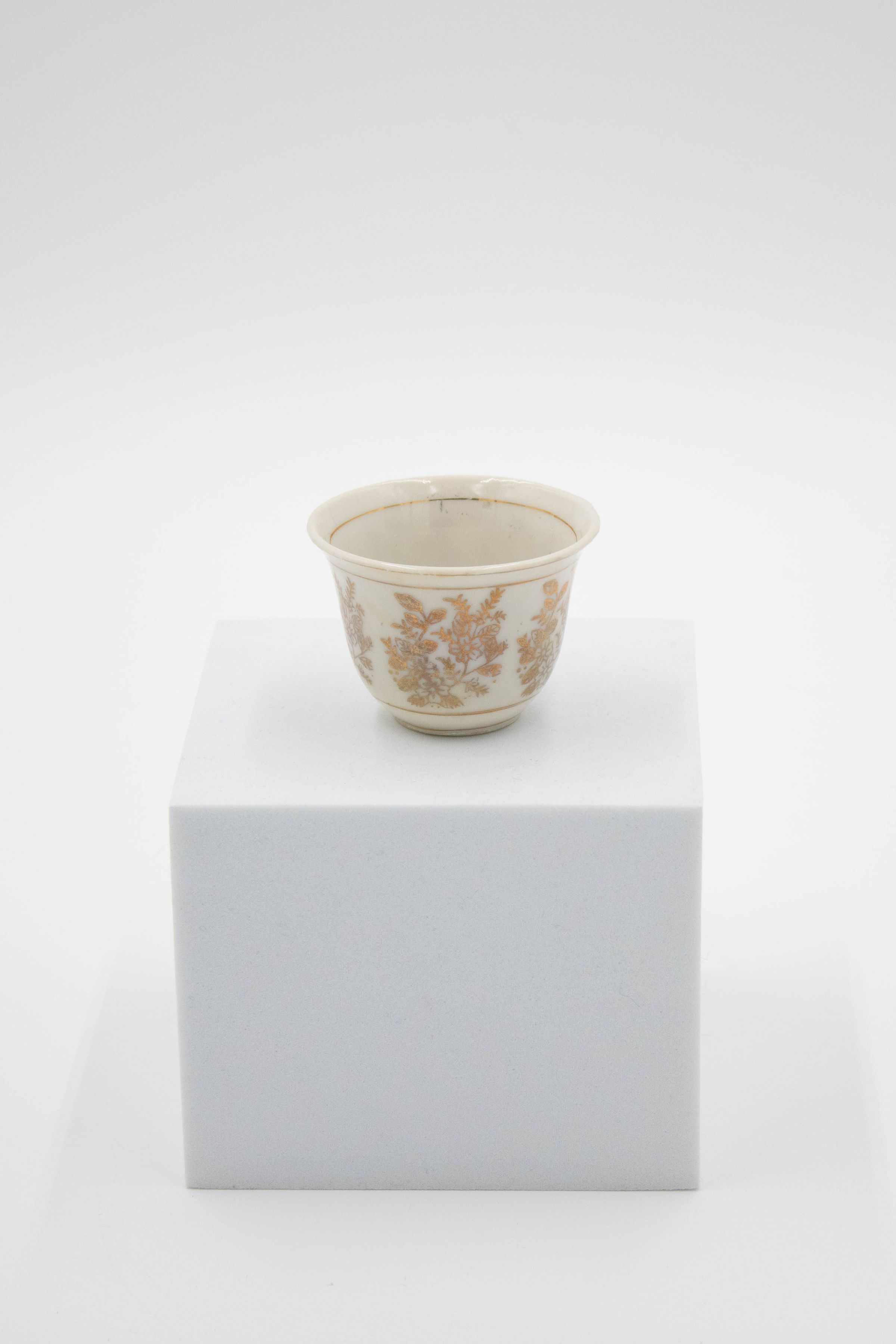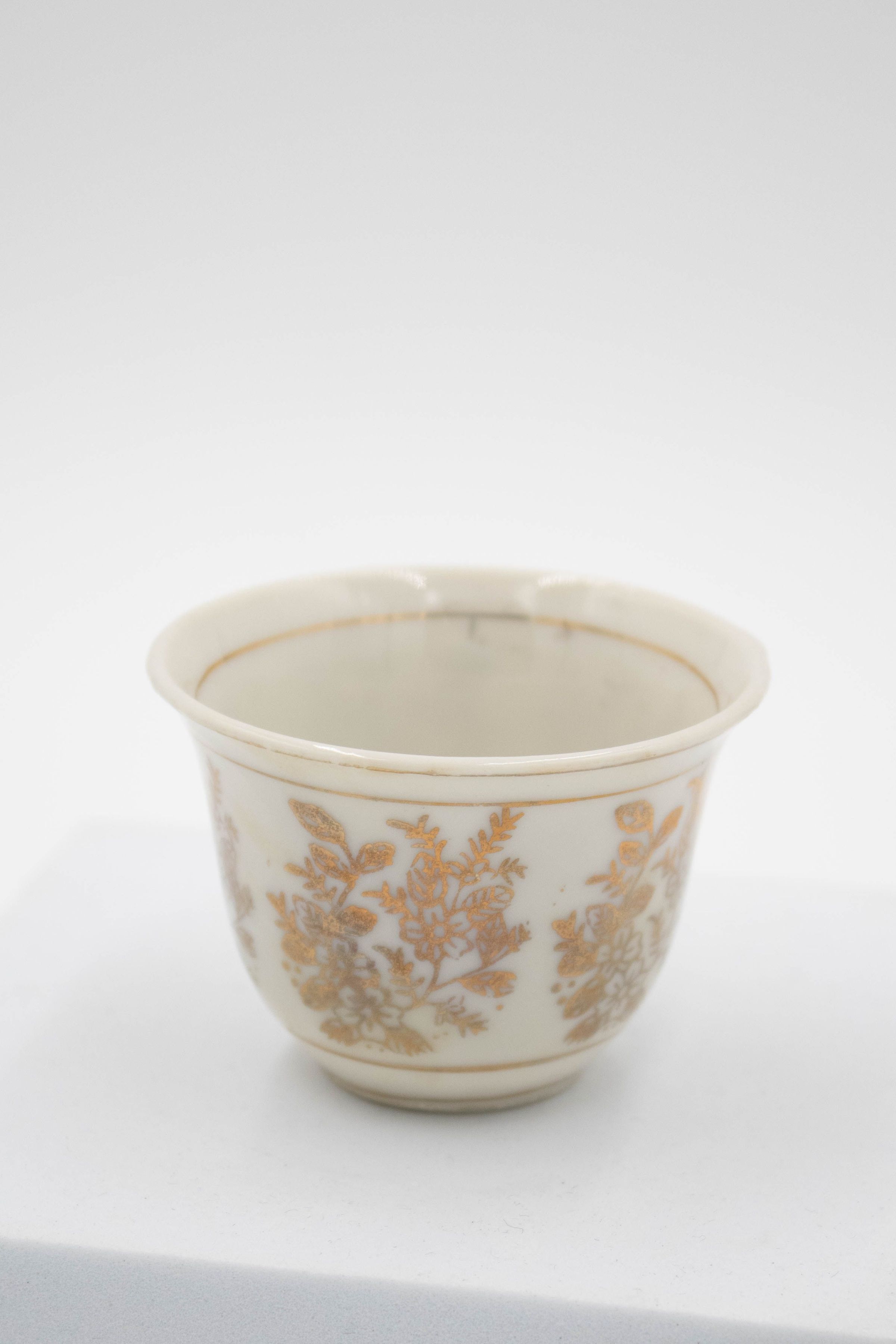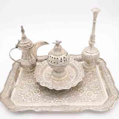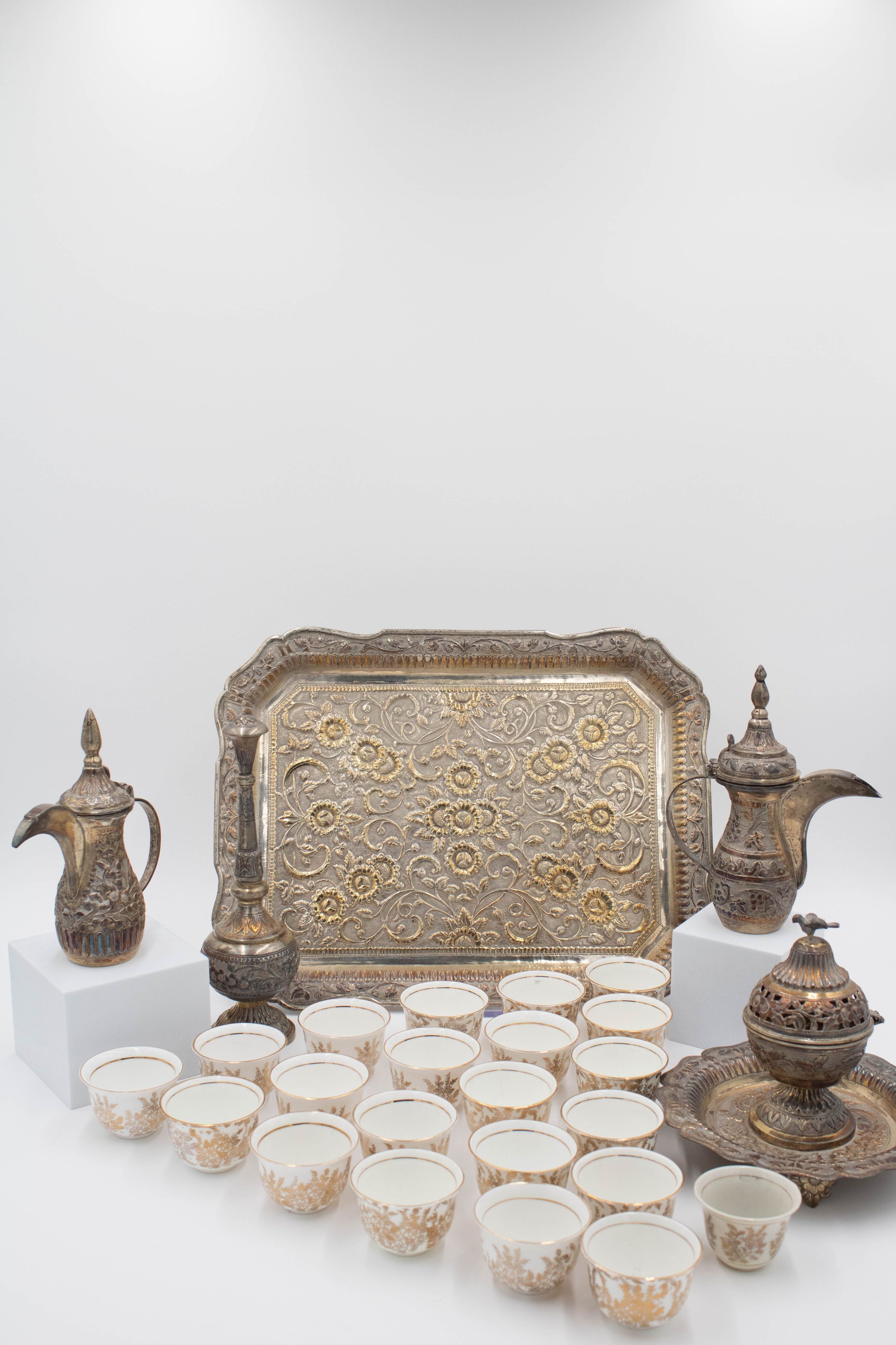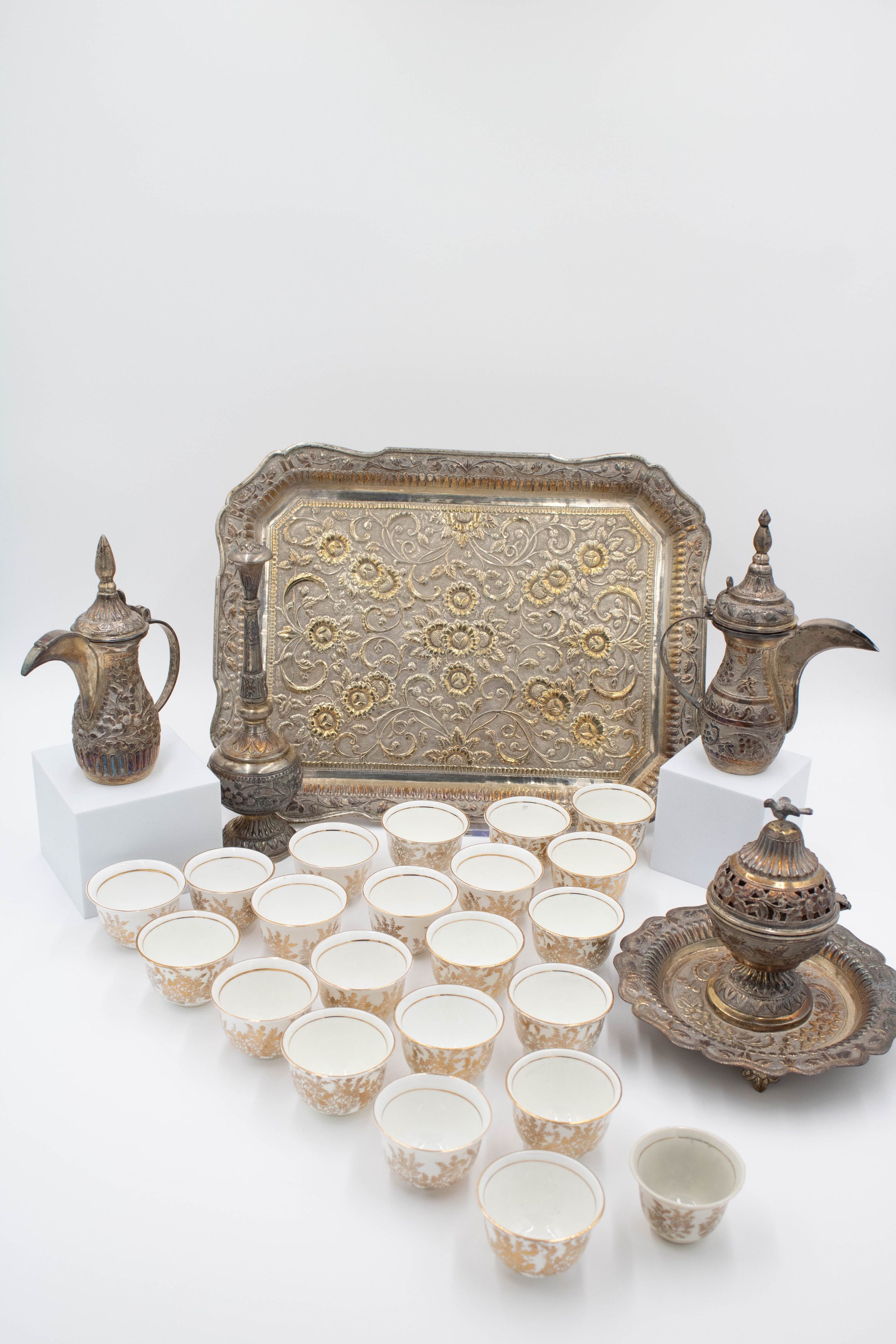 28-piece porcelain, silver, and gold coffee service. It contains one large silver coffee pot, one small silver coffee pot, one large rectangular silver tray, one small round footed tray with a silver incense burner, one tall rosewater sprinkler, and twenty-three bone China and gold coffee cups. The small cups were made by Colclough Genuine Bone China in England. Colclough China was founded in 1890 and produced tea and dinnerware that were highly sought after. The company was bought by Royal Doulton in the 1970s and stopped manufacturing items in 1996.Context