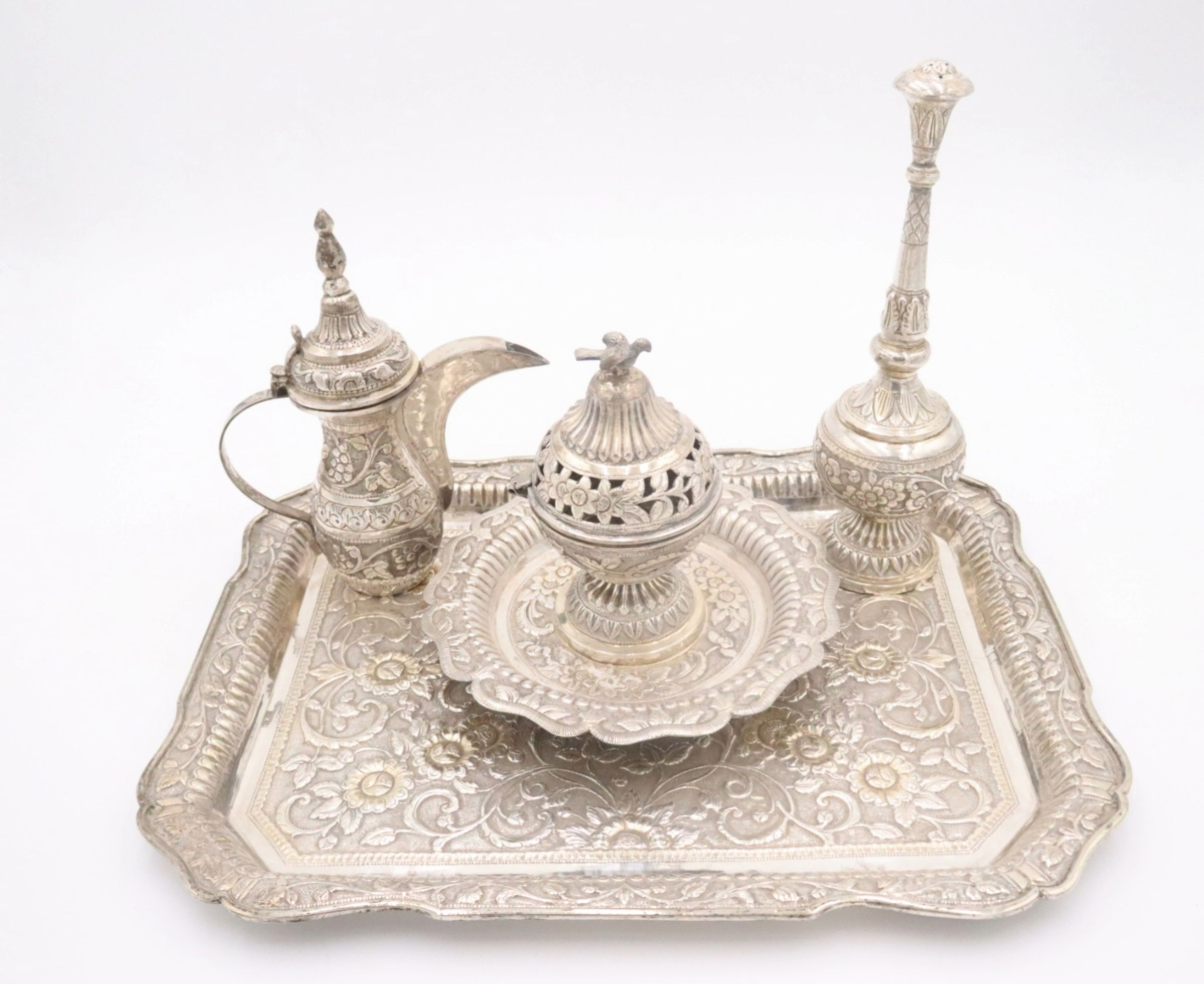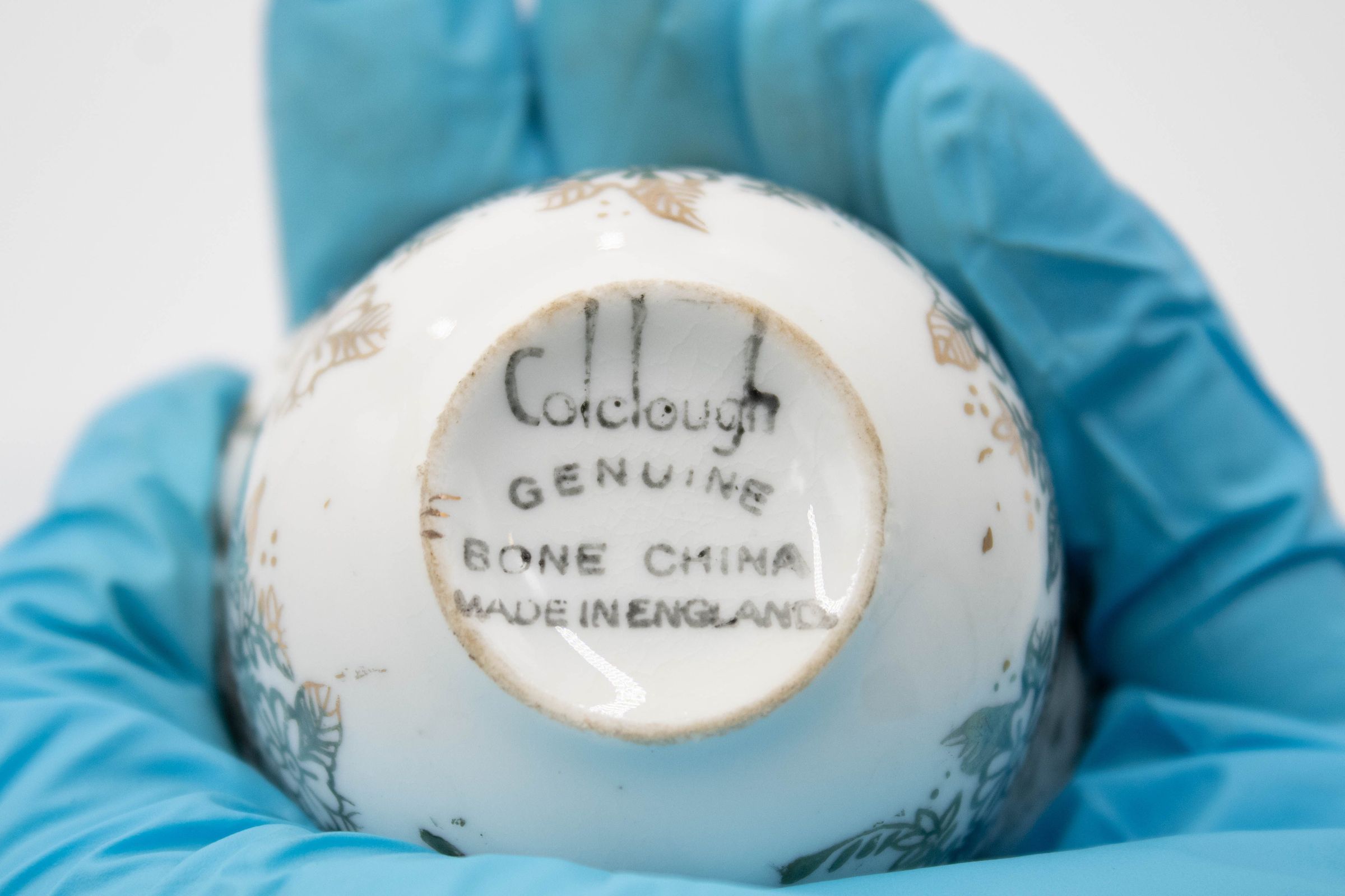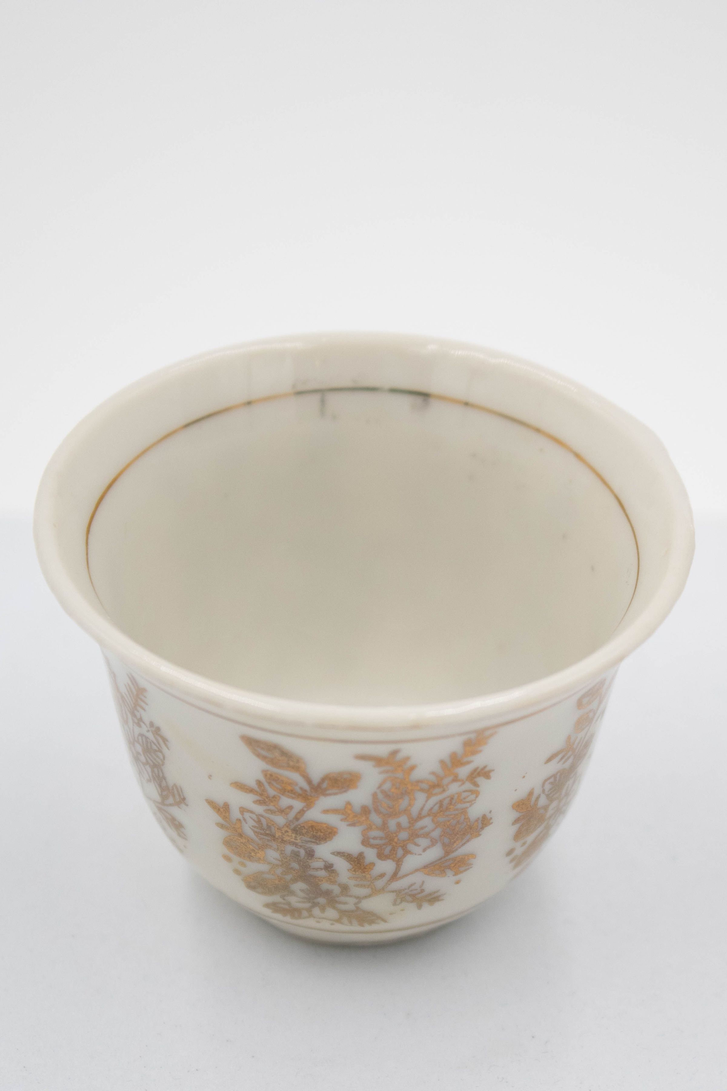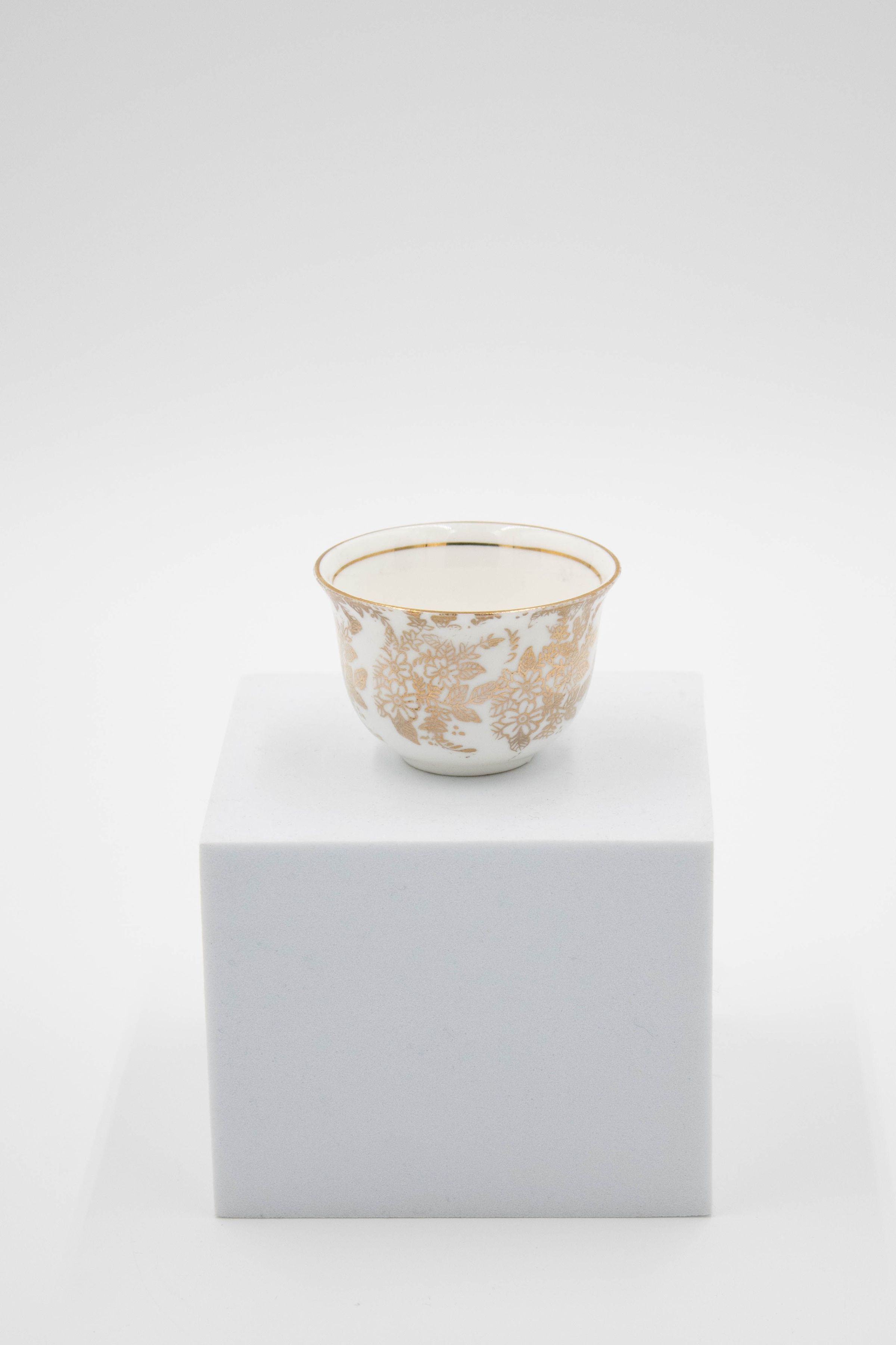 28-piece porcelain, silver, and gold coffee service. It contains one large silver coffee pot, one small silver coffee pot, one large rectangular silver tray, one small round footed tray with a silver incense burner, one tall rosewater sprinkler, and twenty-three bone China and gold coffee cups. The small cups were made by Colclough Genuine Bone China in England. Colclough China was founded in 1890 and produced tea and dinnerware that were highly sought after. The company was bought by Royal Doulton in the 1970s and stopped manufacturing items in 1996.Context