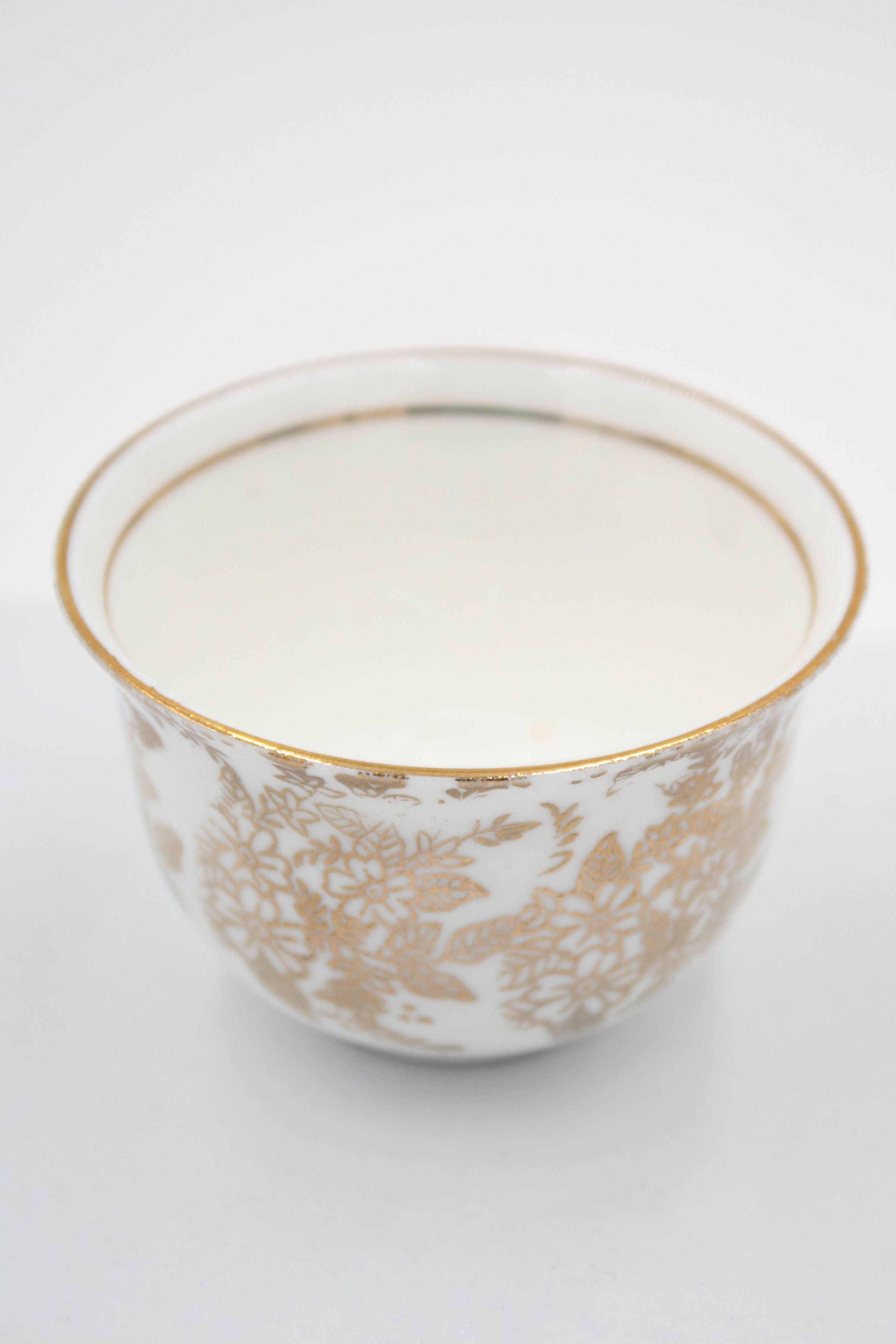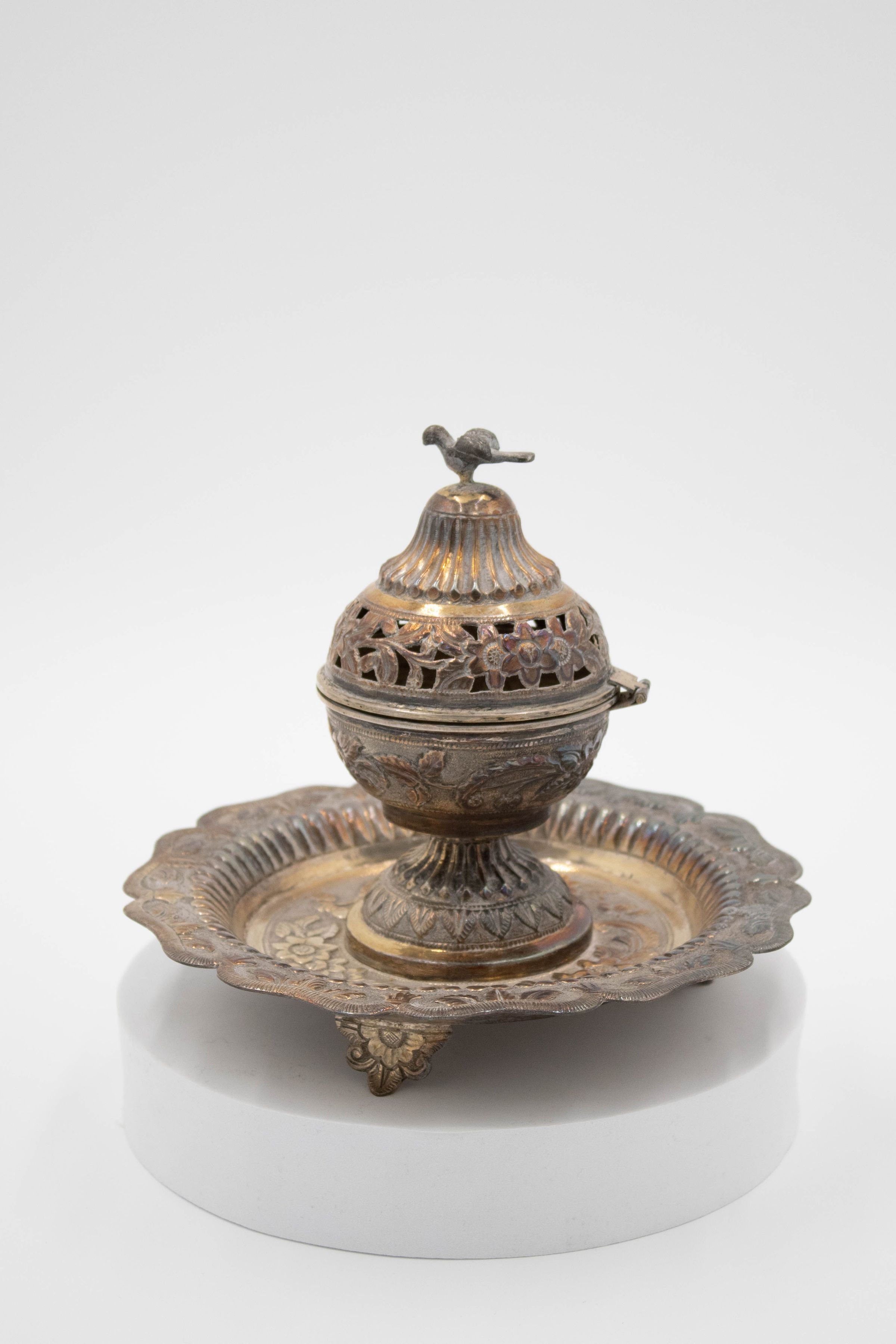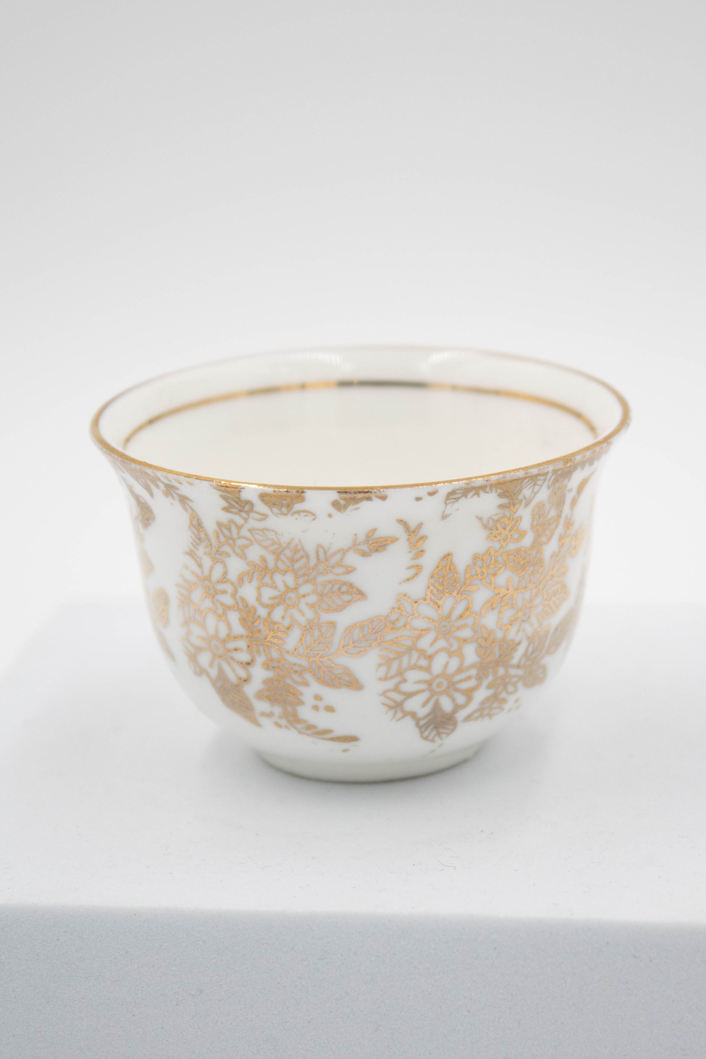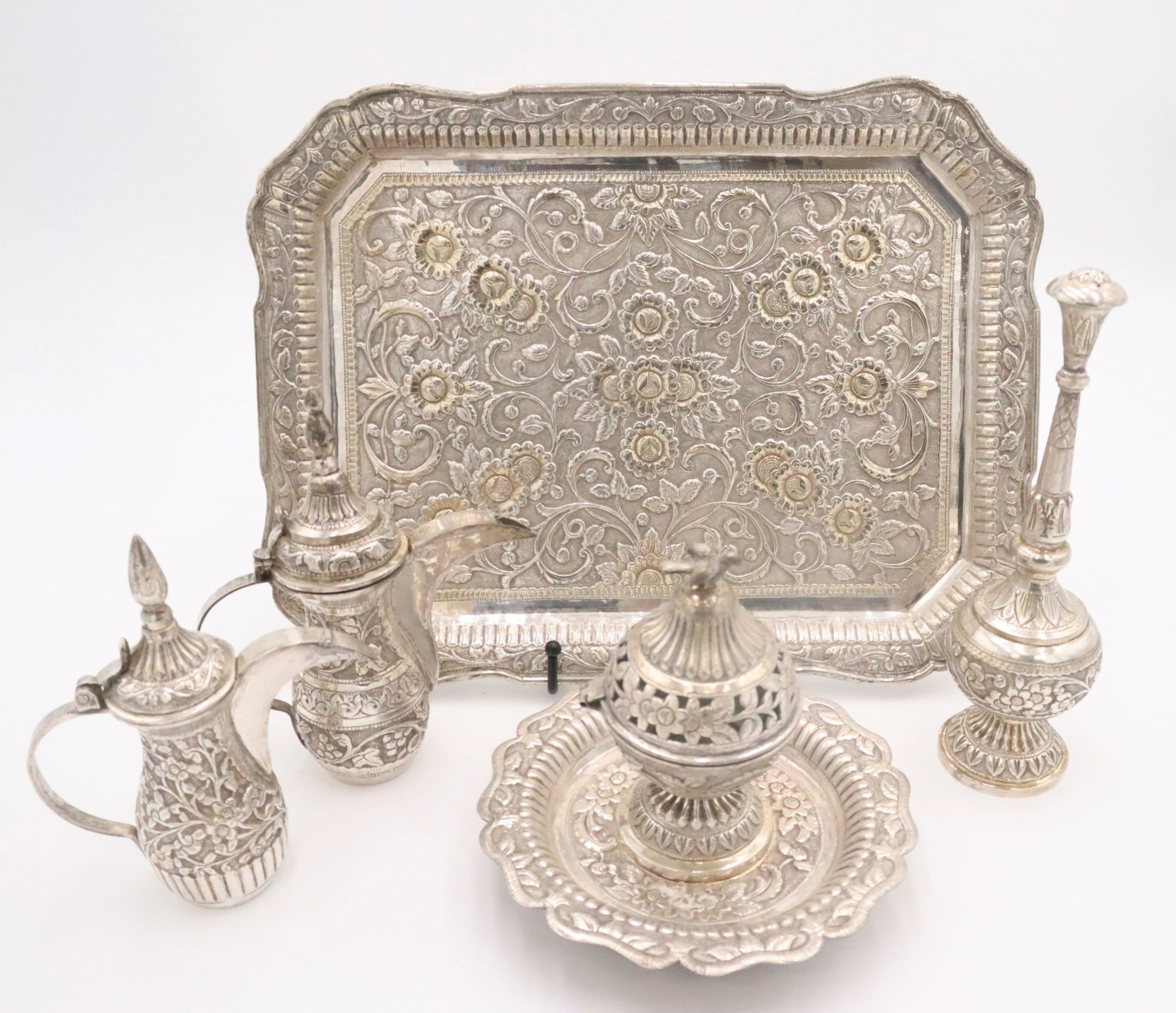 28-piece porcelain, silver, and gold coffee service. It contains one large silver coffee pot, one small silver coffee pot, one large rectangular silver tray, one small round footed tray with a silver incense burner, one tall rosewater sprinkler, and twenty-three bone China and gold coffee cups. The small cups were made by Colclough Genuine Bone China in England. Colclough China was founded in 1890 and produced tea and dinnerware that were highly sought after. The company was bought by Royal Doulton in the 1970s and stopped manufacturing items in 1996.Context