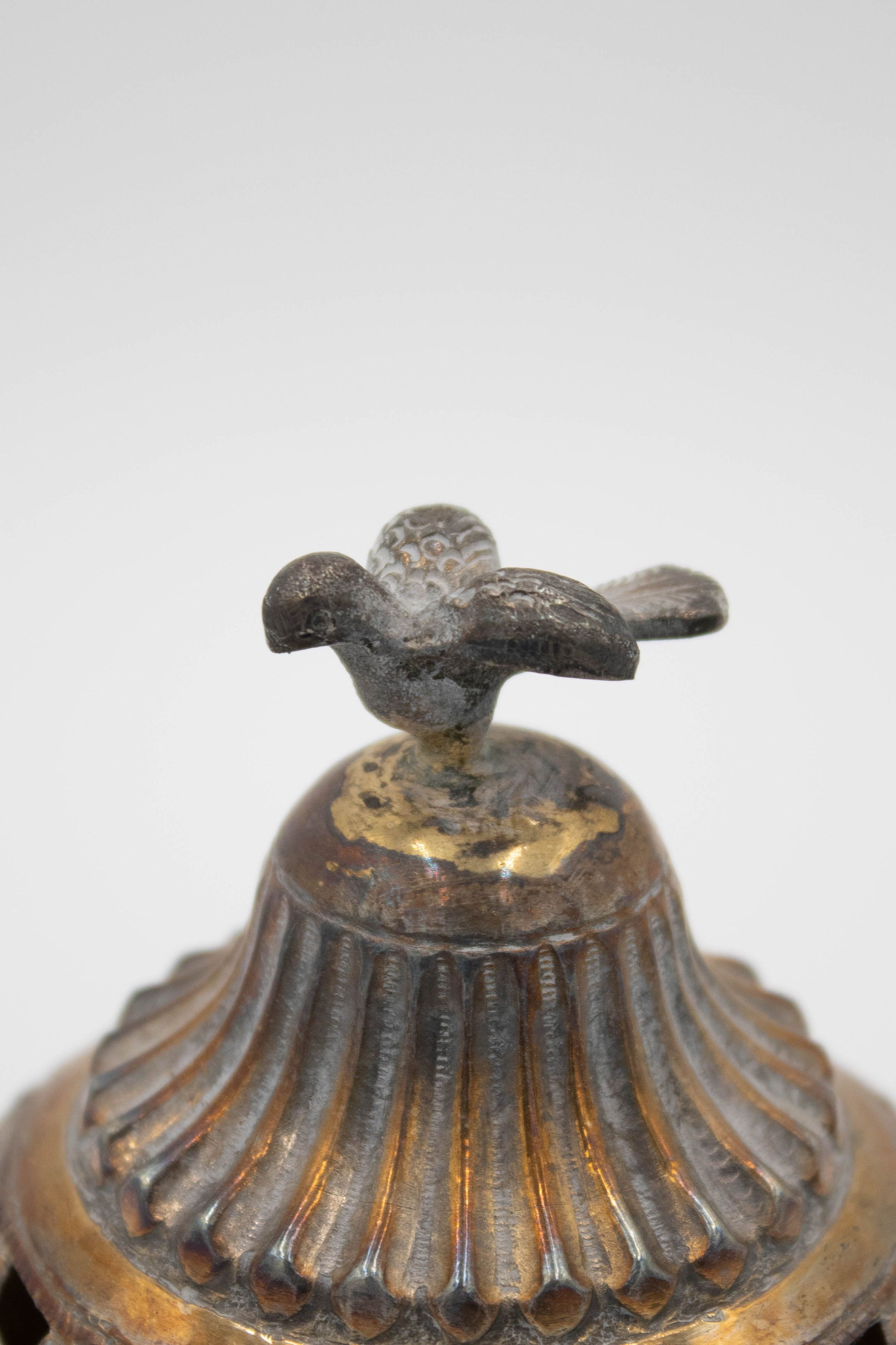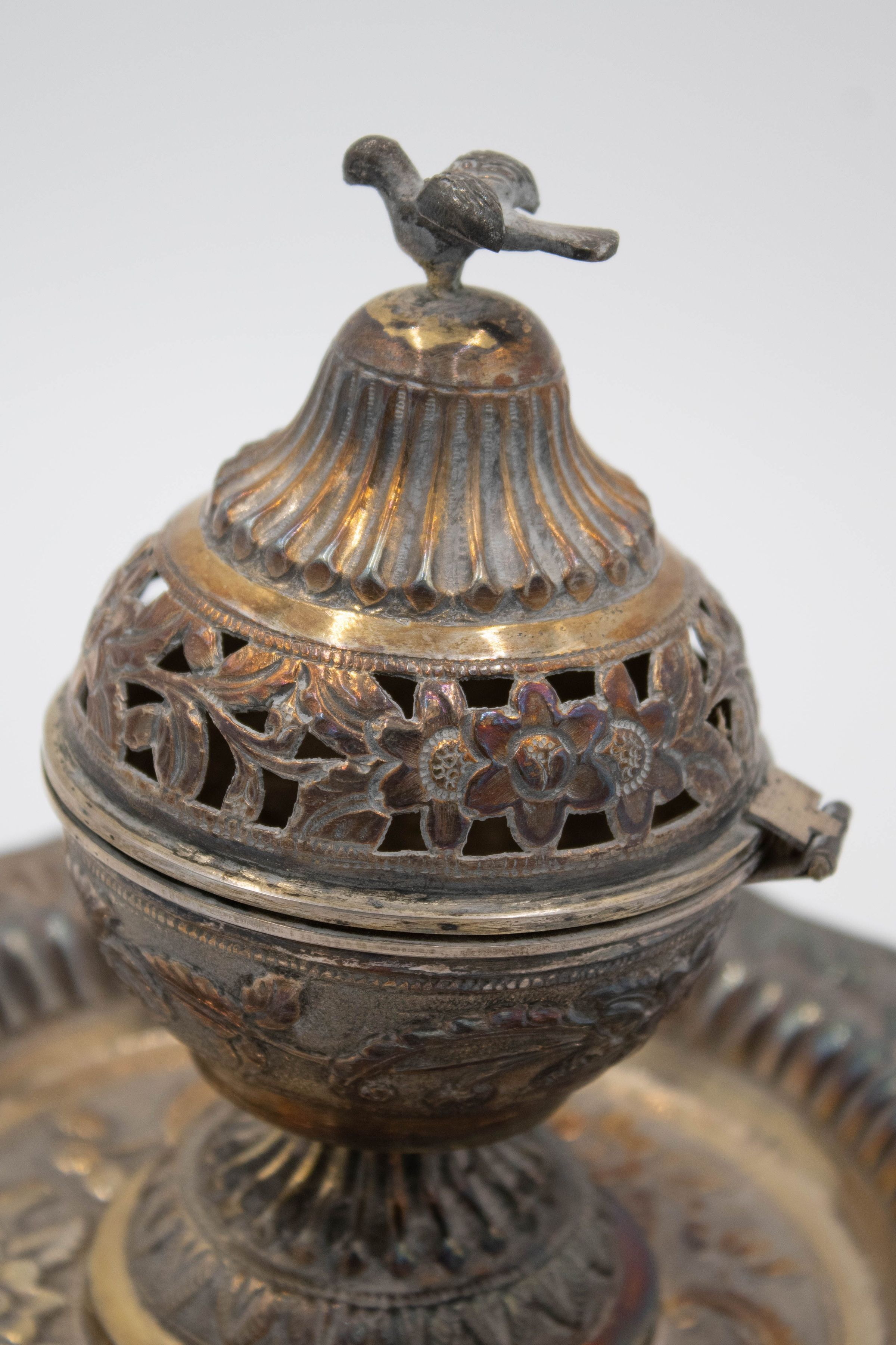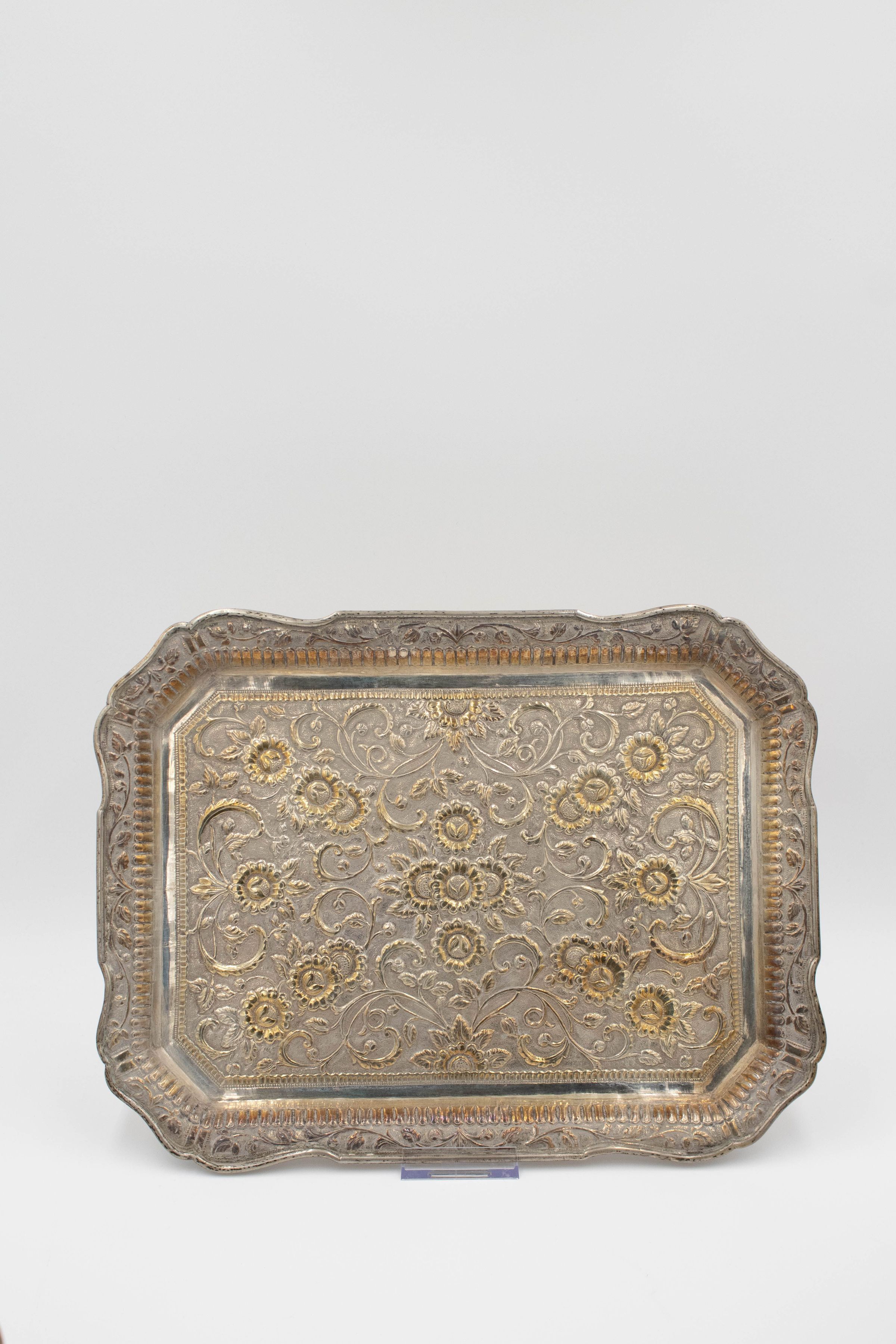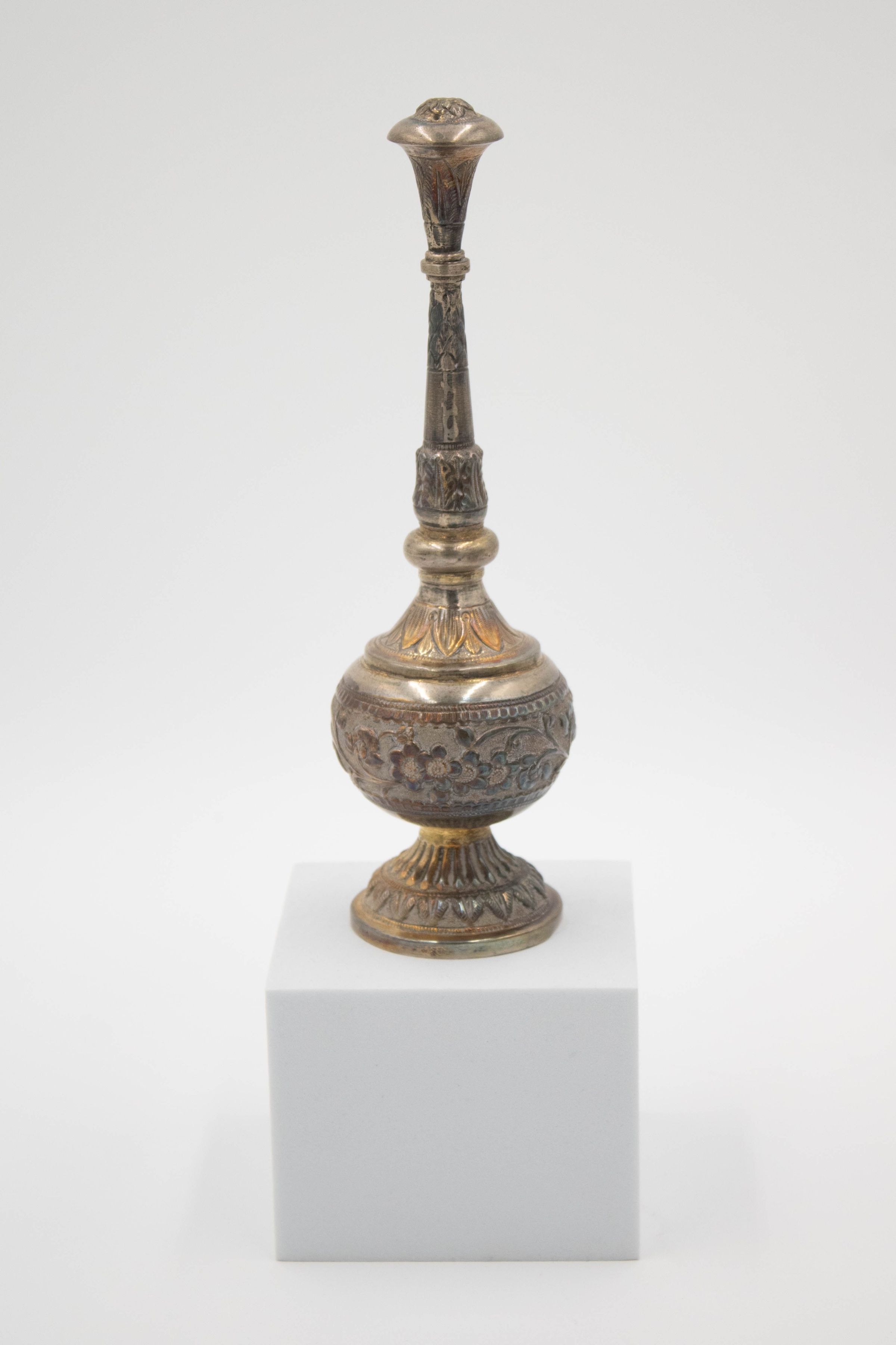 28-piece porcelain, silver, and gold coffee service. It contains one large silver coffee pot, one small silver coffee pot, one large rectangular silver tray, one small round footed tray with a silver incense burner, one tall rosewater sprinkler, and twenty-three bone China and gold coffee cups. The small cups were made by Colclough Genuine Bone China in England. Colclough China was founded in 1890 and produced tea and dinnerware that were highly sought after. The company was bought by Royal Doulton in the 1970s and stopped manufacturing items in 1996.Context