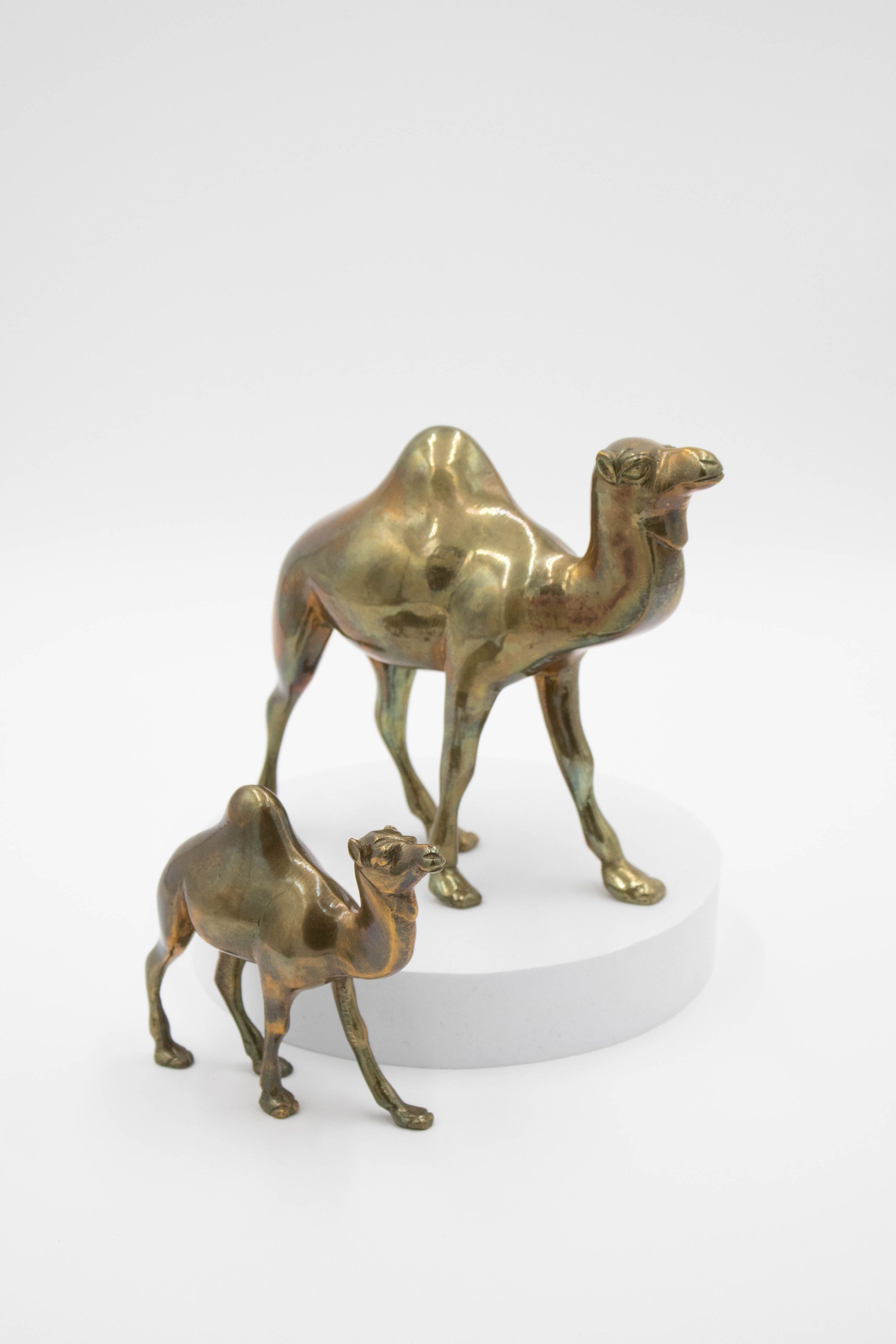One large and one small brass camel. The larger camel is 8 inches tall.