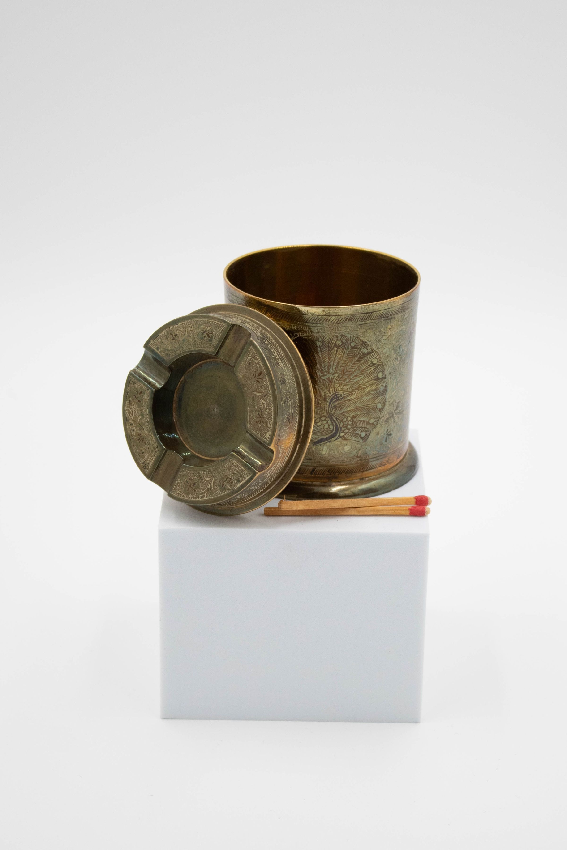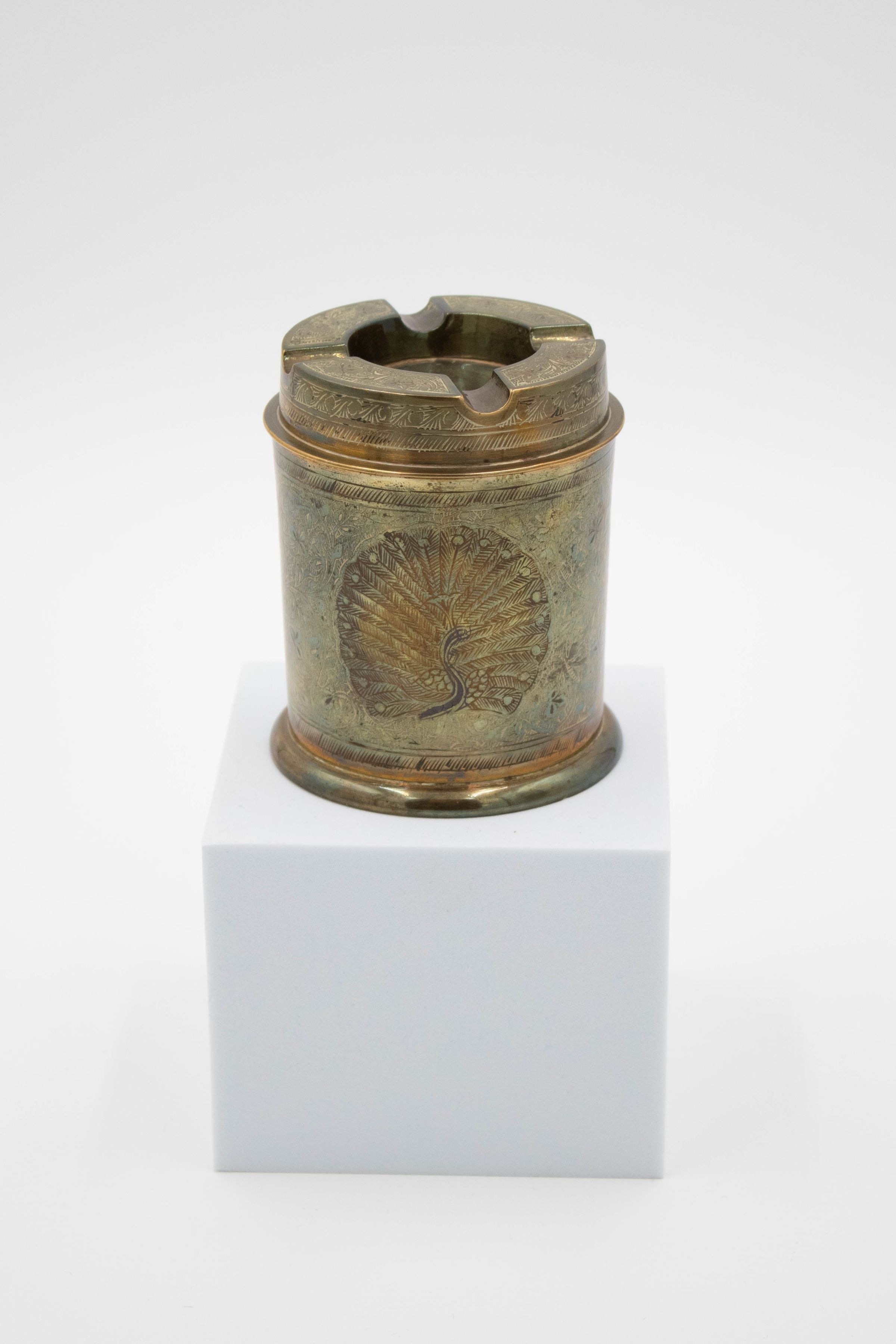 A tall cylindrical match holder with an ashtray as a lid. The holder has a large peacock on the front.