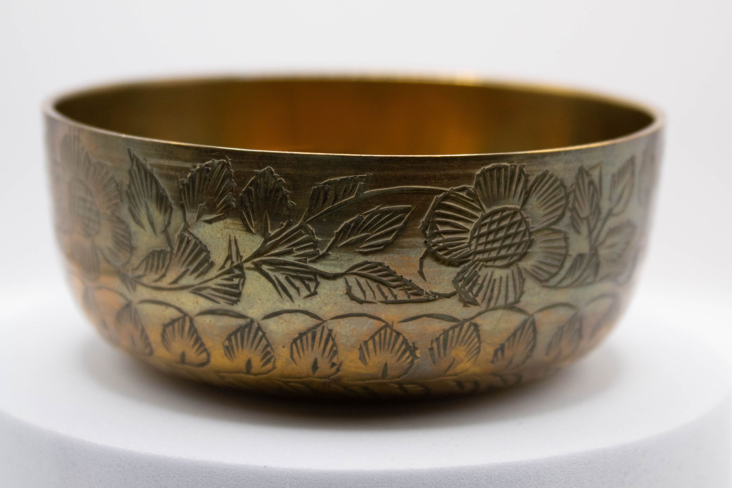 A small bowl with engraved flowers and leaves.