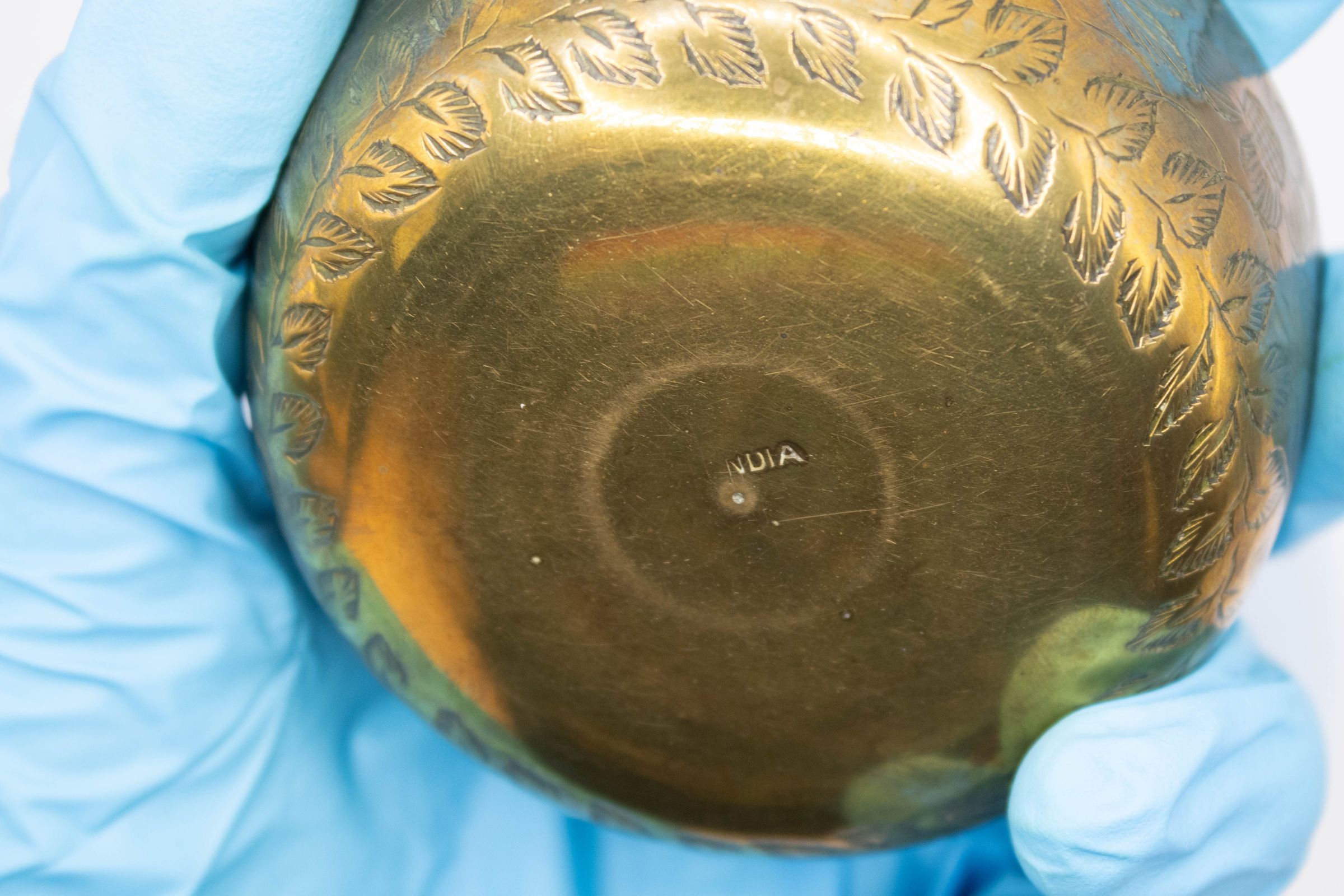 Brass finger bowl with engraved floral and leaf design