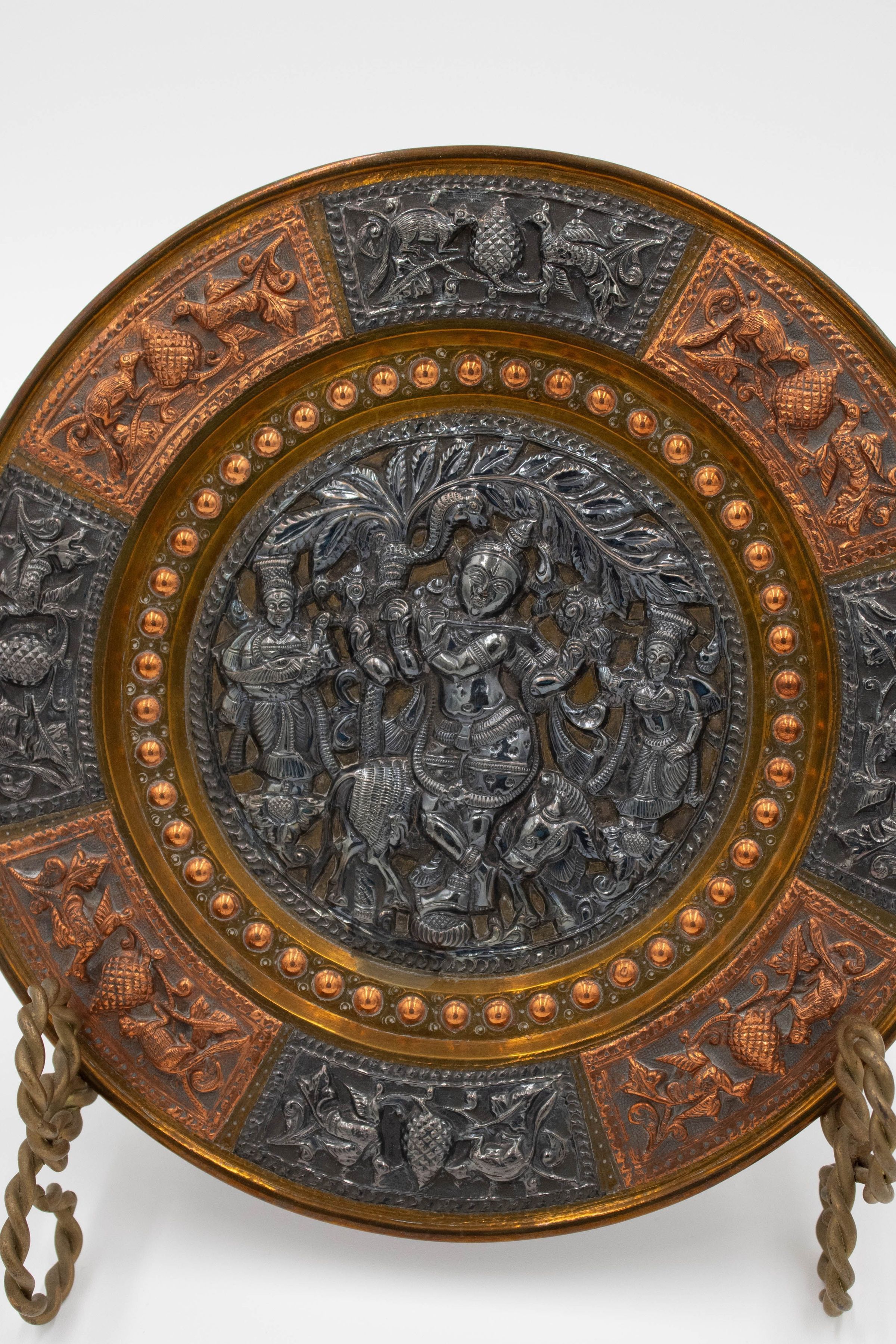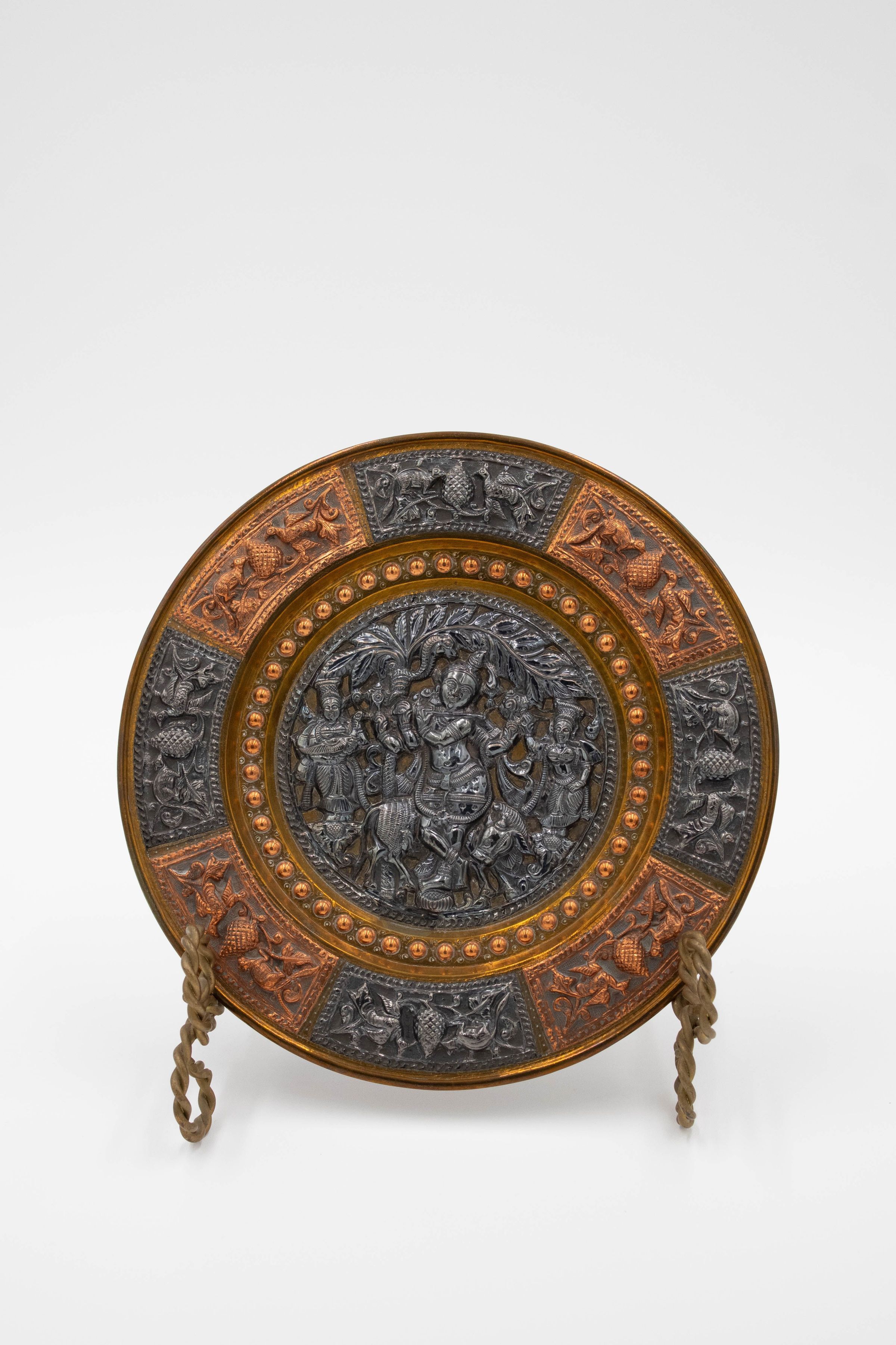 A brass orange and black plate. The rim is split into 8 alternating black and orange sections. Each rim section features a relief of two birds eating. The center of the plate is solid black with a relief of Vishnu, a cow and other people.
