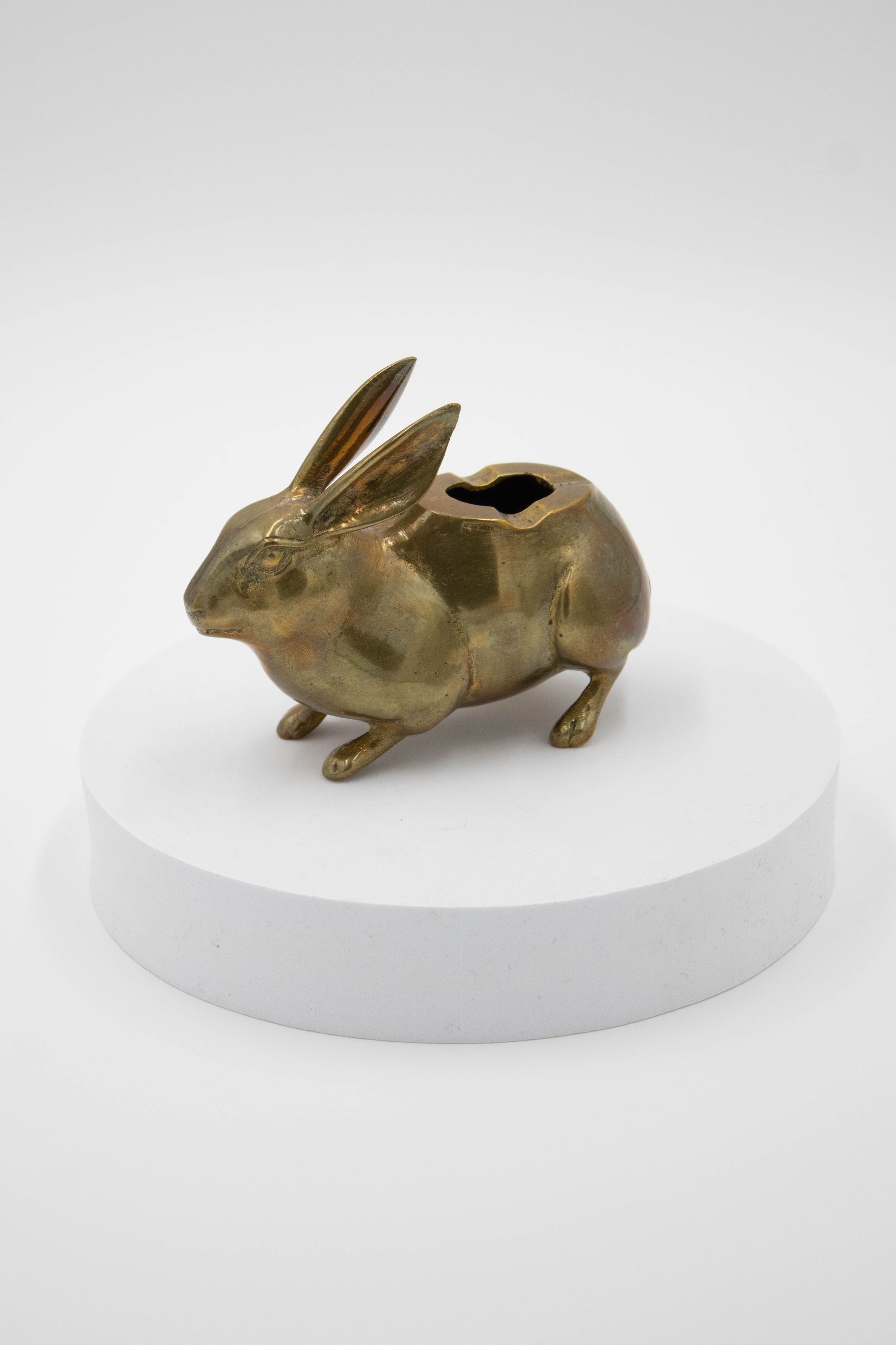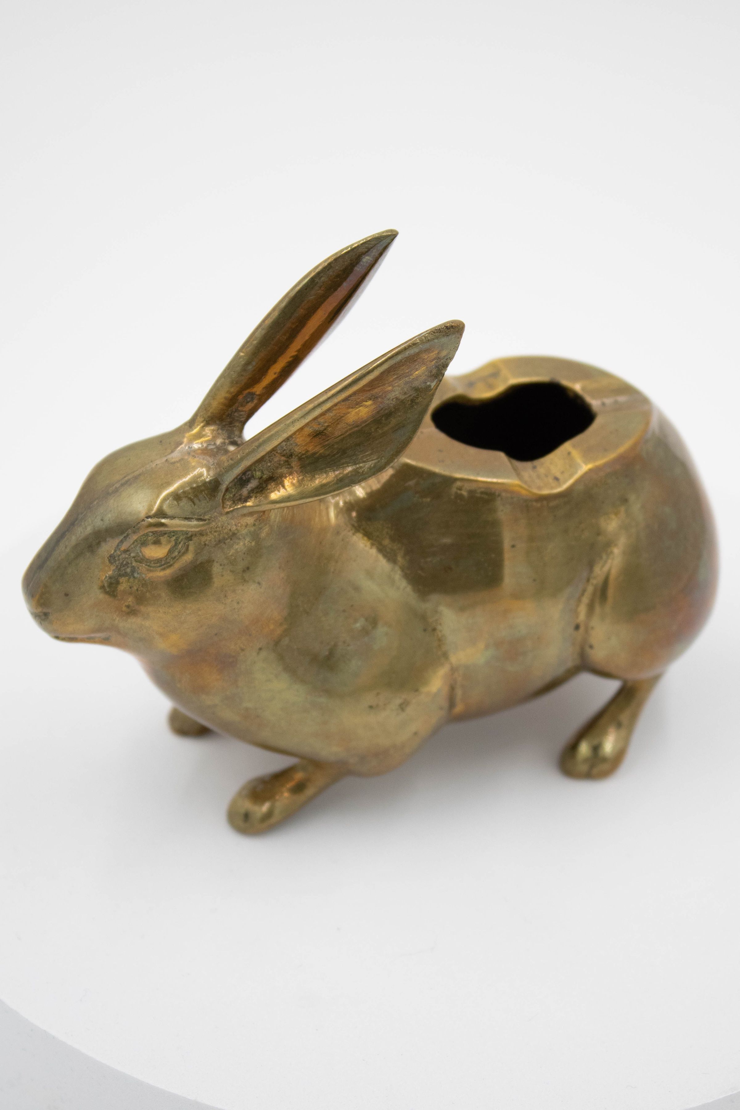 A realistic, miniature rabbit ashtray. It is brass with an opening in its back and divots to hold a cigarette. The ashtray is 5 inches long.